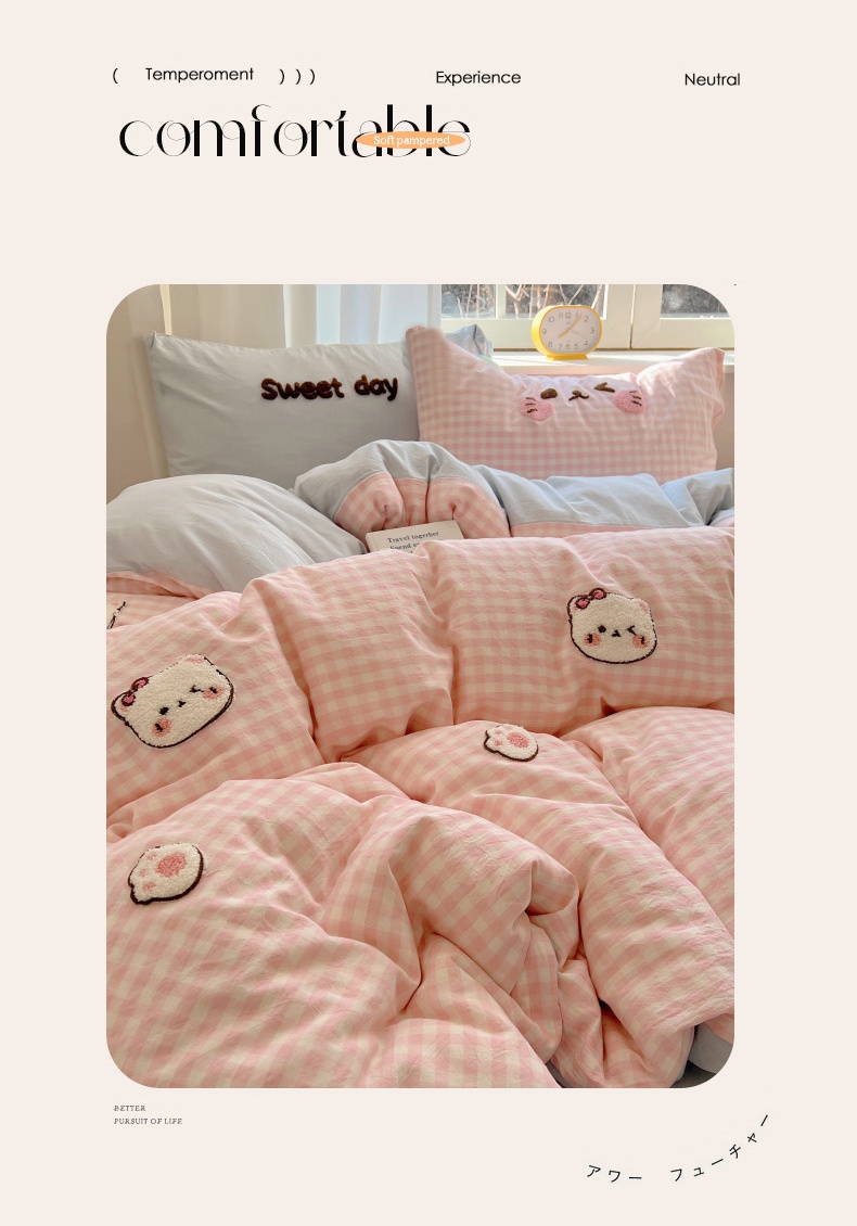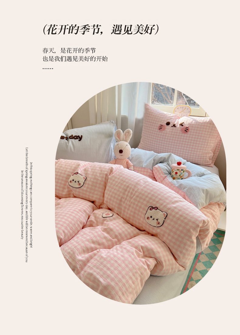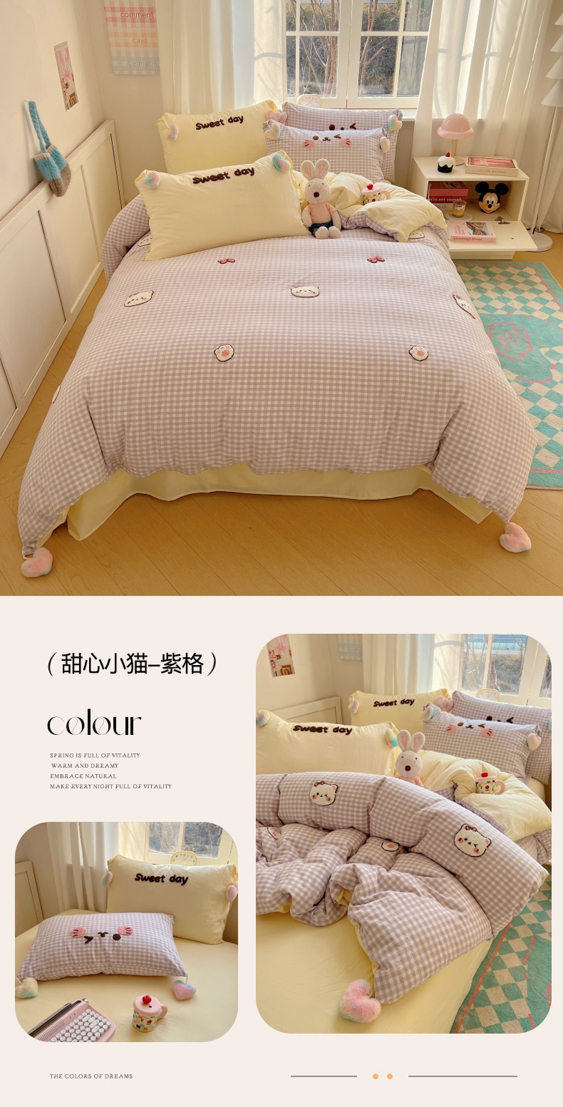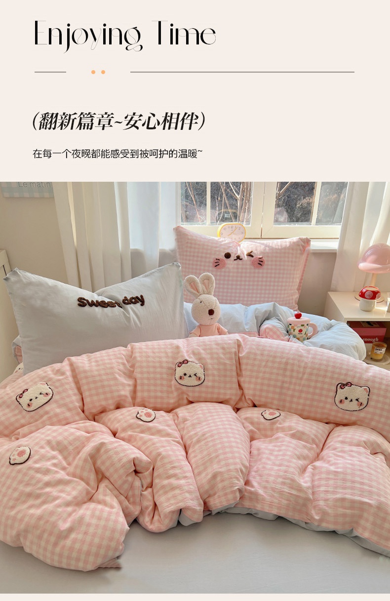 当前位置: 91家纺网 > 商品网购 > 床品套件 > 四件套 > 全棉普通四件套 > 丽涵家纺 2025新款色织水洗棉毛巾绣四件套-甜心小猫系列 甜心小猫-粉蓝-简单款