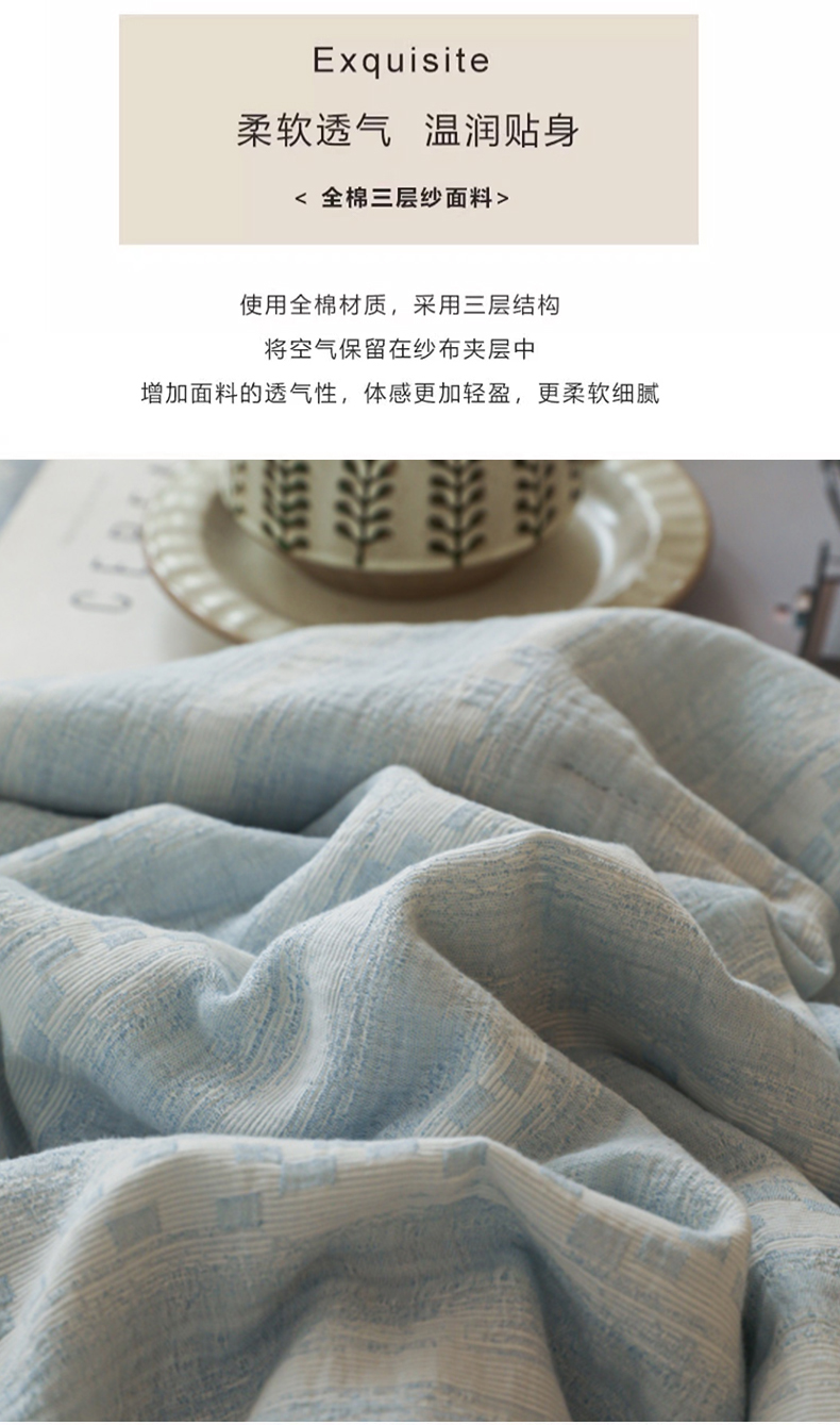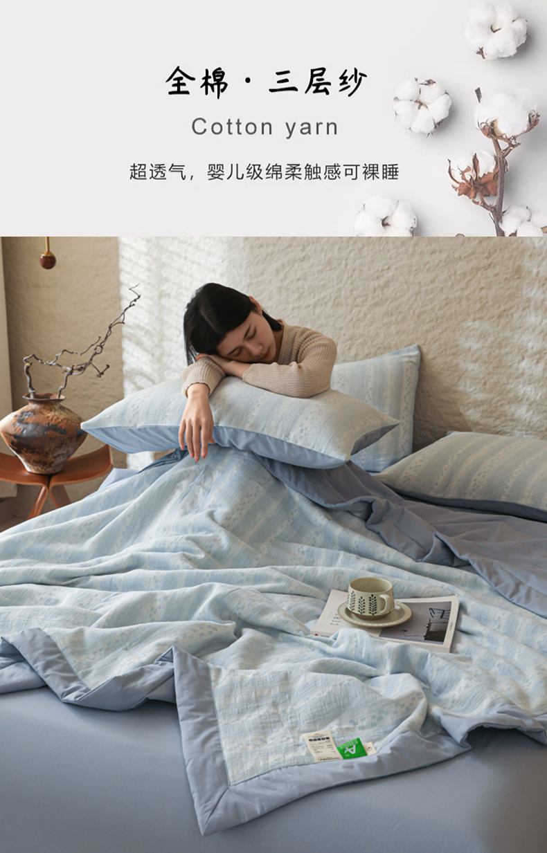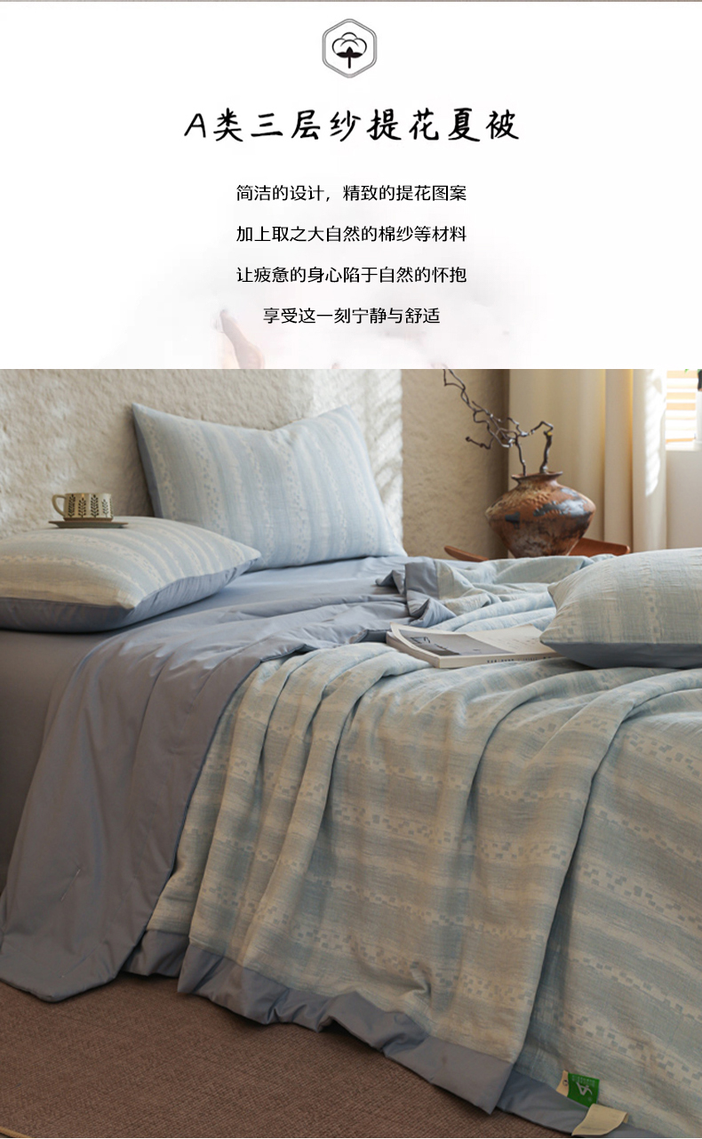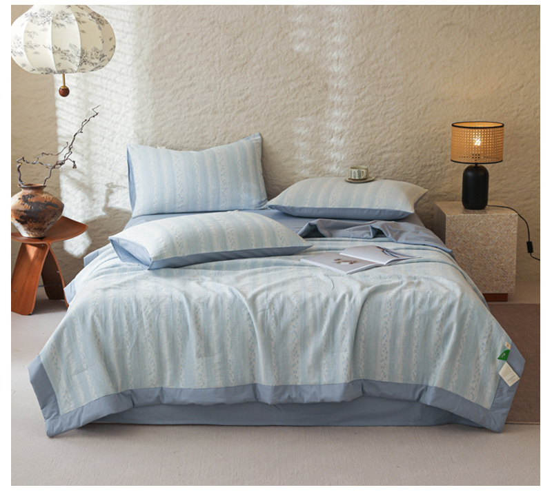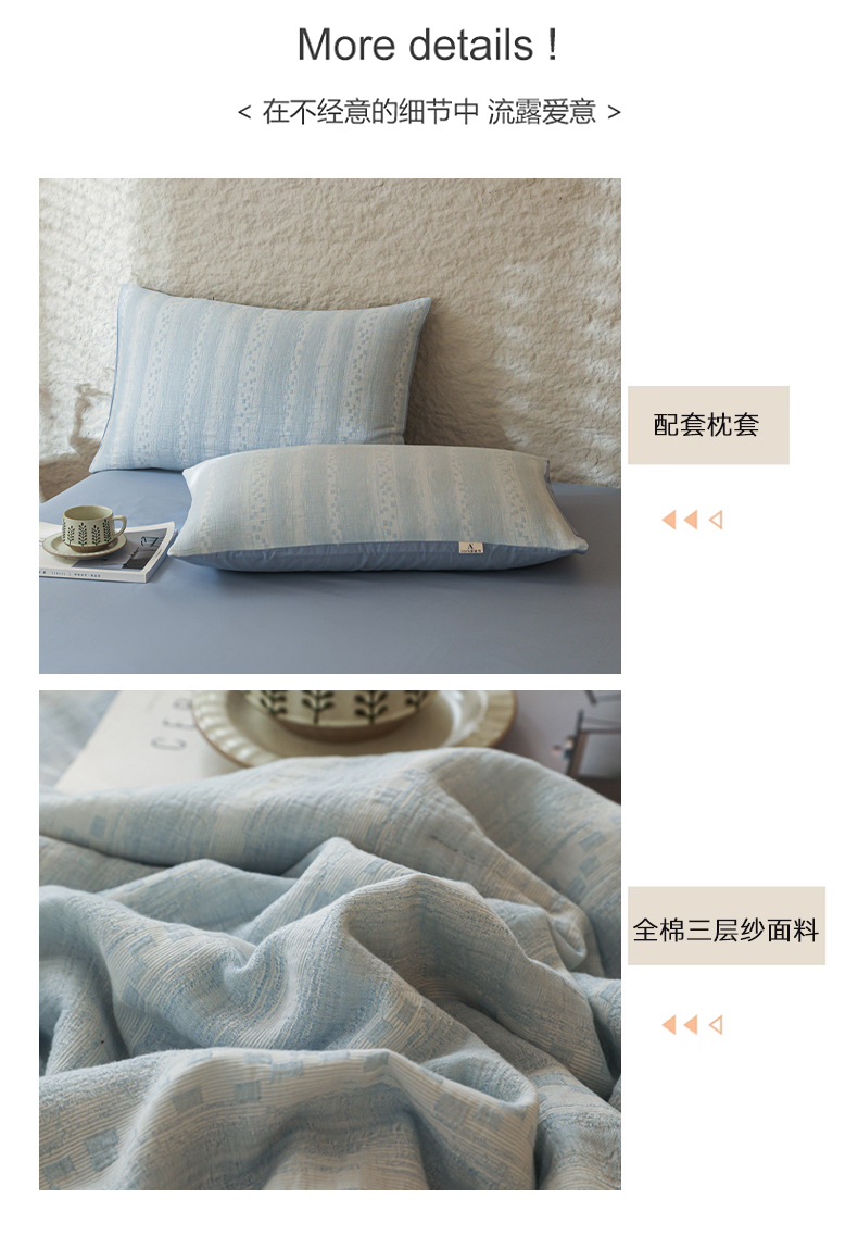 当前位置: 91家纺网 > 商品网购 > 床品套件 > 四件套 > 提花四件套 > 眠博士 2025新款A类全棉包边三层纱提花夏被四件套 包边三层纱夏被-时光-蓝