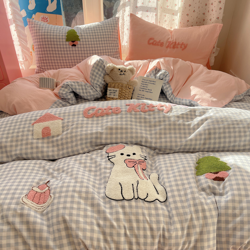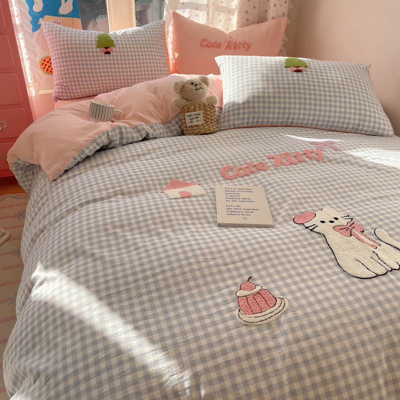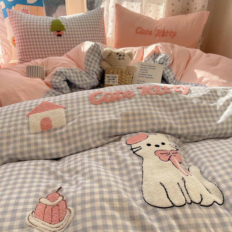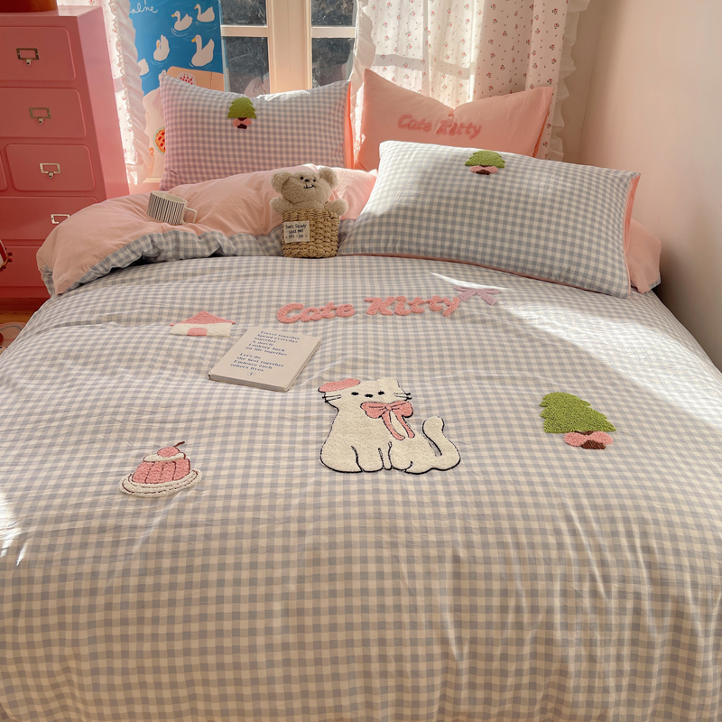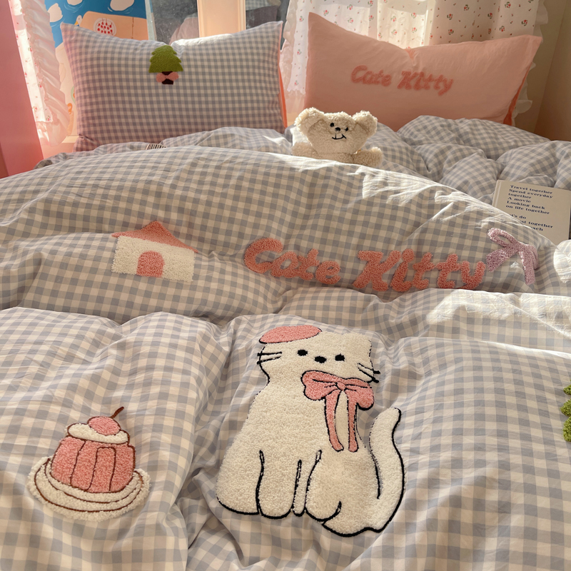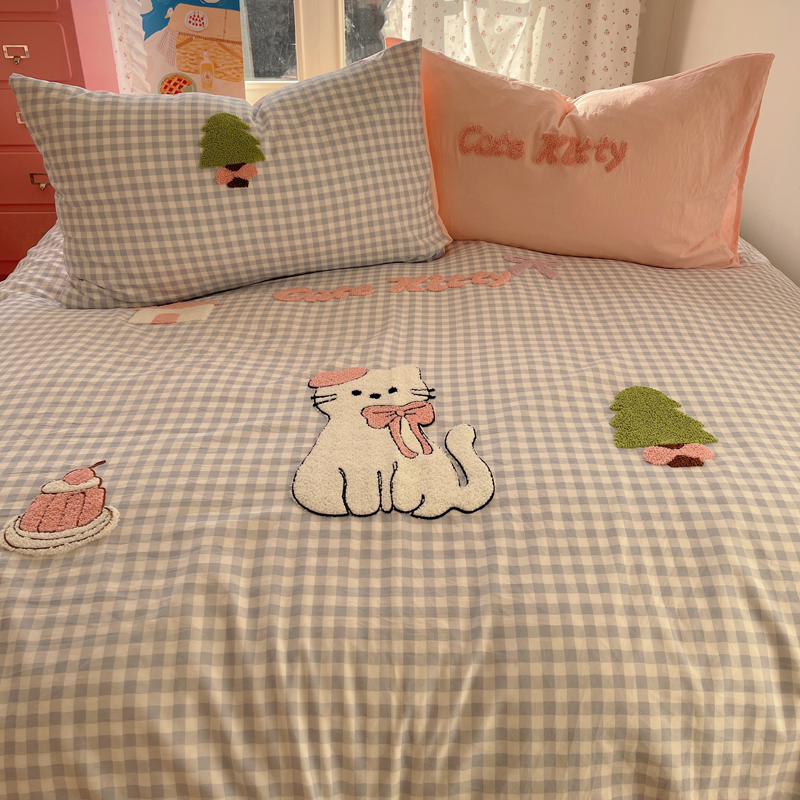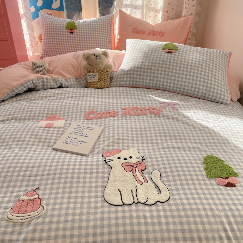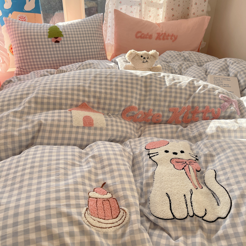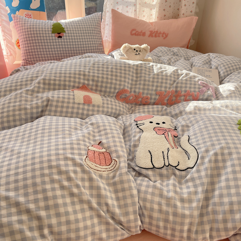 商品名称:顾里家纺 2025新款ins韩系童趣毛巾绣云朵棉四件套 蓝格白猫