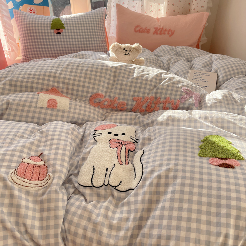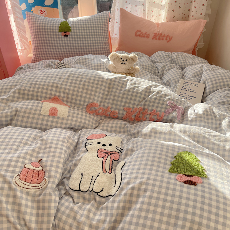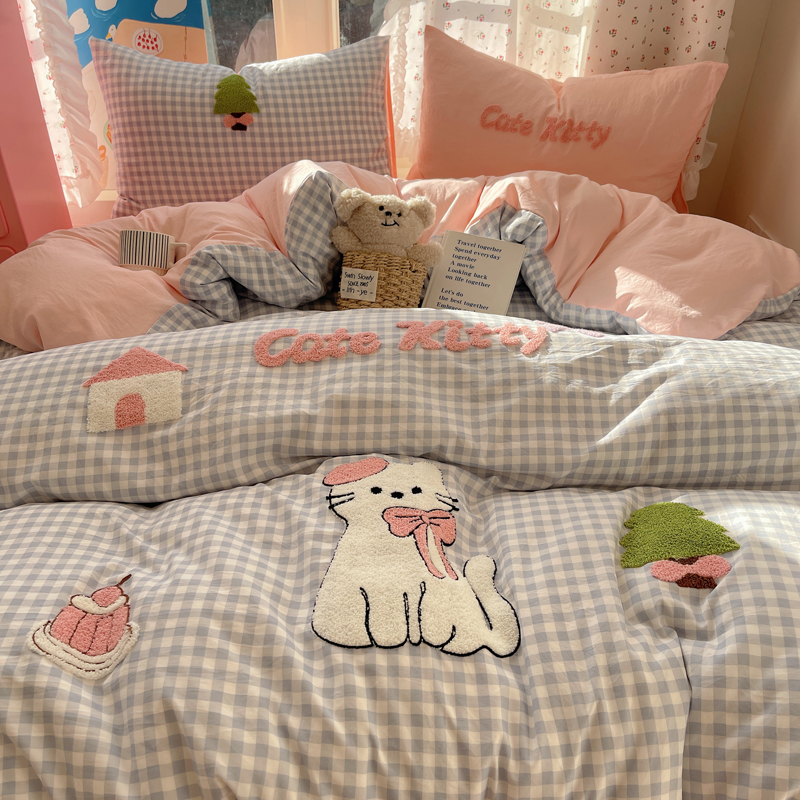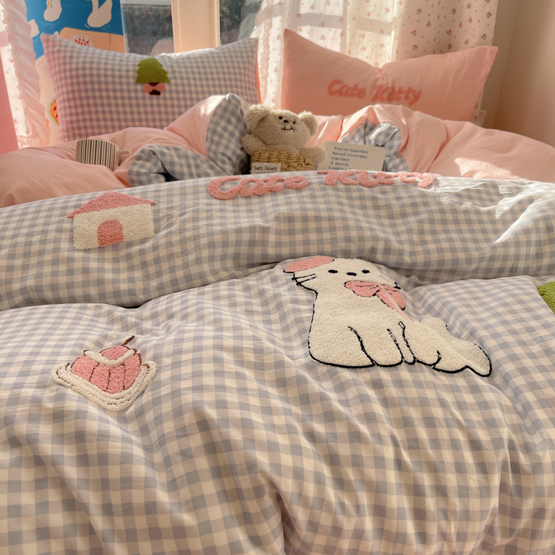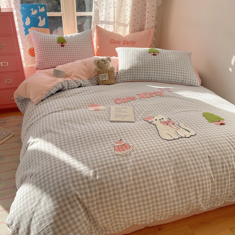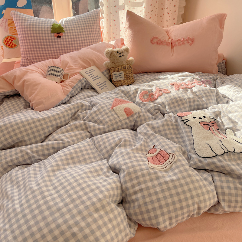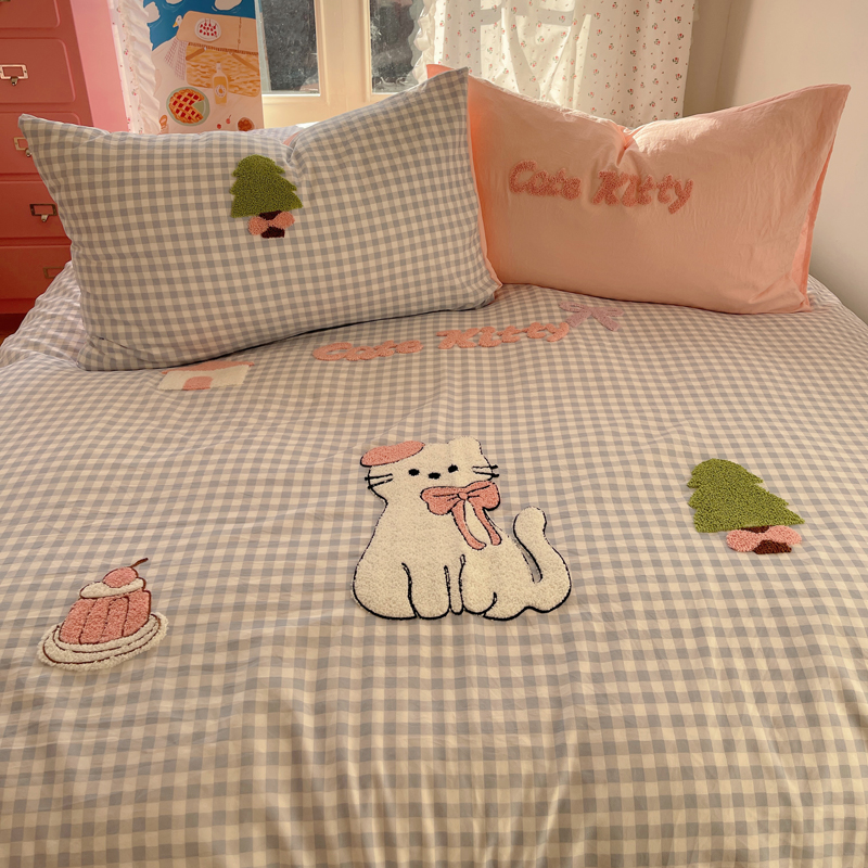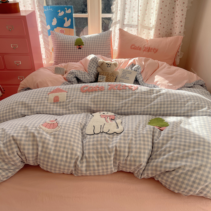 商品名称:顾里家纺 2025新款ins韩系童趣毛巾绣云朵棉四件套 蓝格白猫