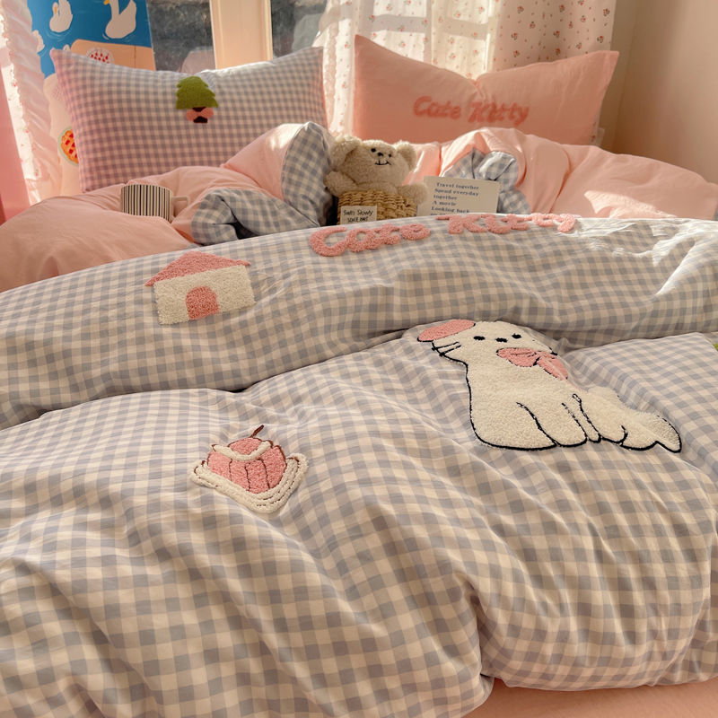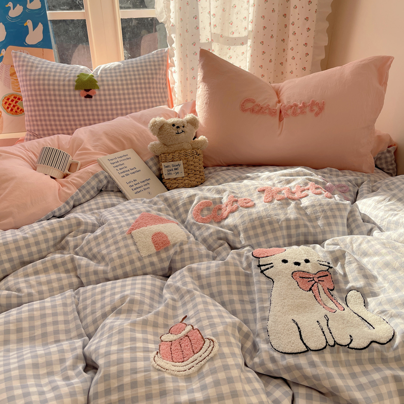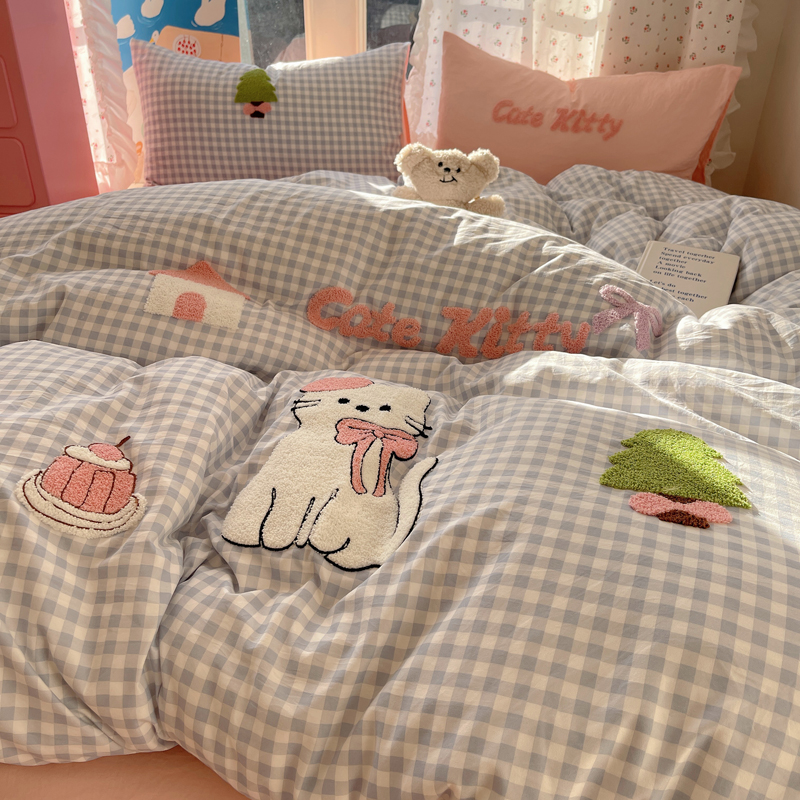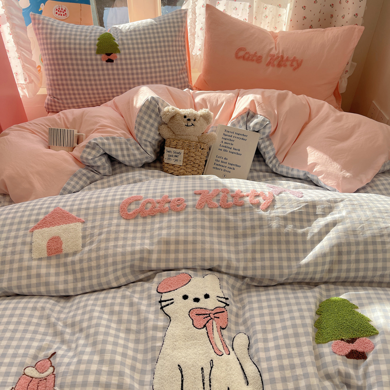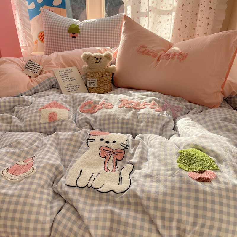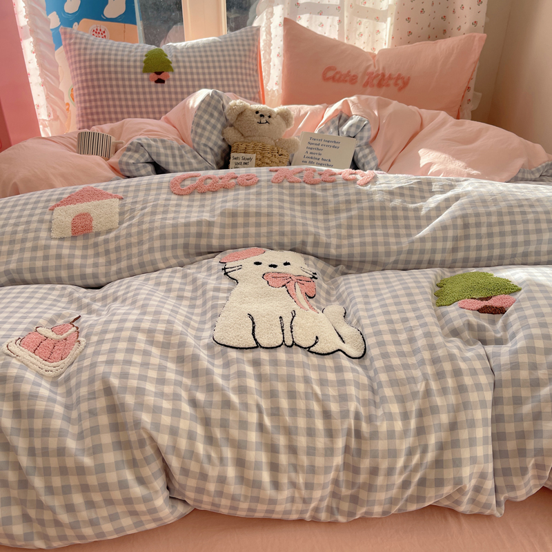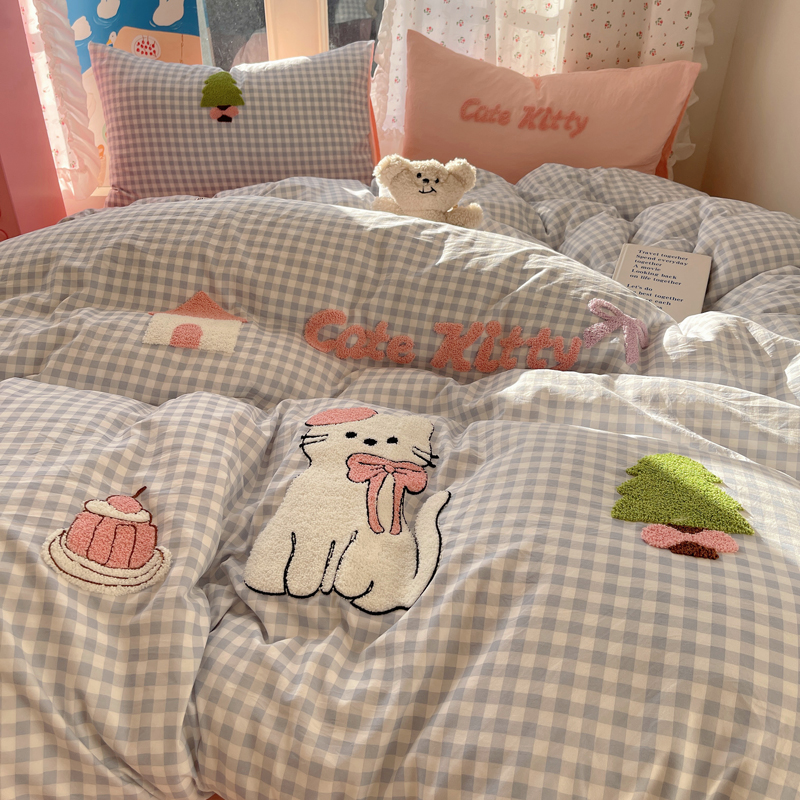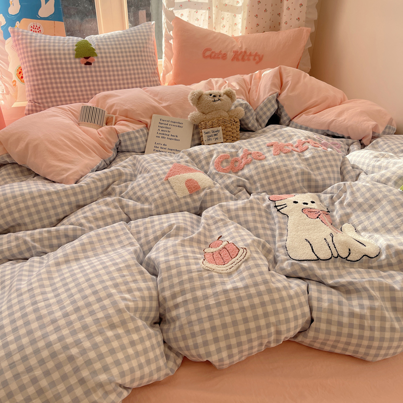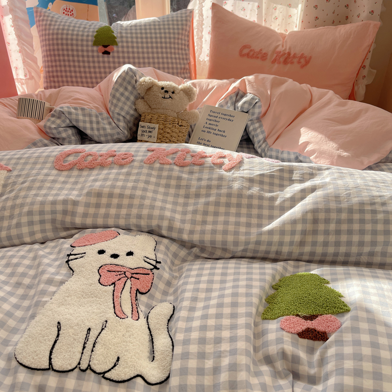 商品名称:顾里家纺 2025新款ins韩系童趣毛巾绣云朵棉四件套 蓝格白猫