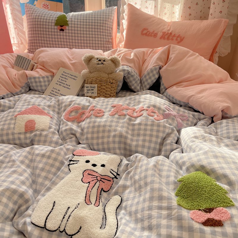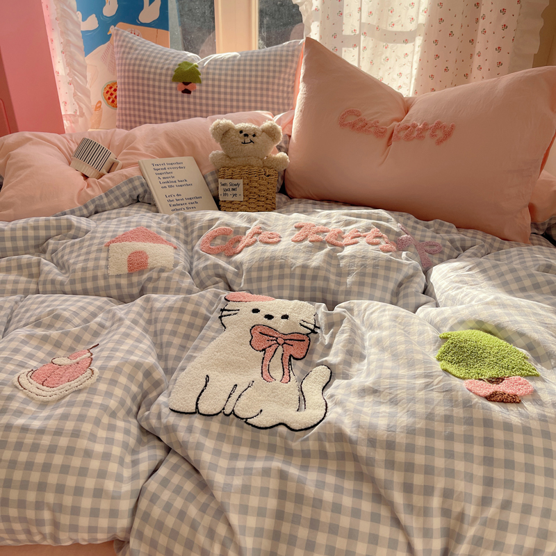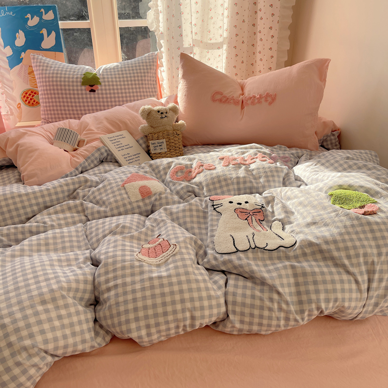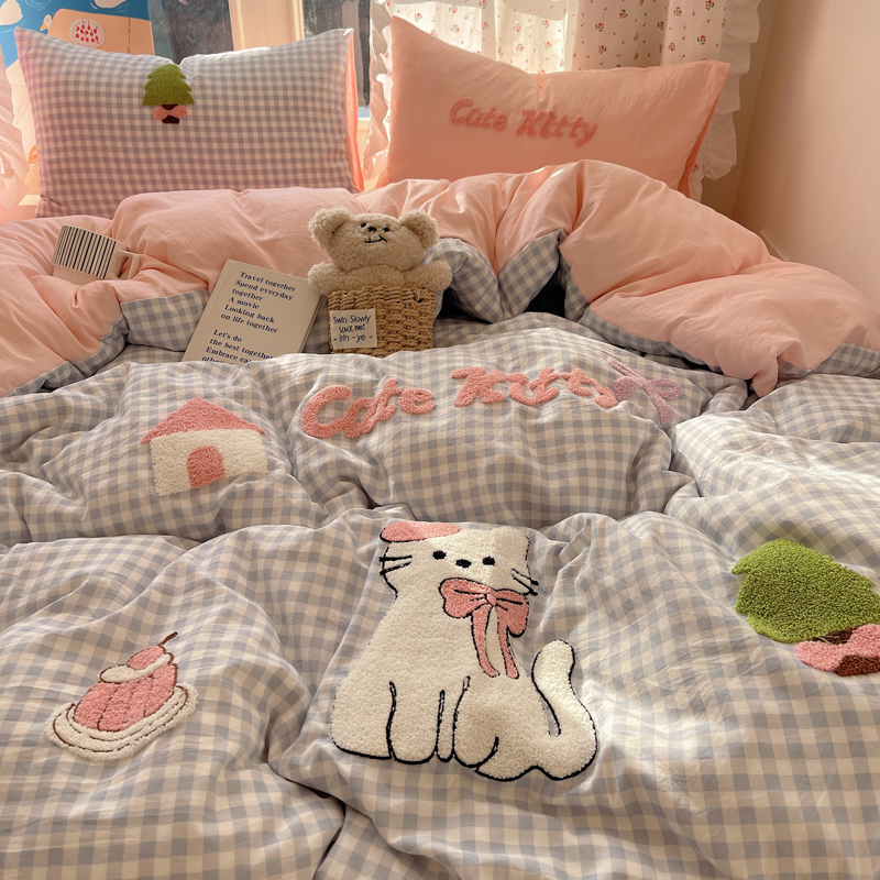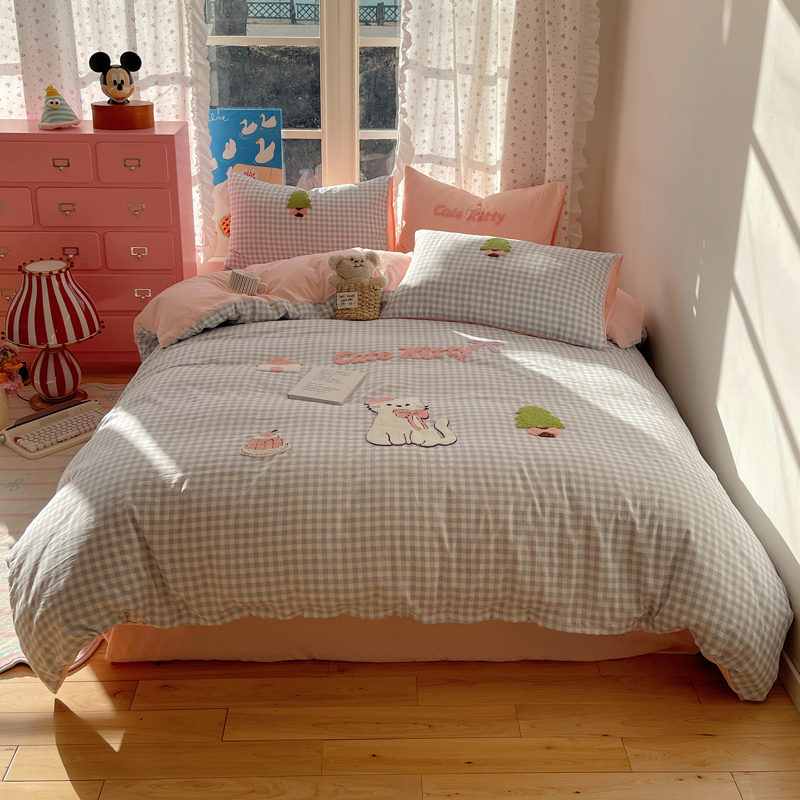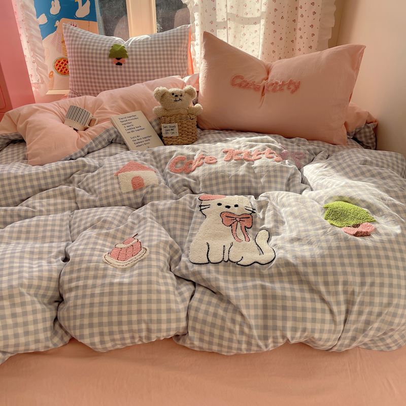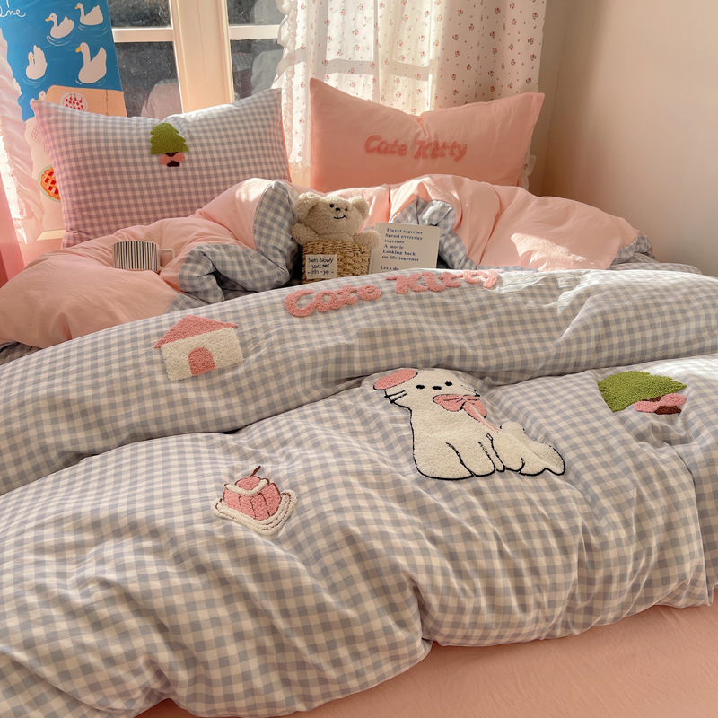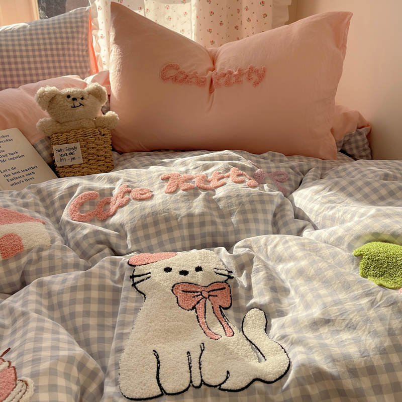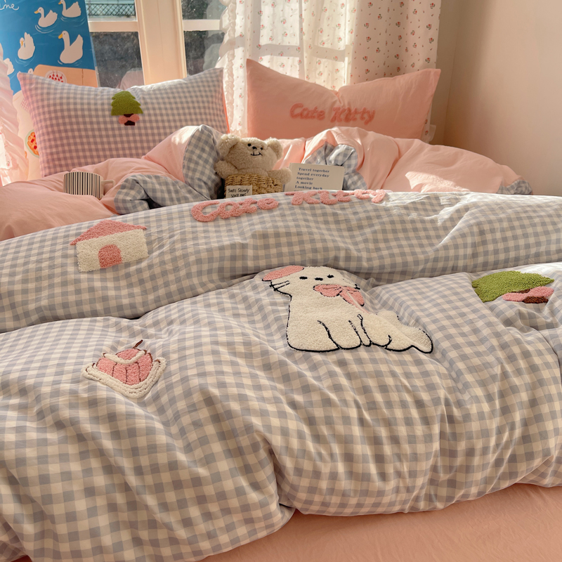 商品名称:顾里家纺 2025新款ins韩系童趣毛巾绣云朵棉四件套 蓝格白猫