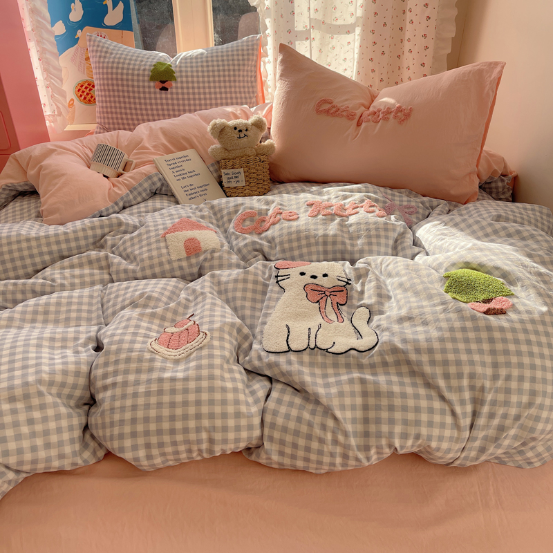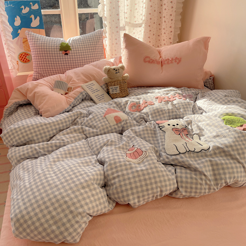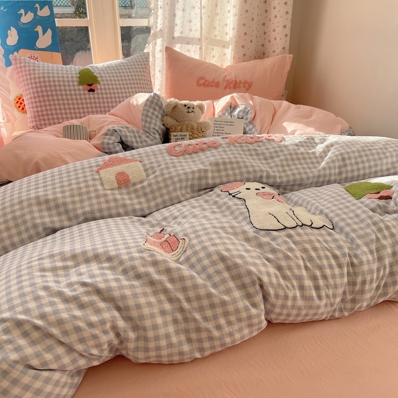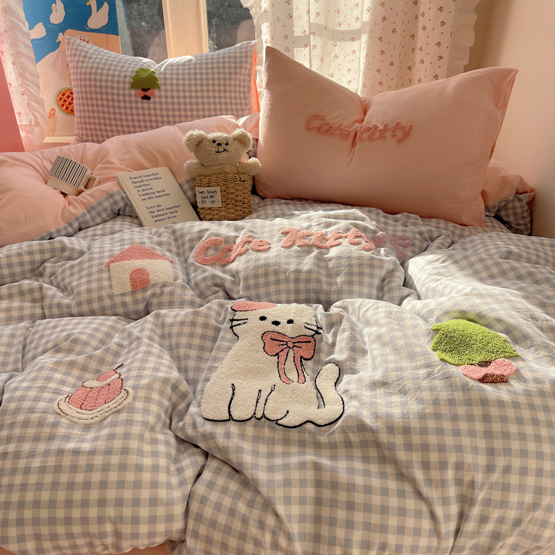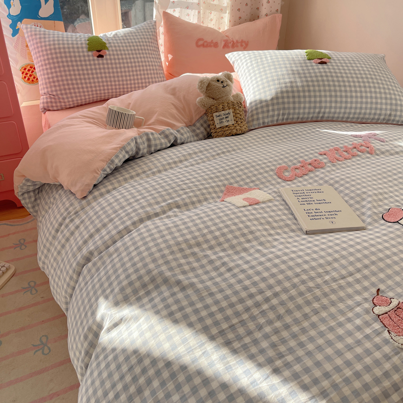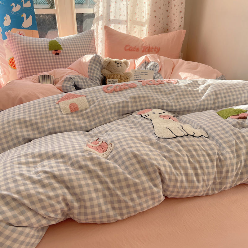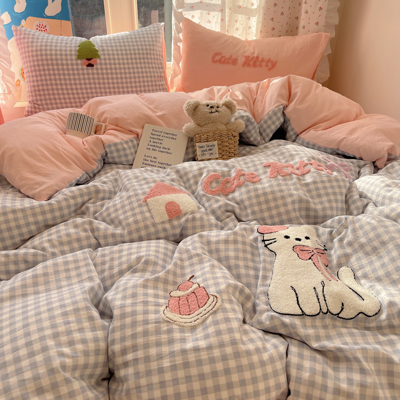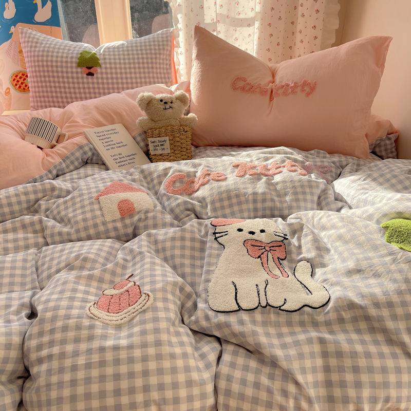 商品名称:顾里家纺 2025新款ins韩系童趣毛巾绣云朵棉四件套 蓝格白猫