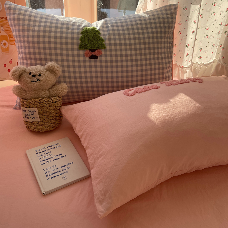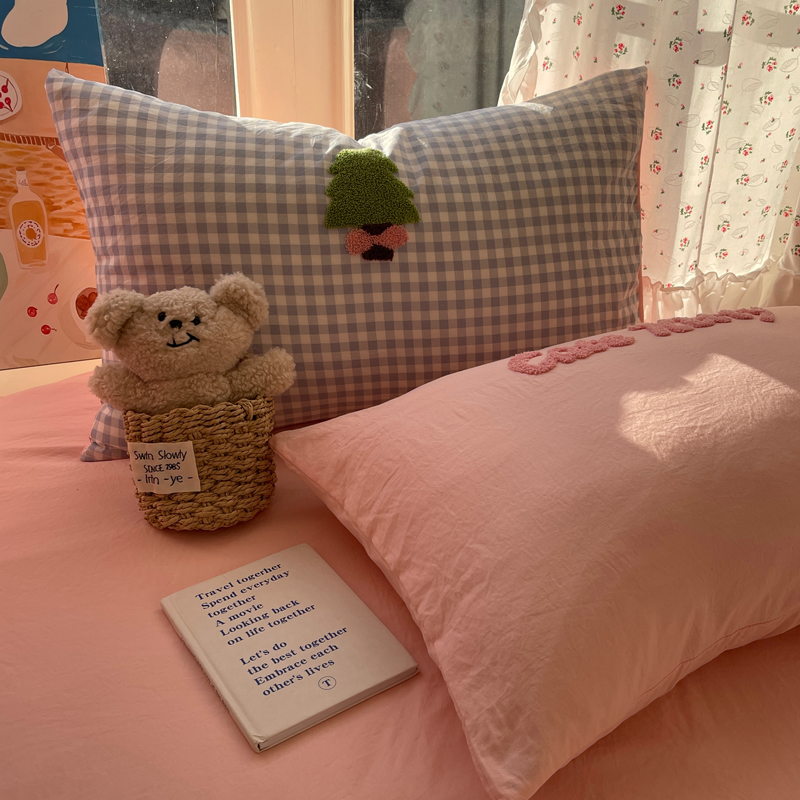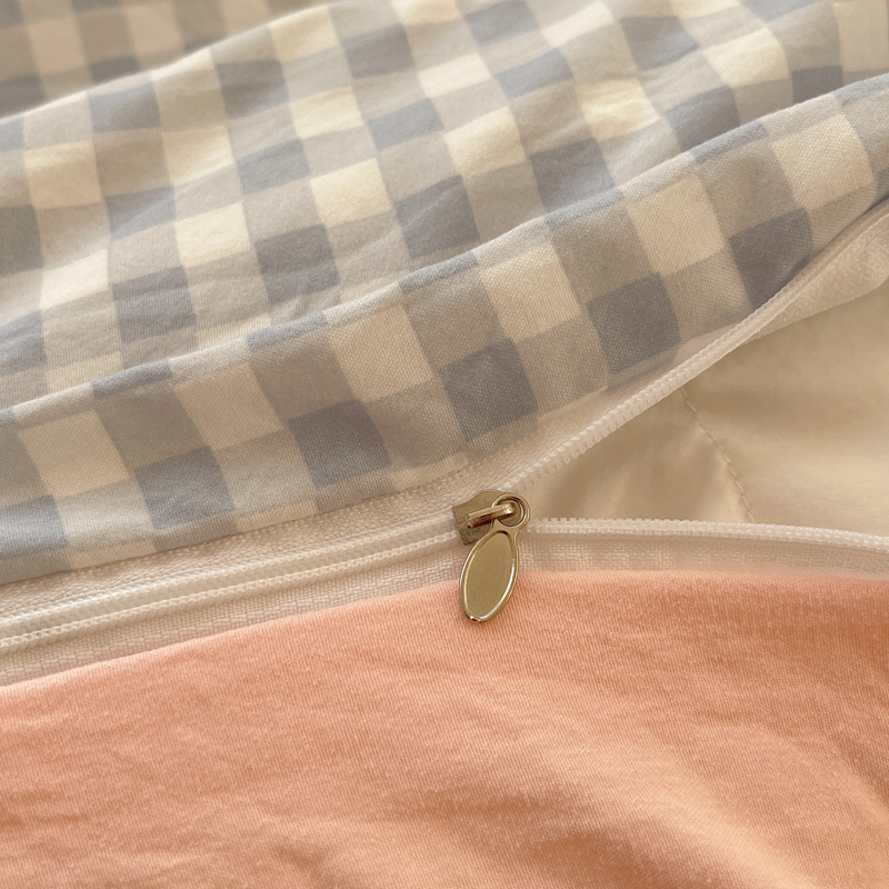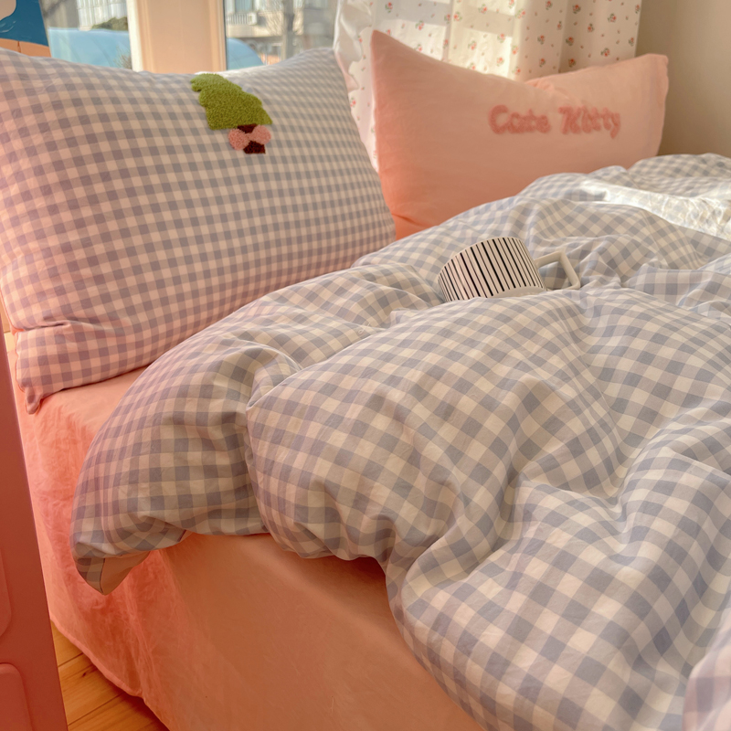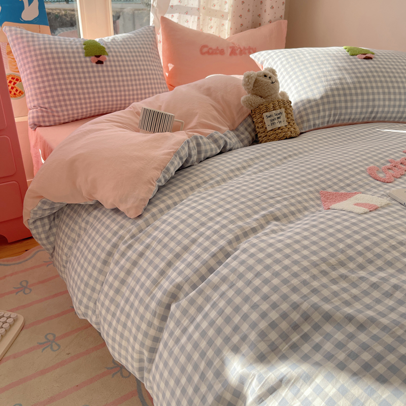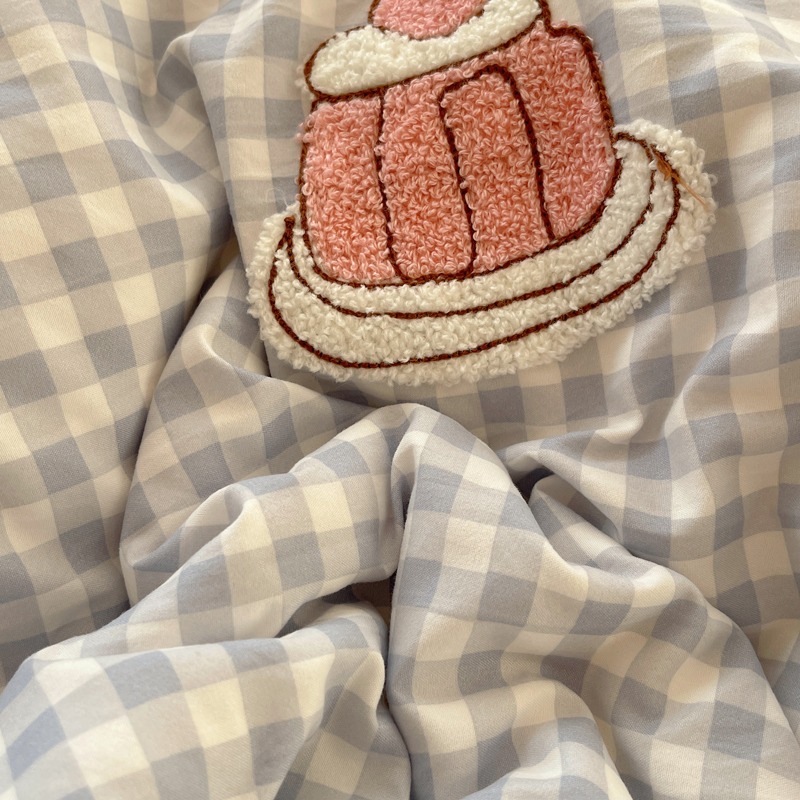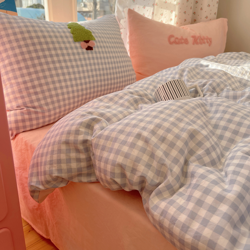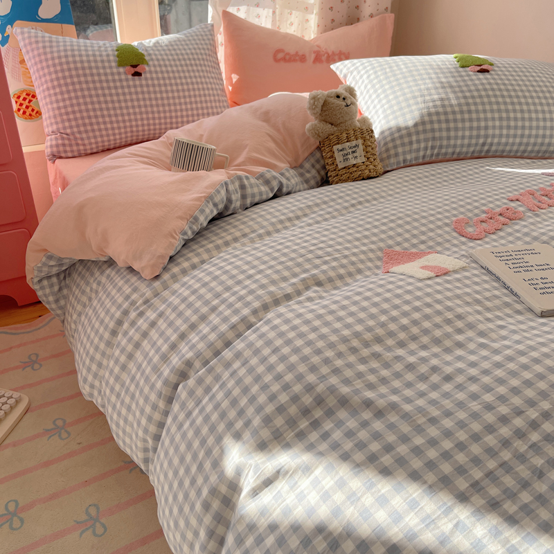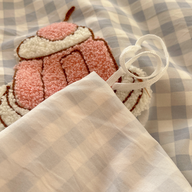 商品名称:顾里家纺 2025新款ins韩系童趣毛巾绣云朵棉四件套 蓝格白猫