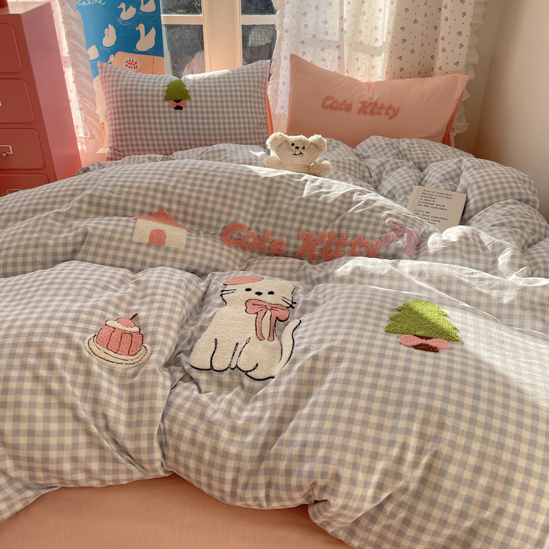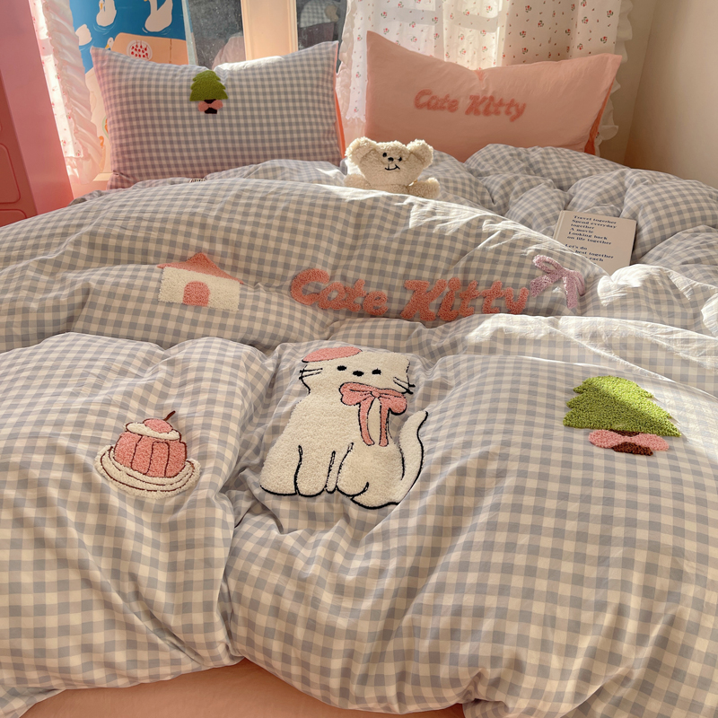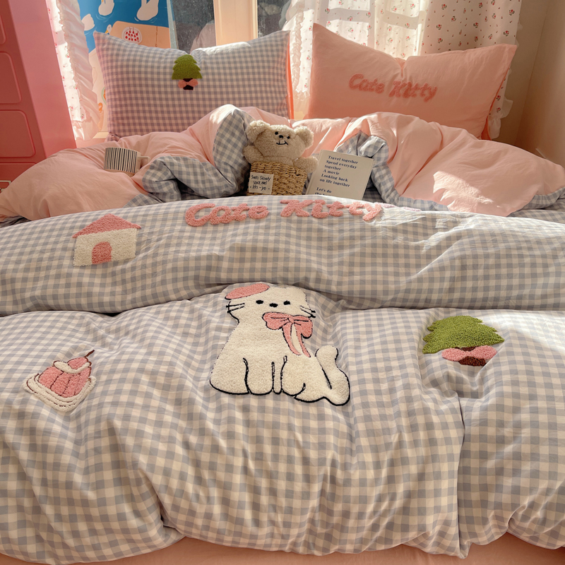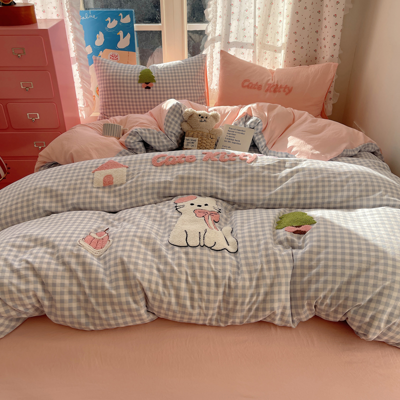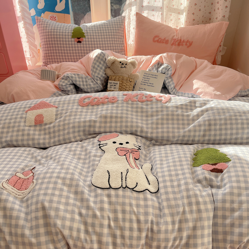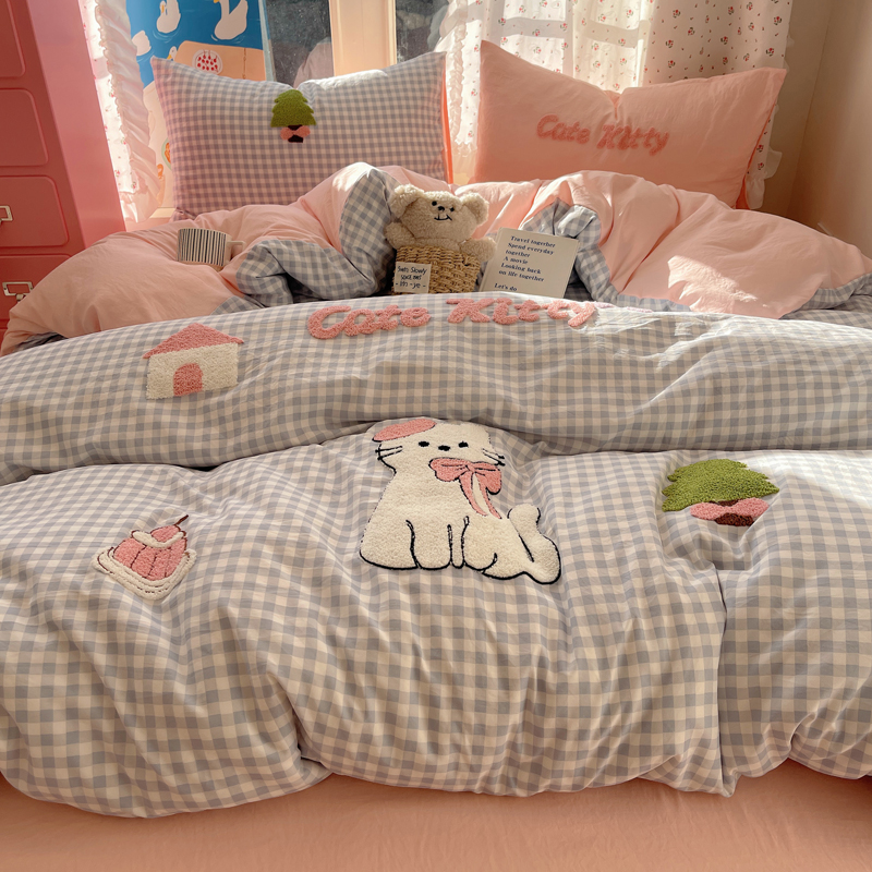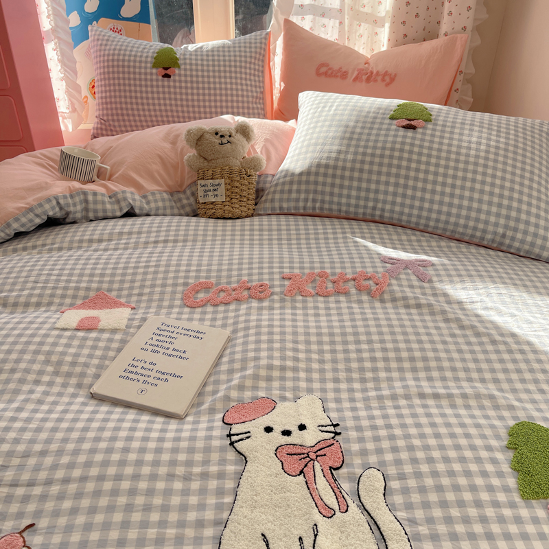顾里家纺 2025新款ins韩系童趣毛巾绣云朵棉四件套 蓝格白猫