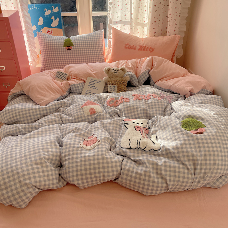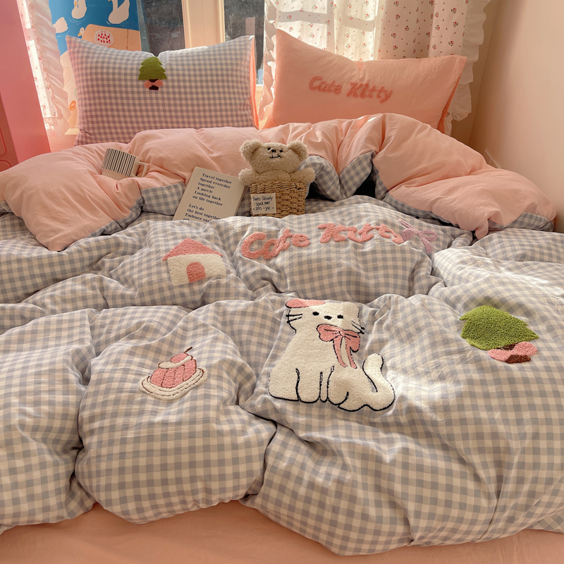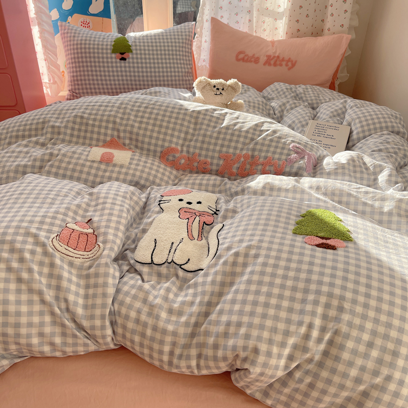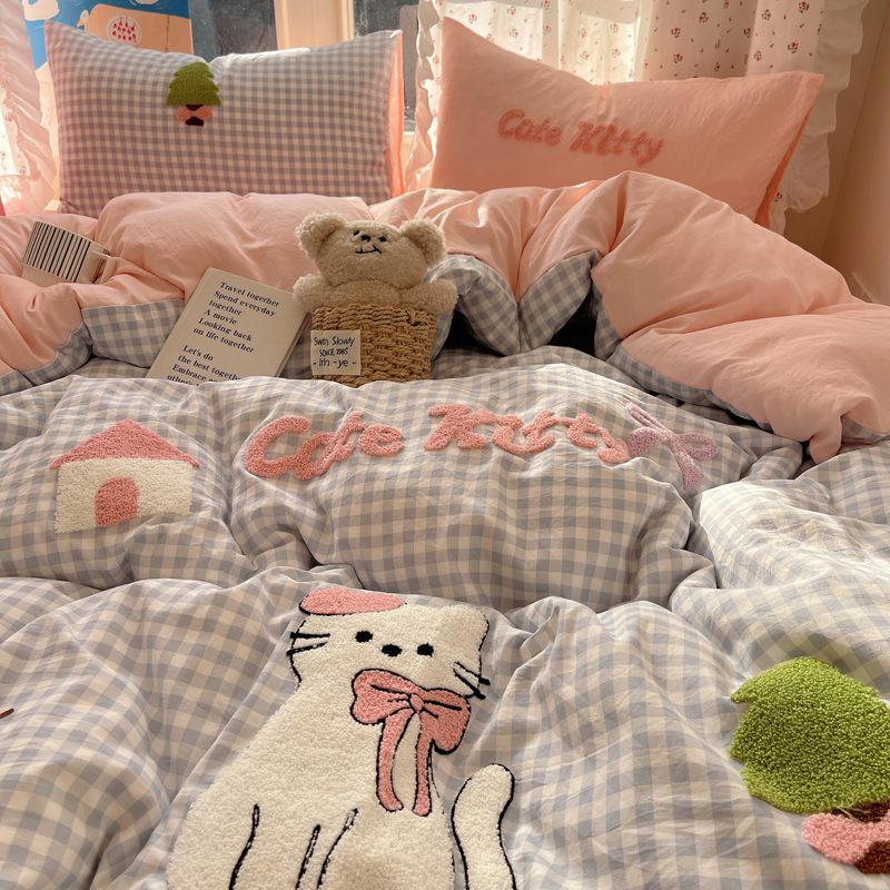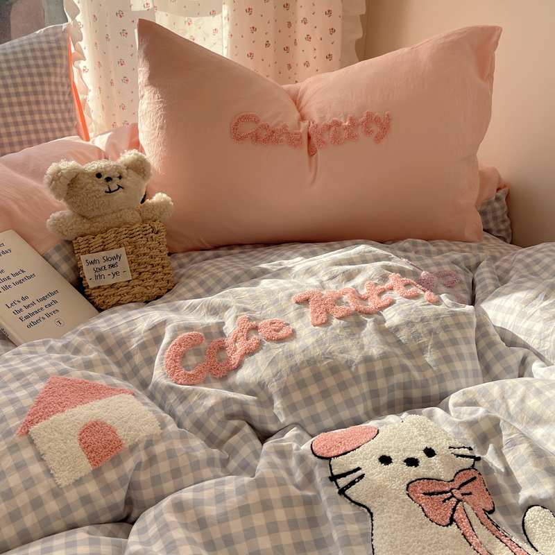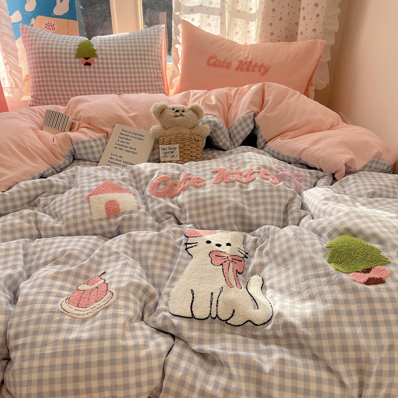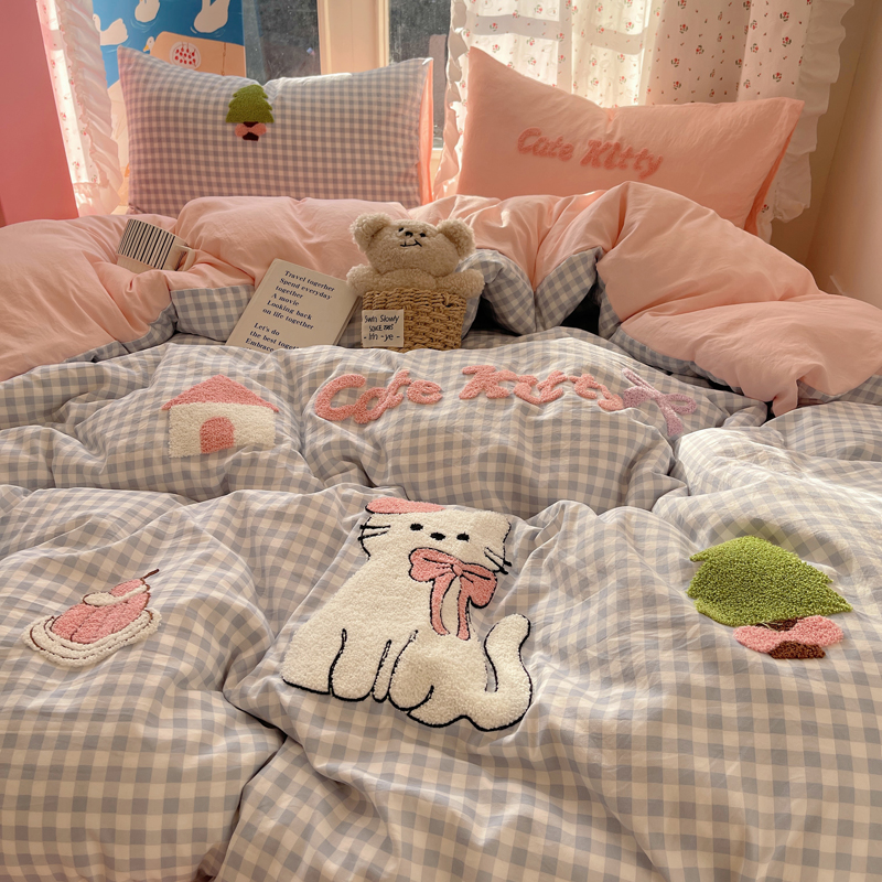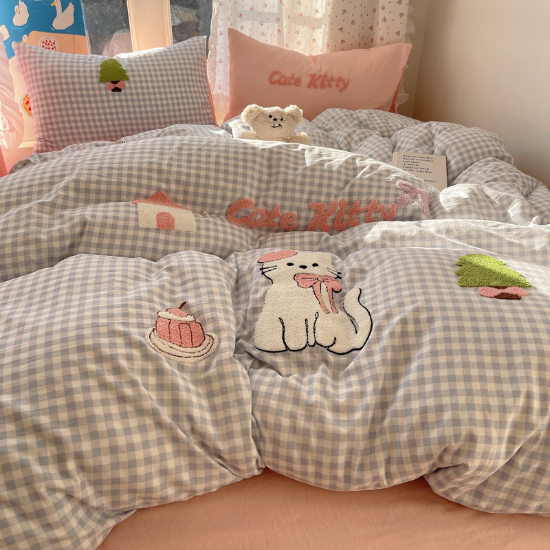 顾里家纺 2025新款ins韩系童趣毛巾绣云朵棉四件套 蓝格白猫