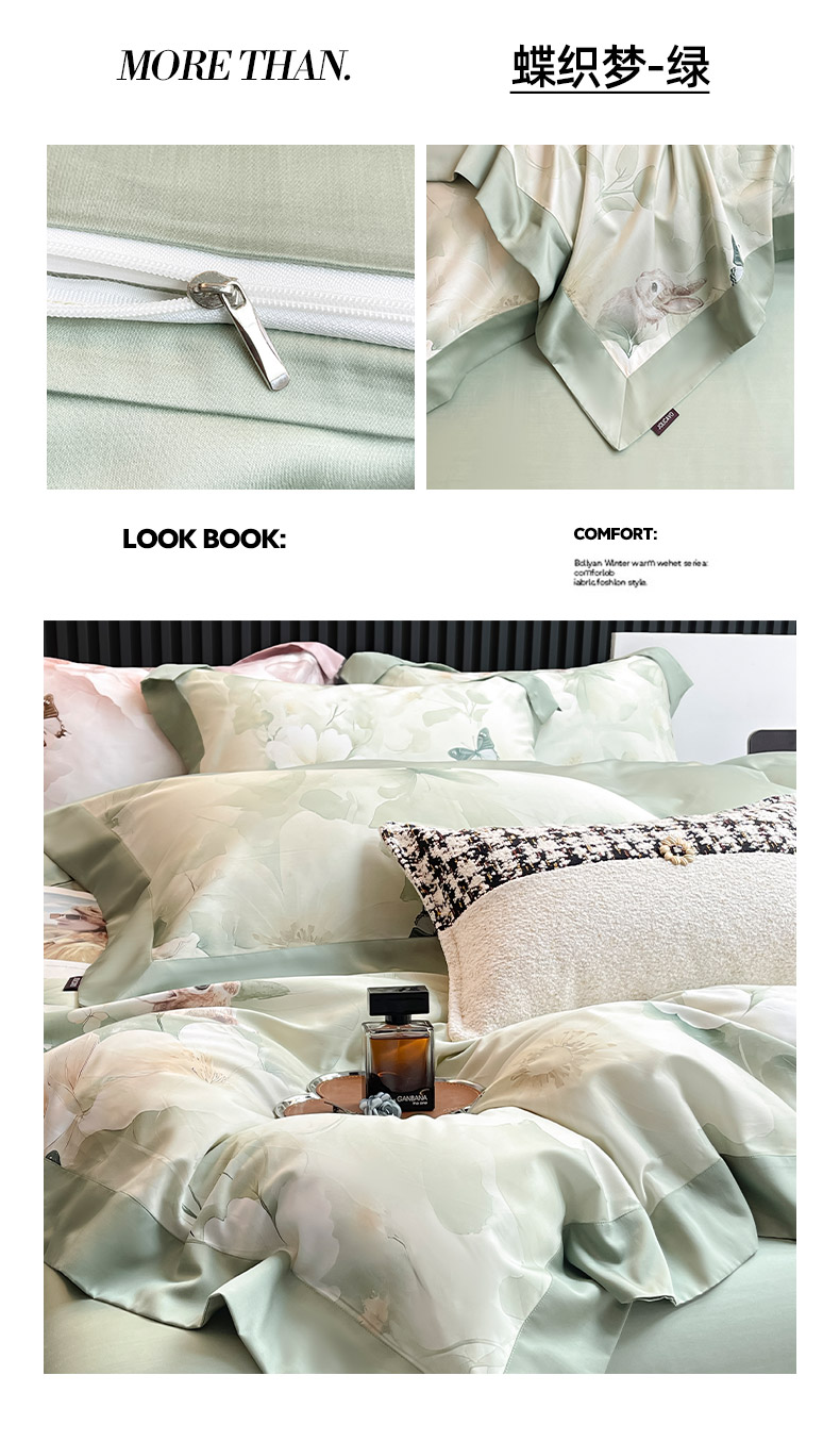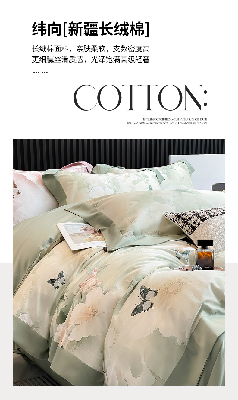 商品名称:2025夏季A类母婴级天丝棉印花四件套纯棉全棉高端数码印花丝滑裸睡长绒棉被套真丝床上用品 蝶织梦-绿