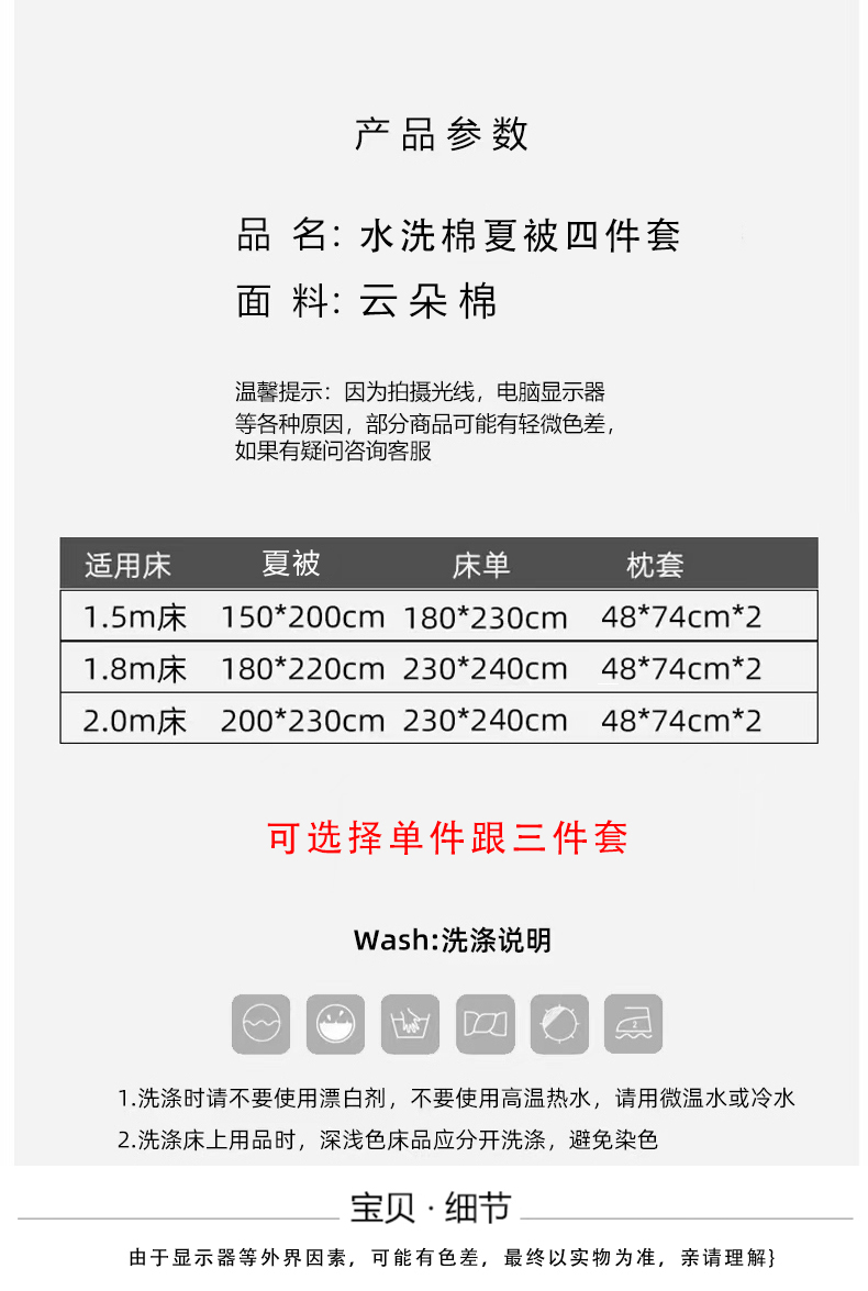 1.5米夏被三件套:夏被1.5*2.0米 床单 1.8*2.3米 枕套47*74*1