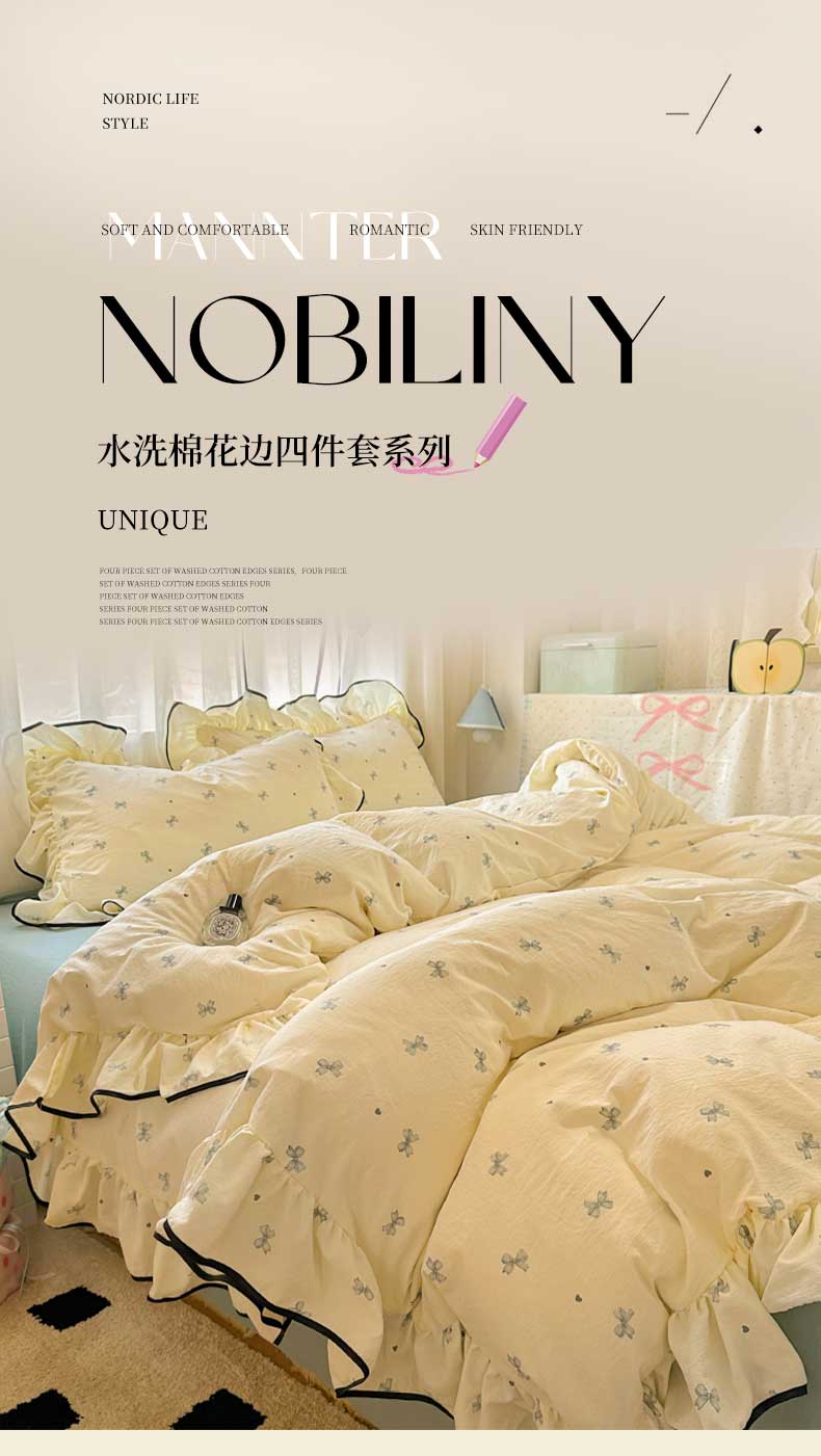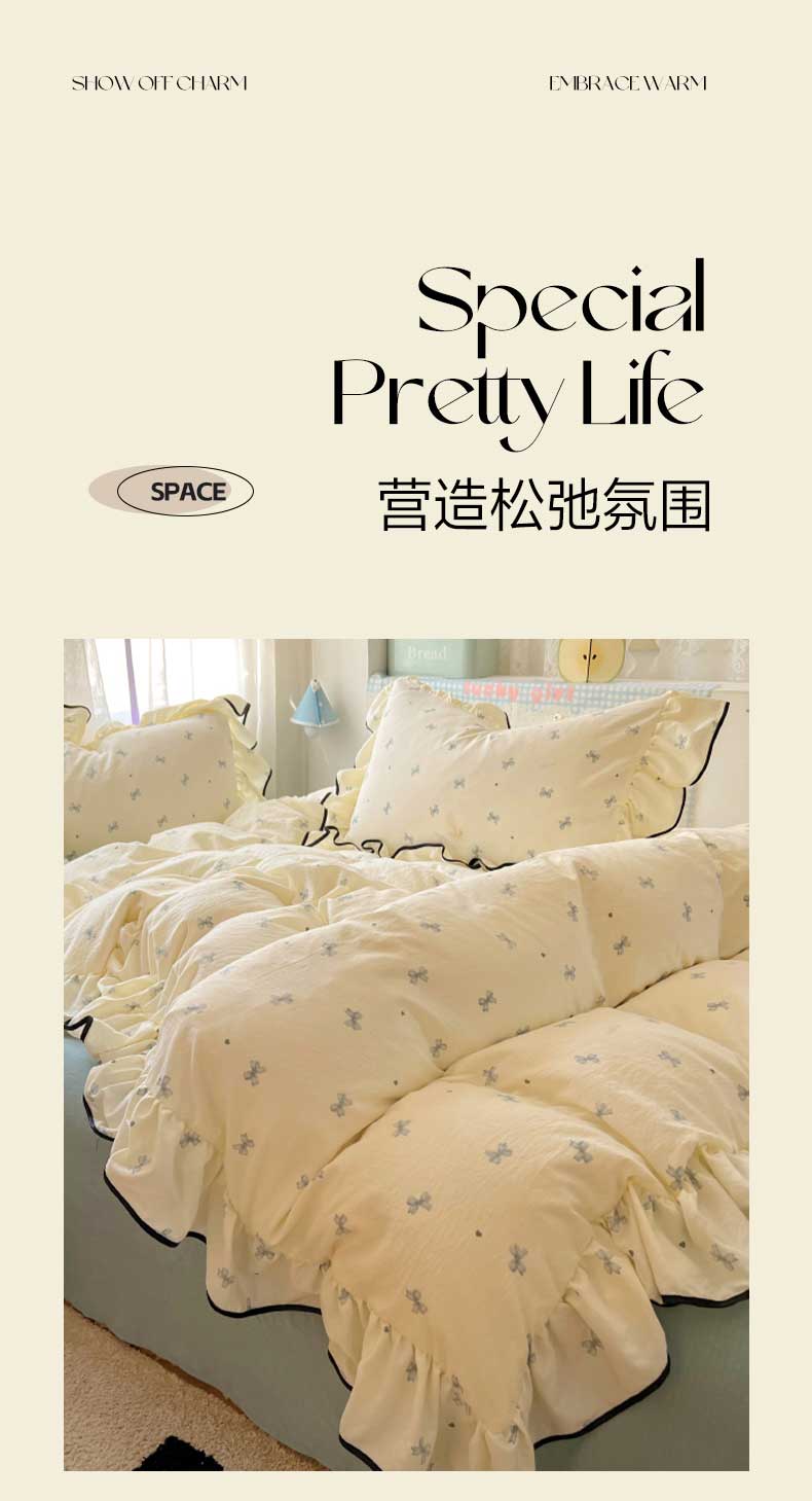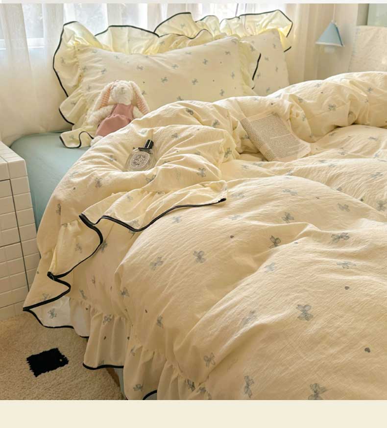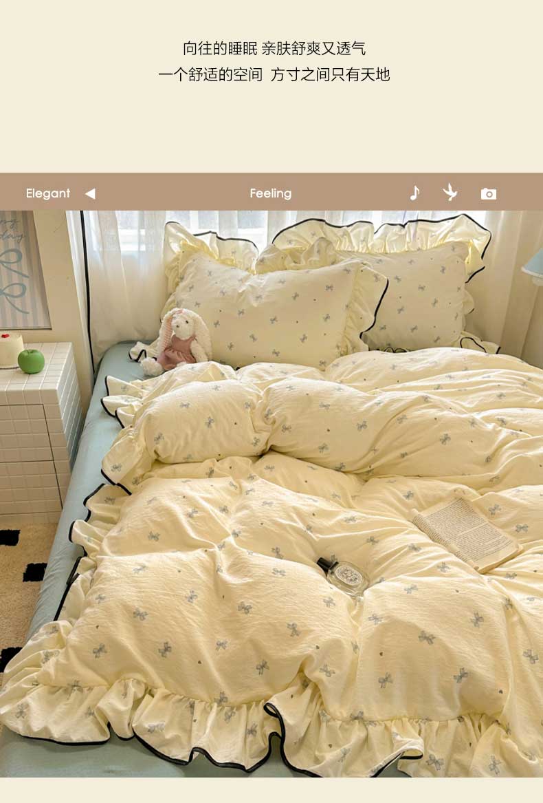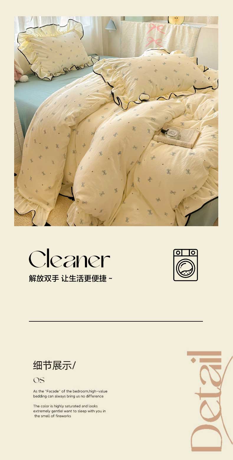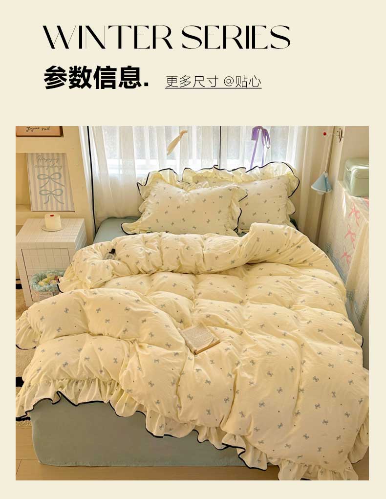 当前位置: 91家纺网 > 商品网购 > 床品套件 > 四件套 > 水洗棉四件套 > 繁花家居 2025春夏新款学生季韩式云感针织棉大花边木耳边四件套 少女心结 蓝