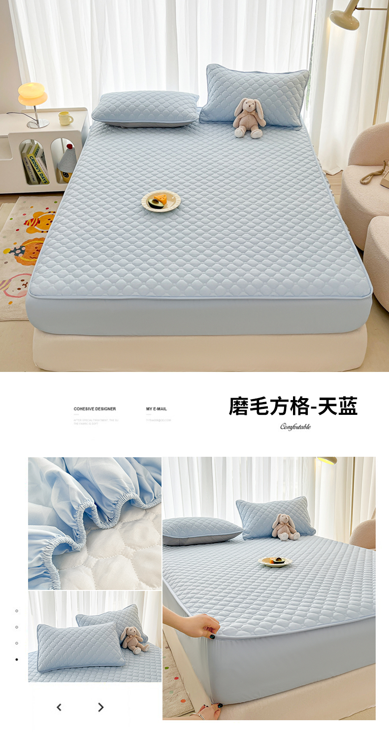 • 91家纺网 家纺一手货源 找家纺 欧邦 2025新款四季款纯色水洗棉夹棉床笠床垫保护罩 磨毛方格-天蓝