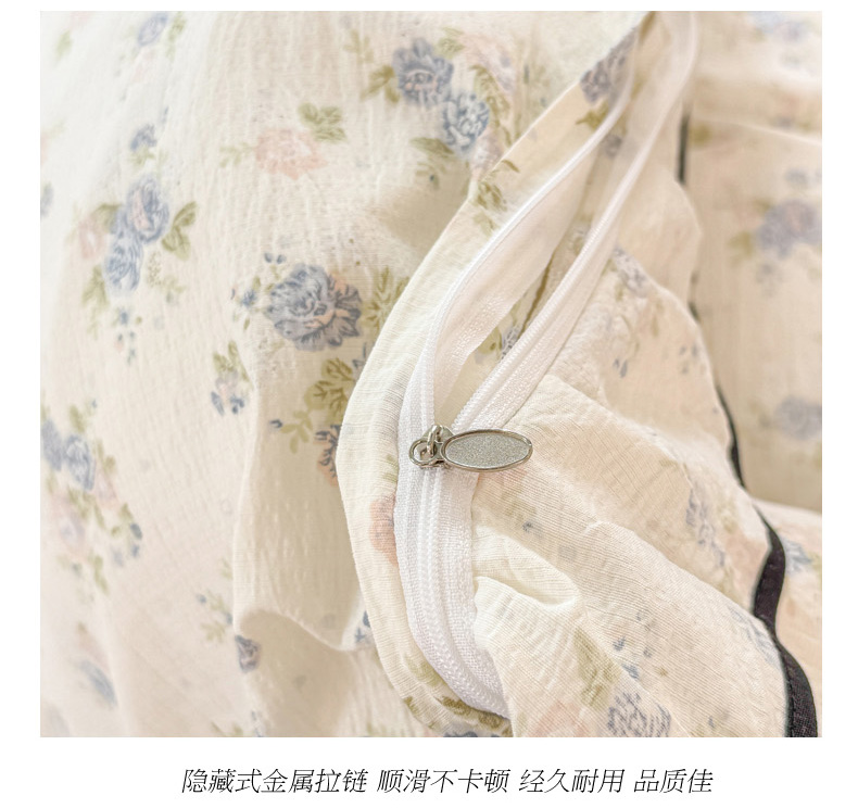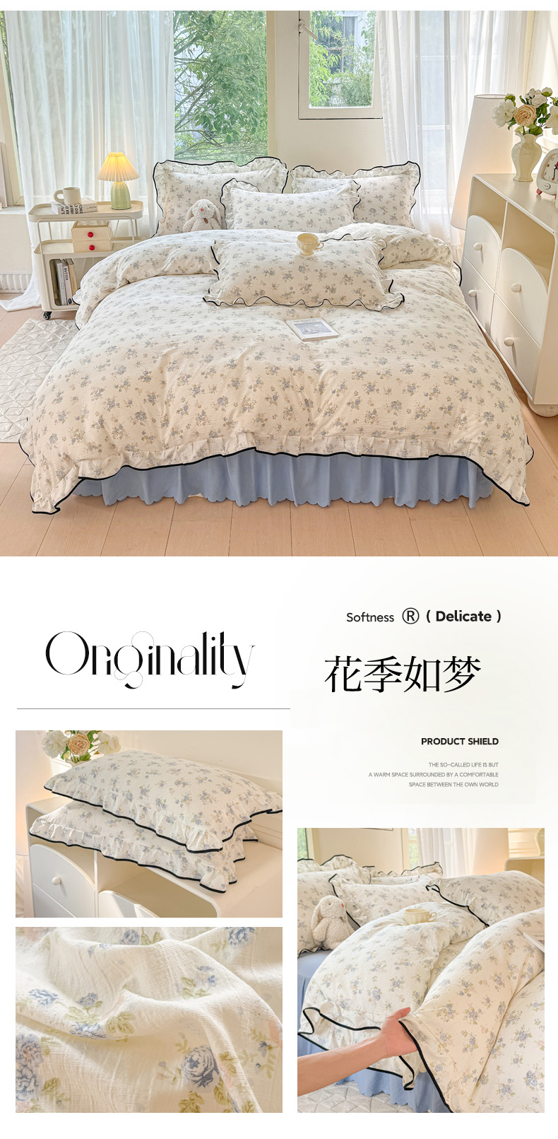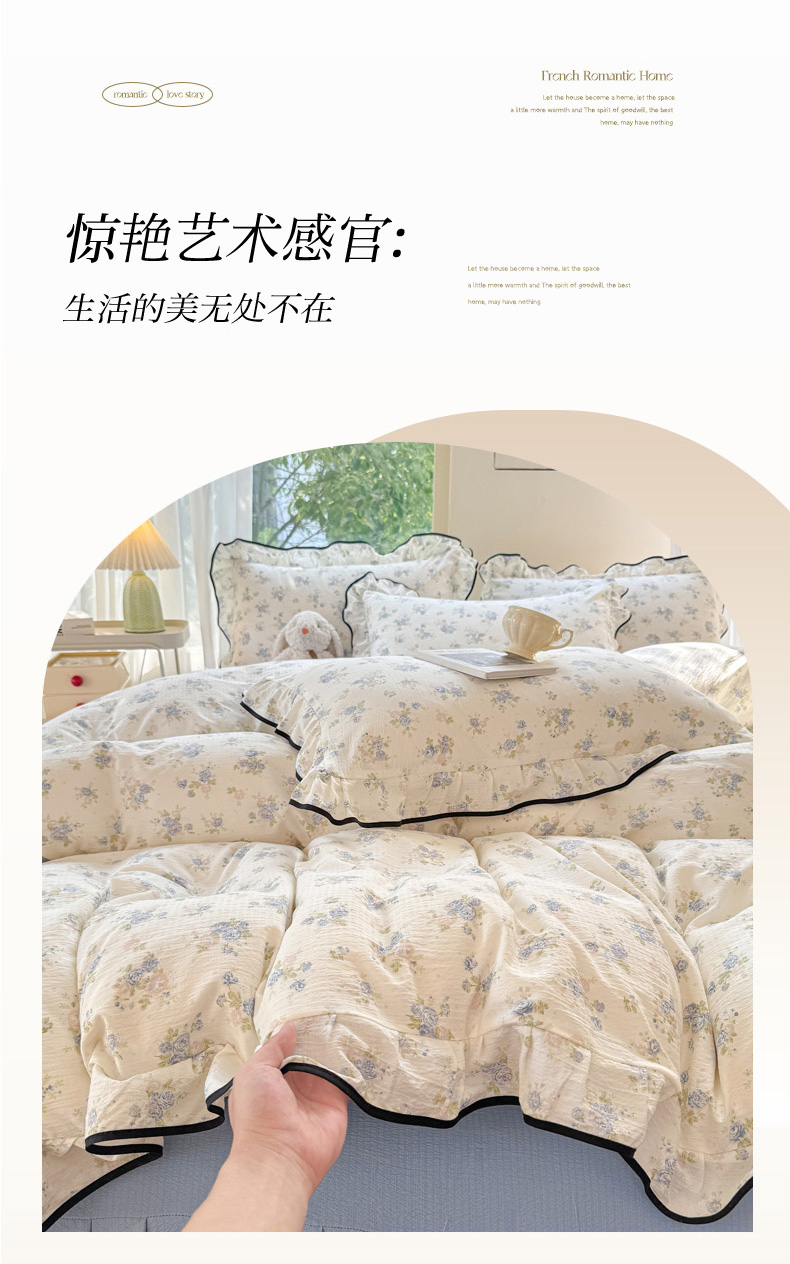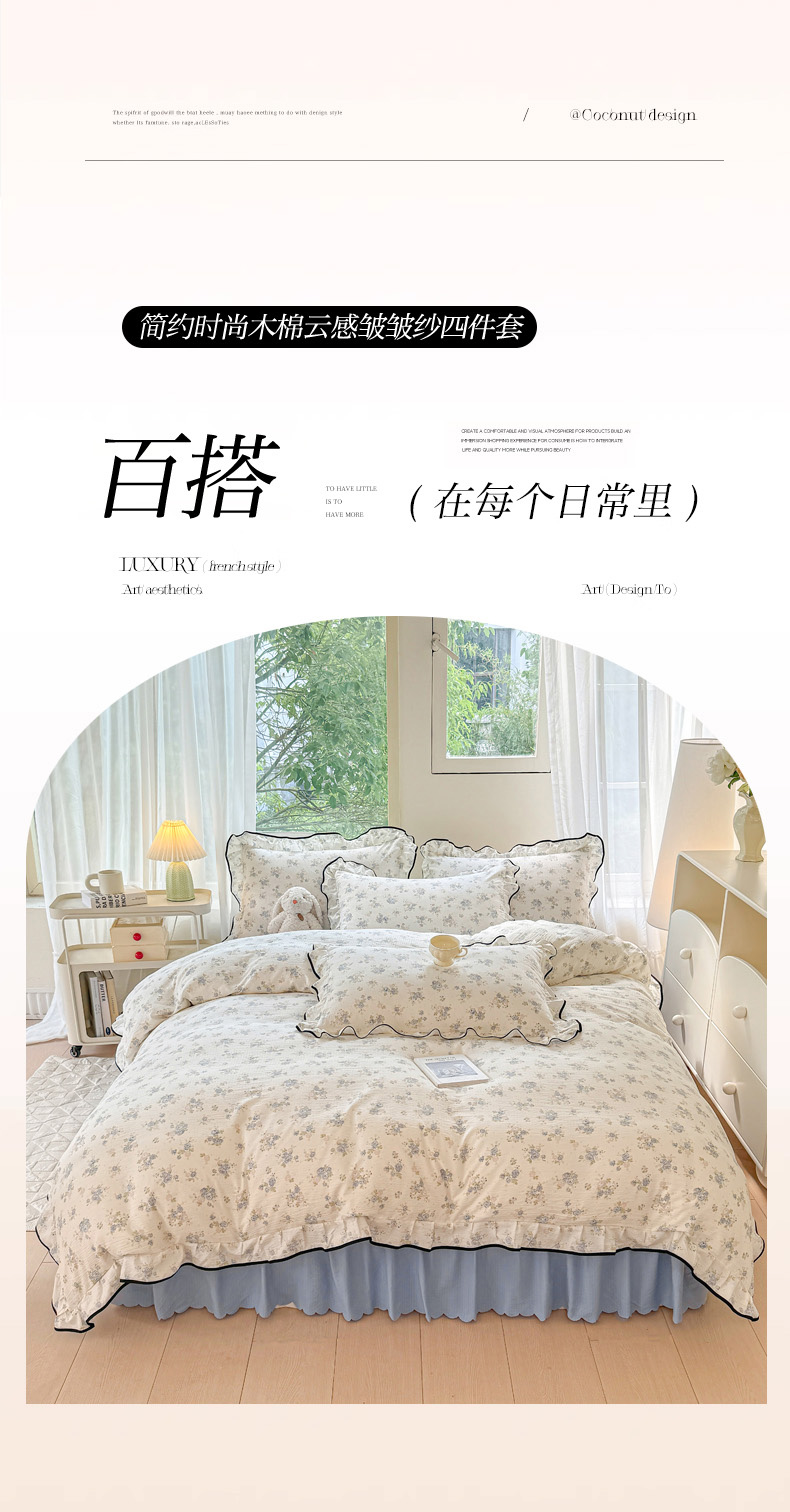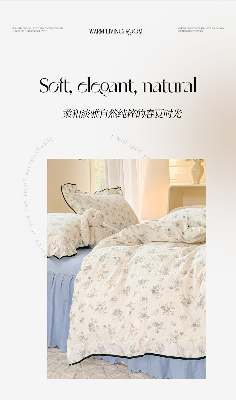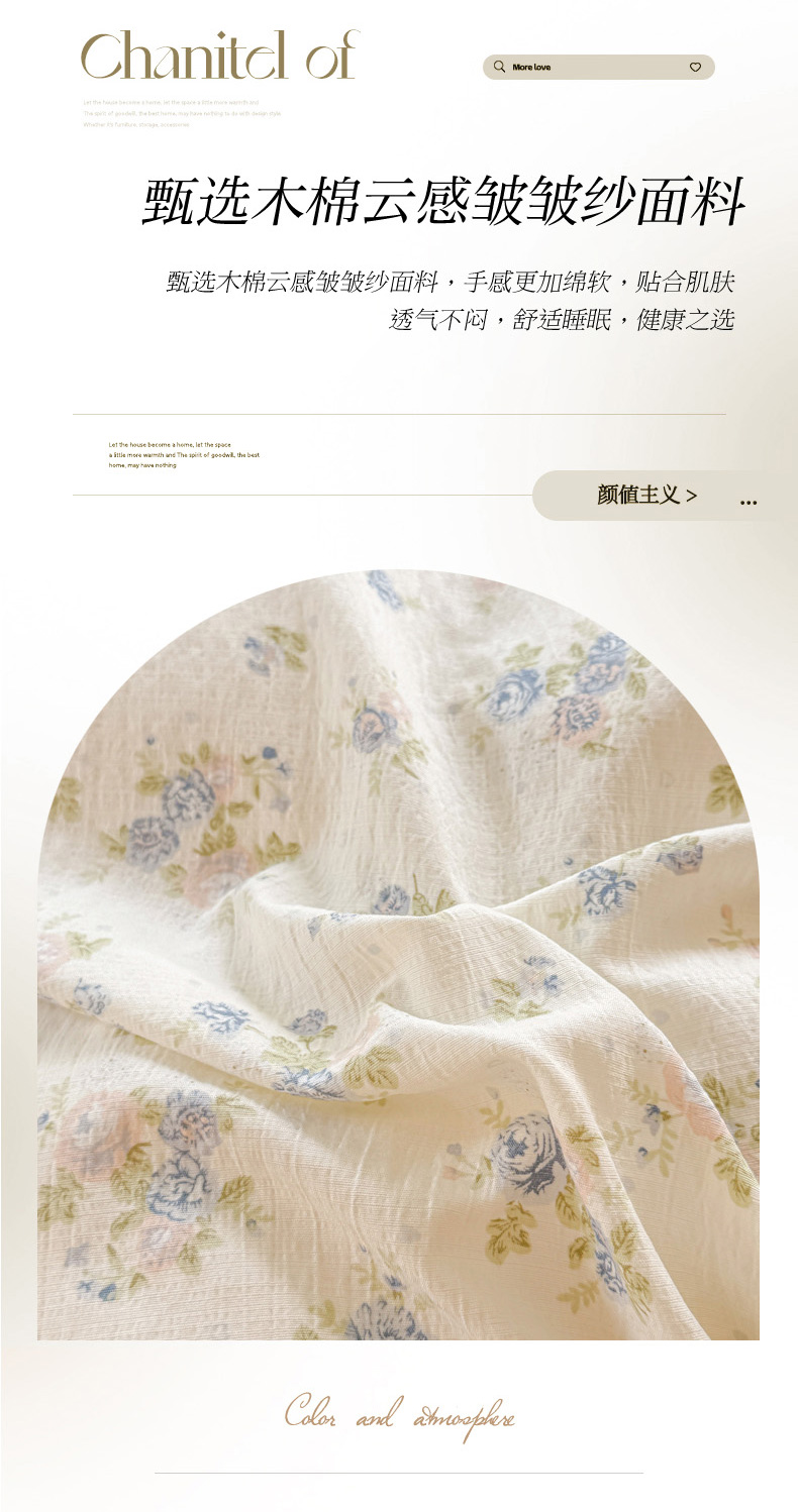 当前位置: 91家纺网 > 商品网购 > 床品套件 > 四件套 > 双层纱四件套 > 上尚居 2025新款简约时尚木棉云感皱皱纱四件套 花季如梦