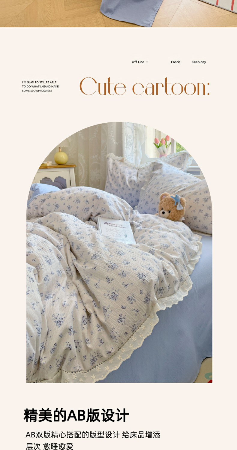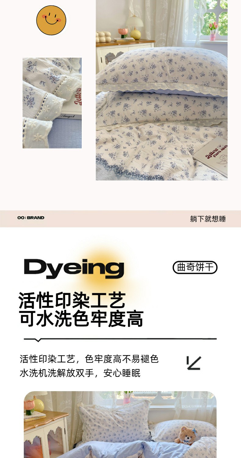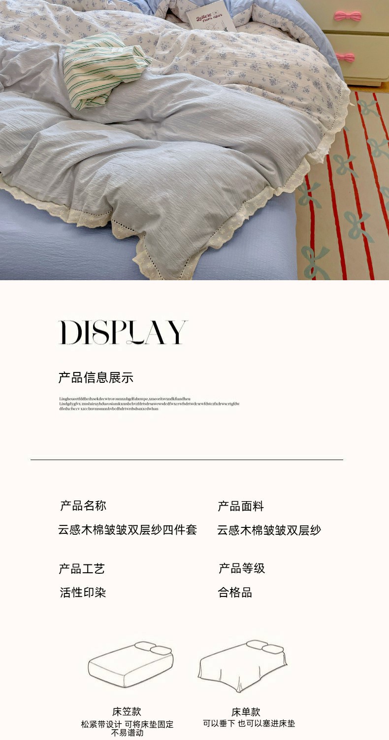 当前位置: 91家纺网 > 商品网购 > 床品套件 > 四件套 > 全棉普通四件套 > 优佳优品 2025新款A类云感木棉皱皱双层纱全棉镂空花边四件套(提供买家秀) 蓝雪花语