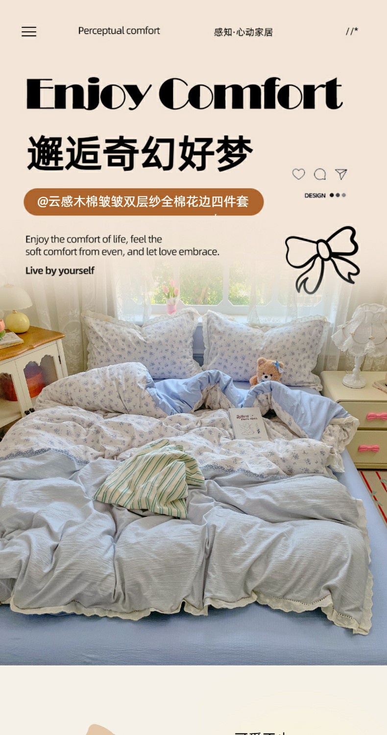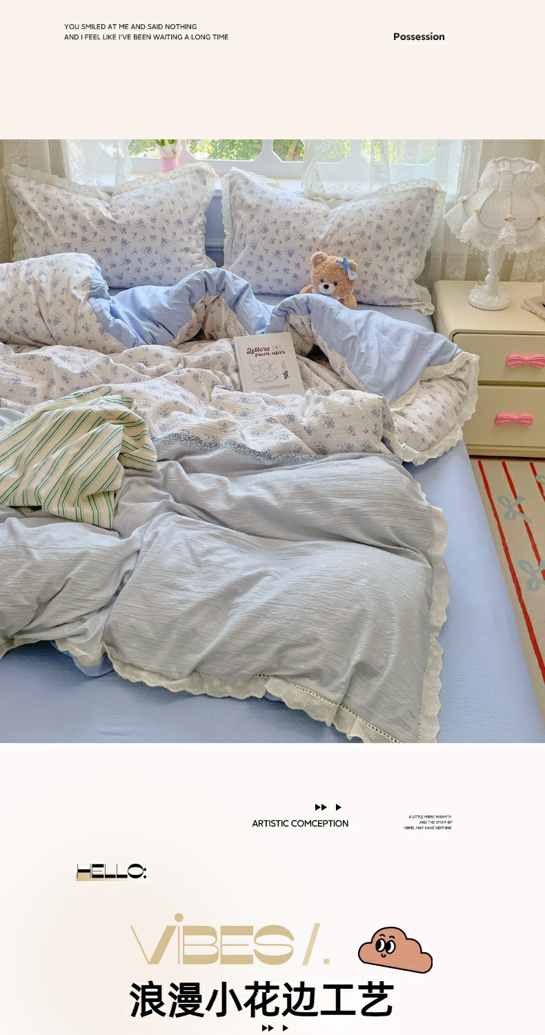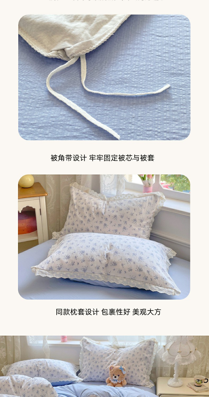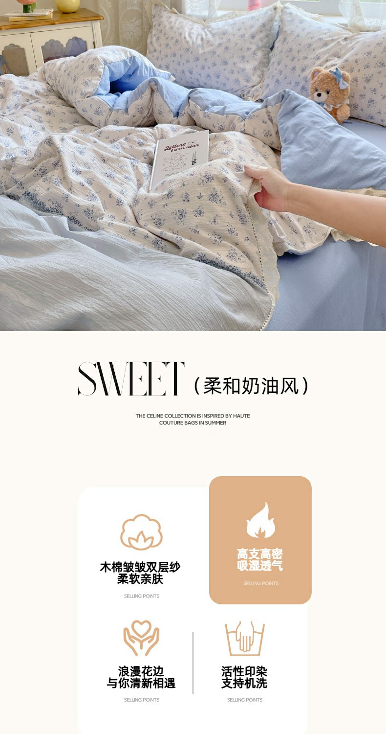 当前位置: 91家纺网 > 商品网购 > 床品套件 > 四件套 > 全棉普通四件套 > 优佳优品 2025新款A类云感木棉皱皱双层纱全棉镂空花边四件套(提供买家秀) 蓝雪花语