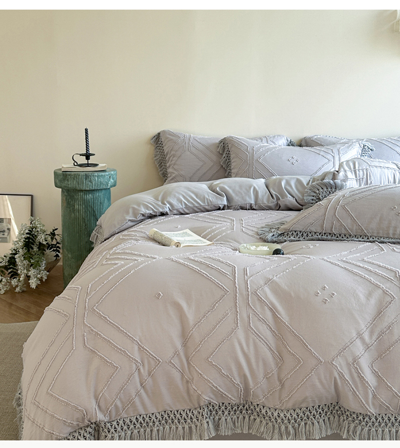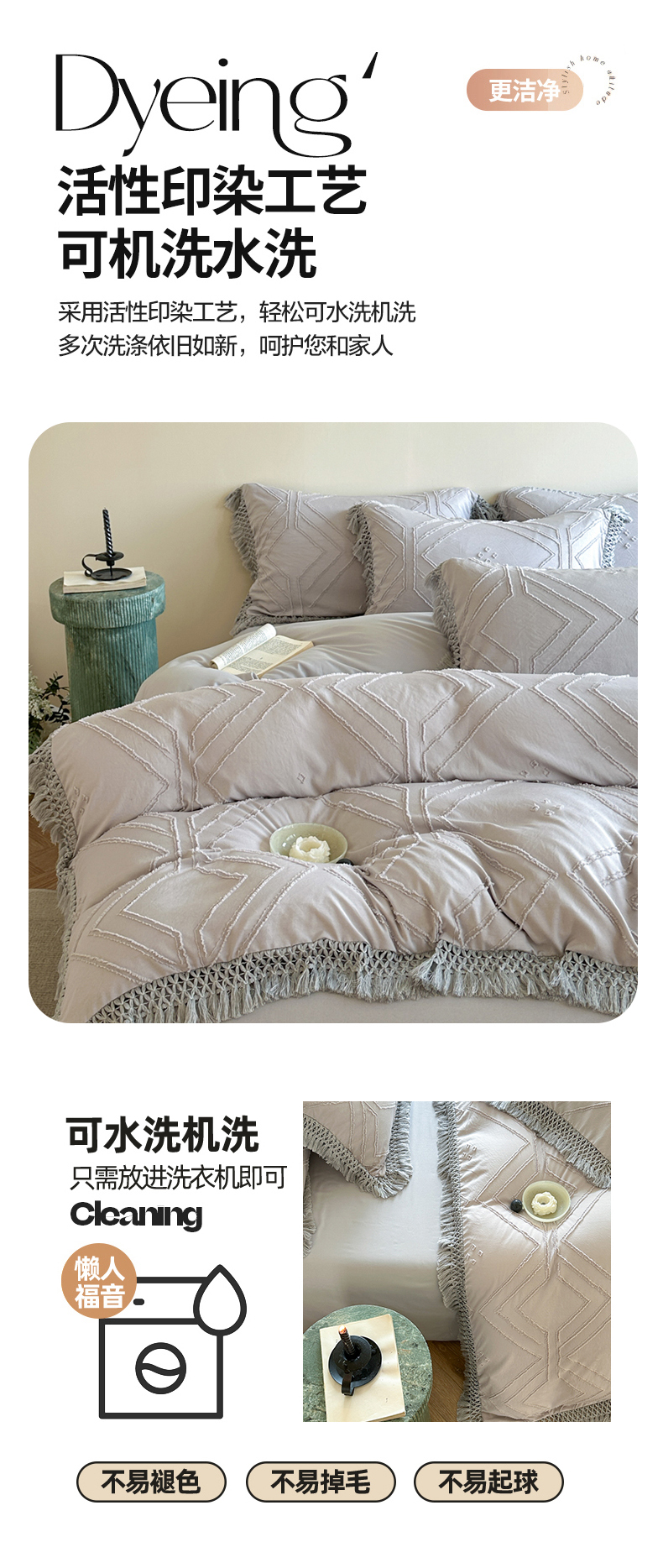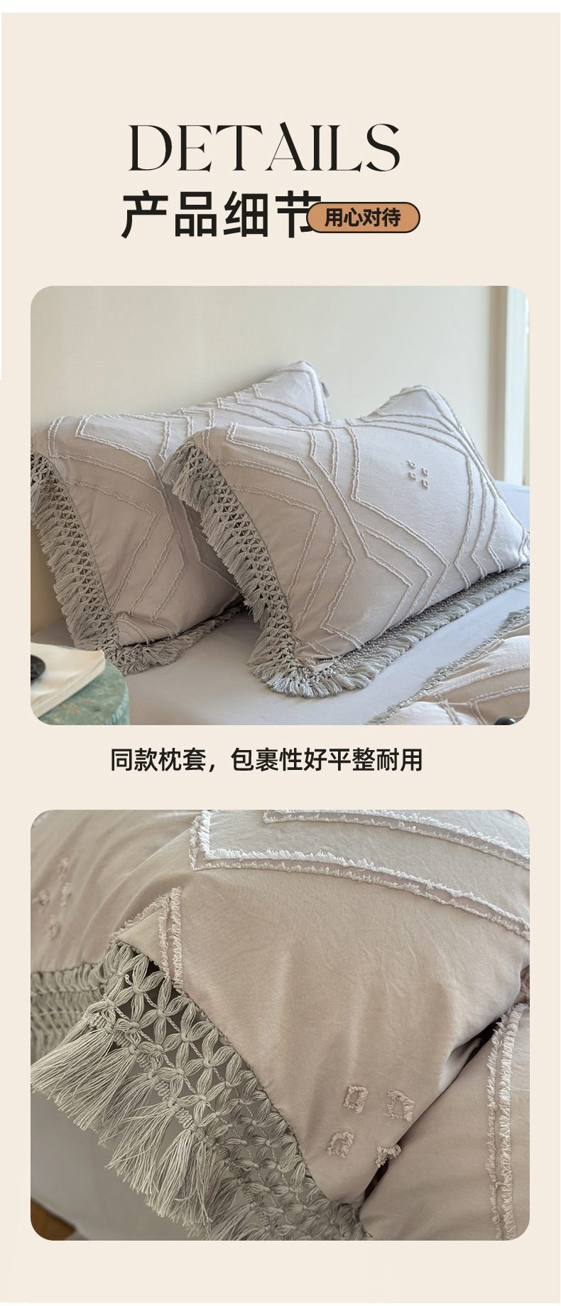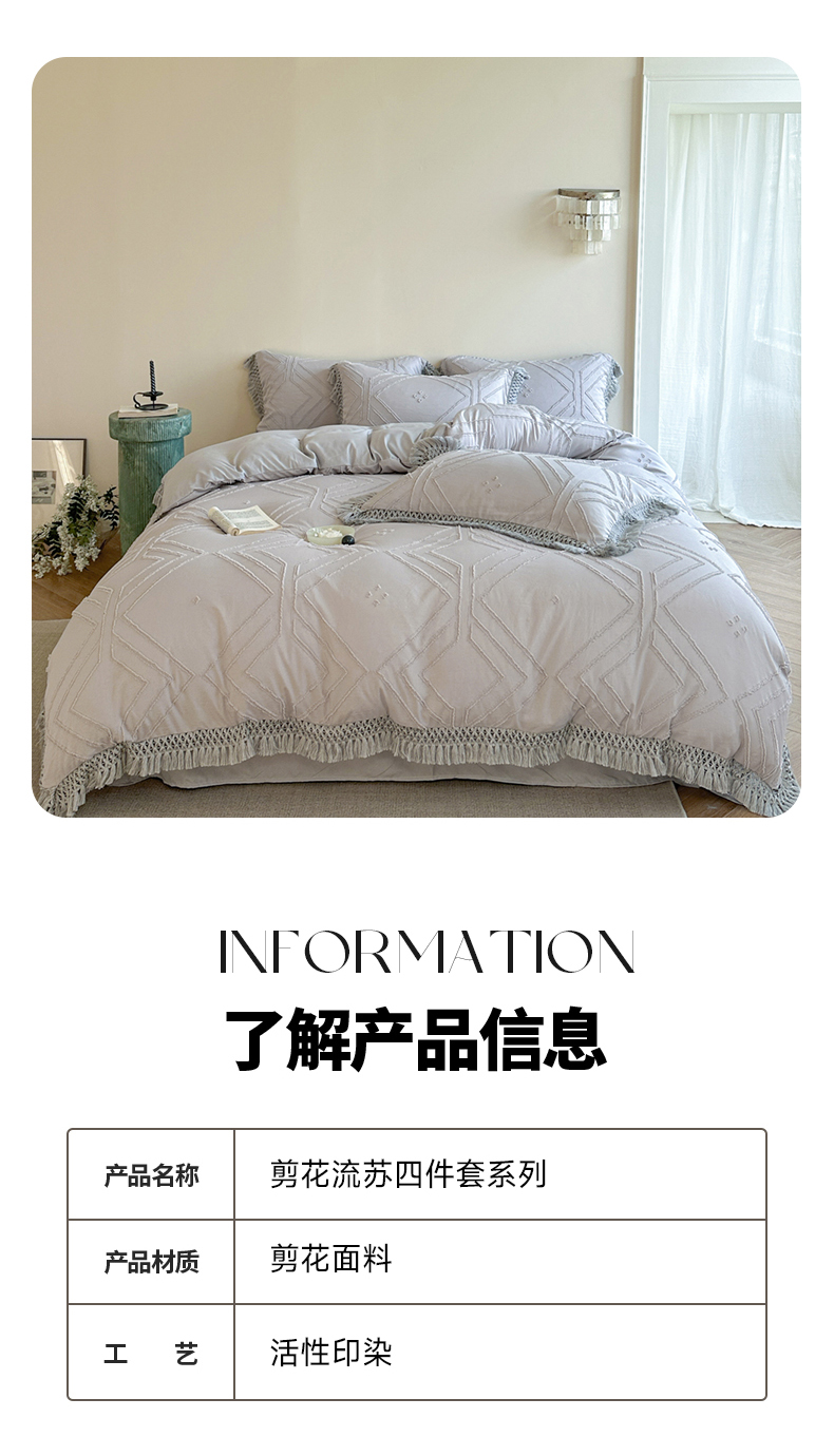 当前位置: 91家纺网 > 商品网购 > 床品套件 > 四件套 > 其它四件套 > 缘生活 2025新款素色简约立体剪花流苏四件套 剪花大方格+流苏浅灰
