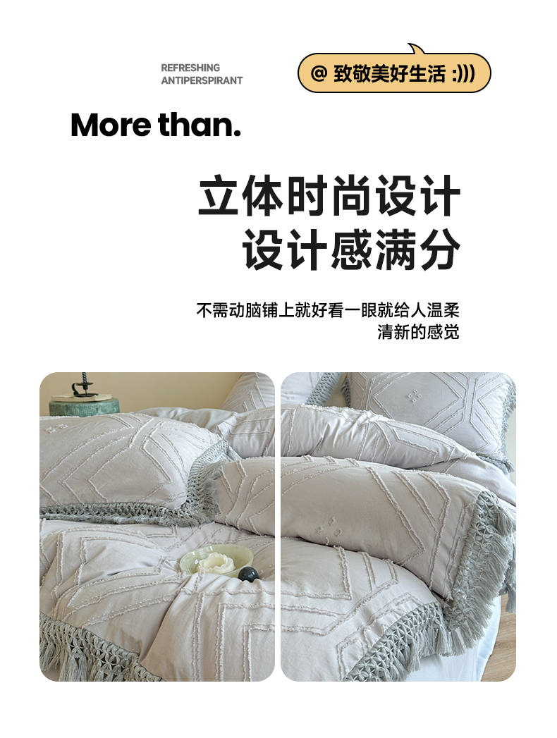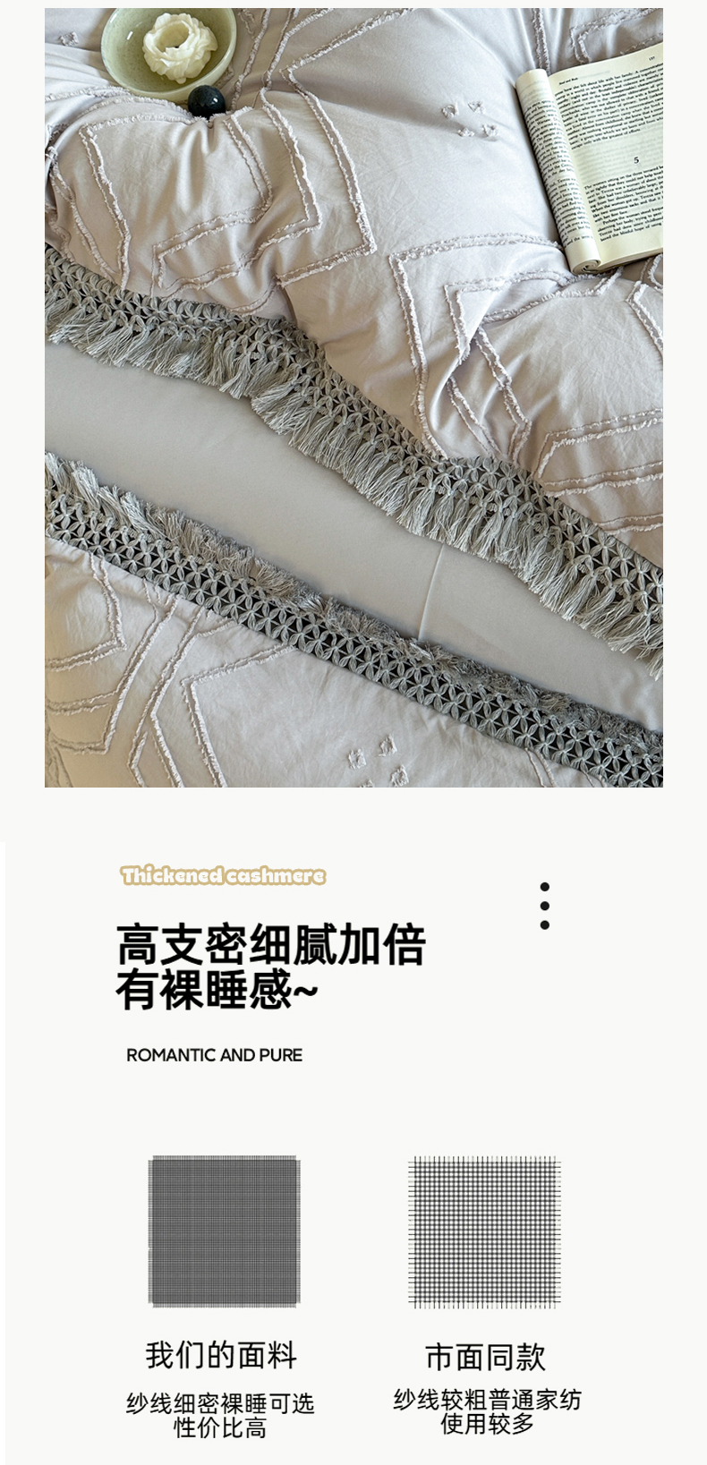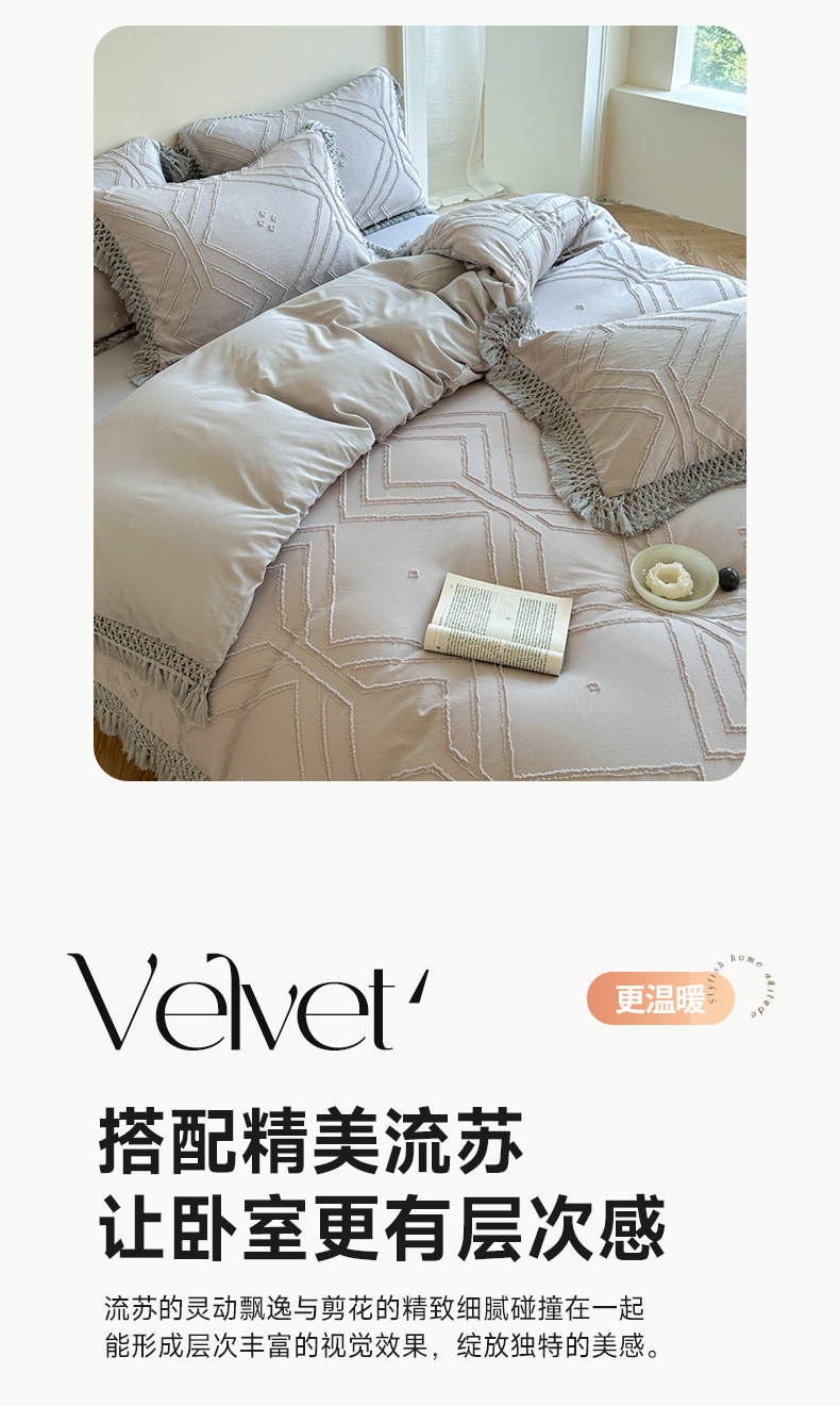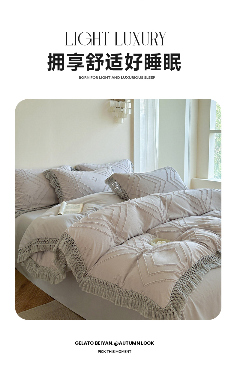 当前位置: 91家纺网 > 商品网购 > 床品套件 > 四件套 > 其它四件套 > 缘生活 2025新款素色简约立体剪花流苏四件套 剪花大方格+流苏浅灰