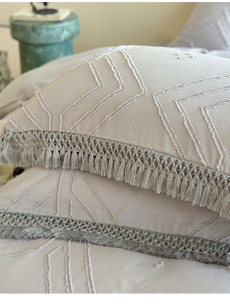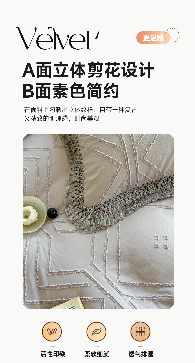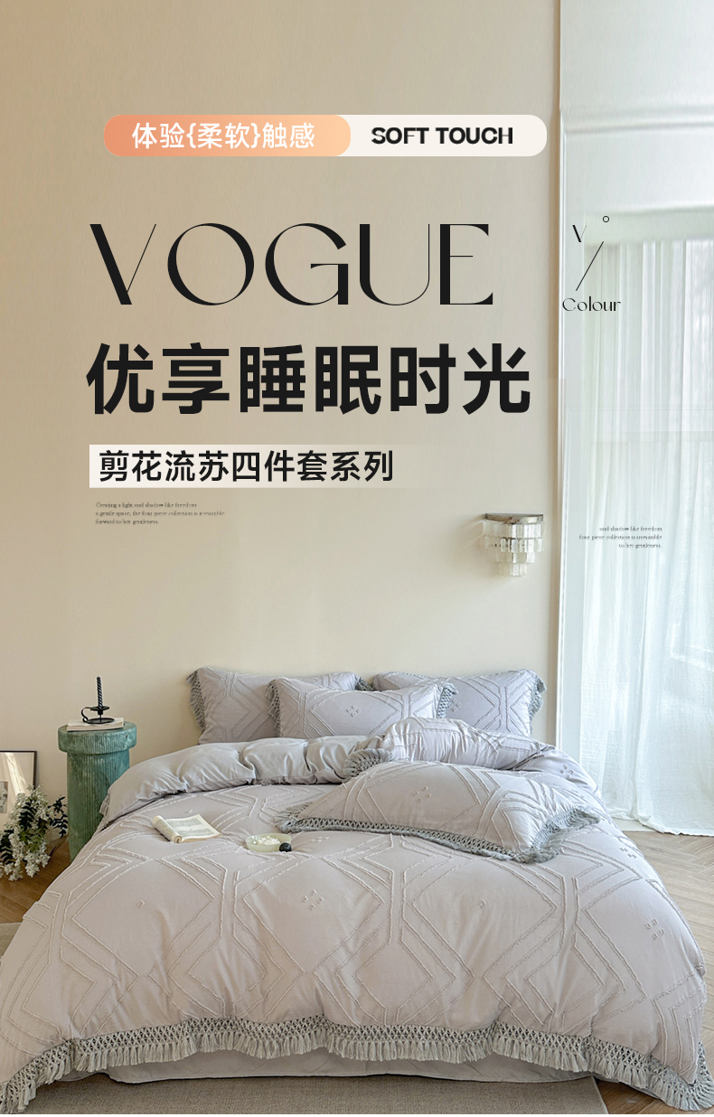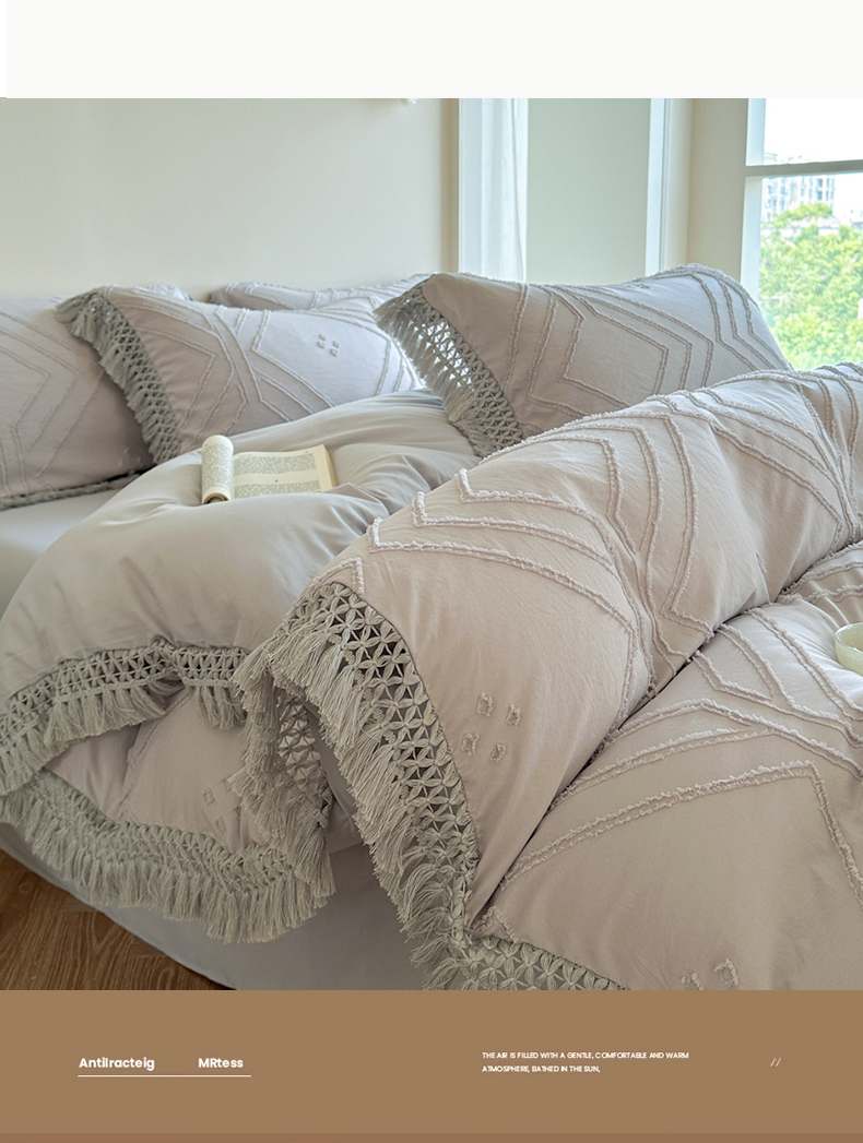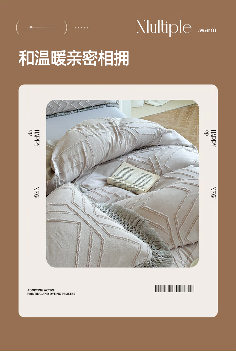 当前位置: 91家纺网 > 商品网购 > 床品套件 > 四件套 > 其它四件套 > 缘生活 2025新款素色简约立体剪花流苏四件套 剪花大方格+流苏浅灰