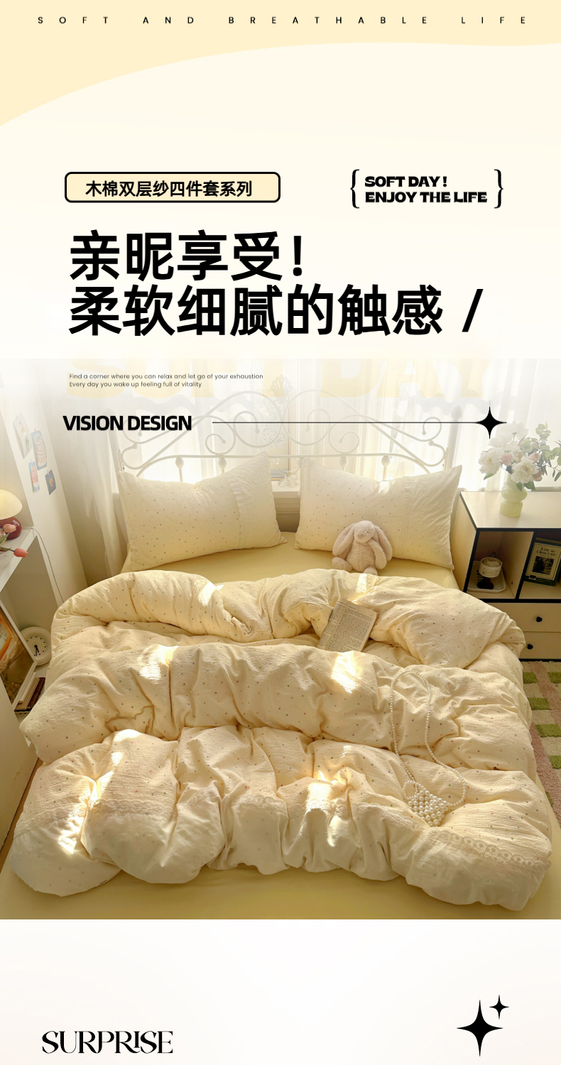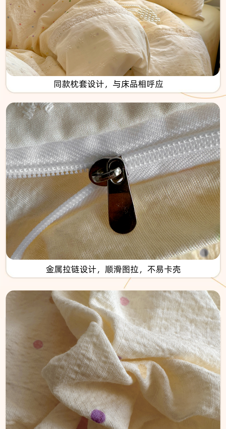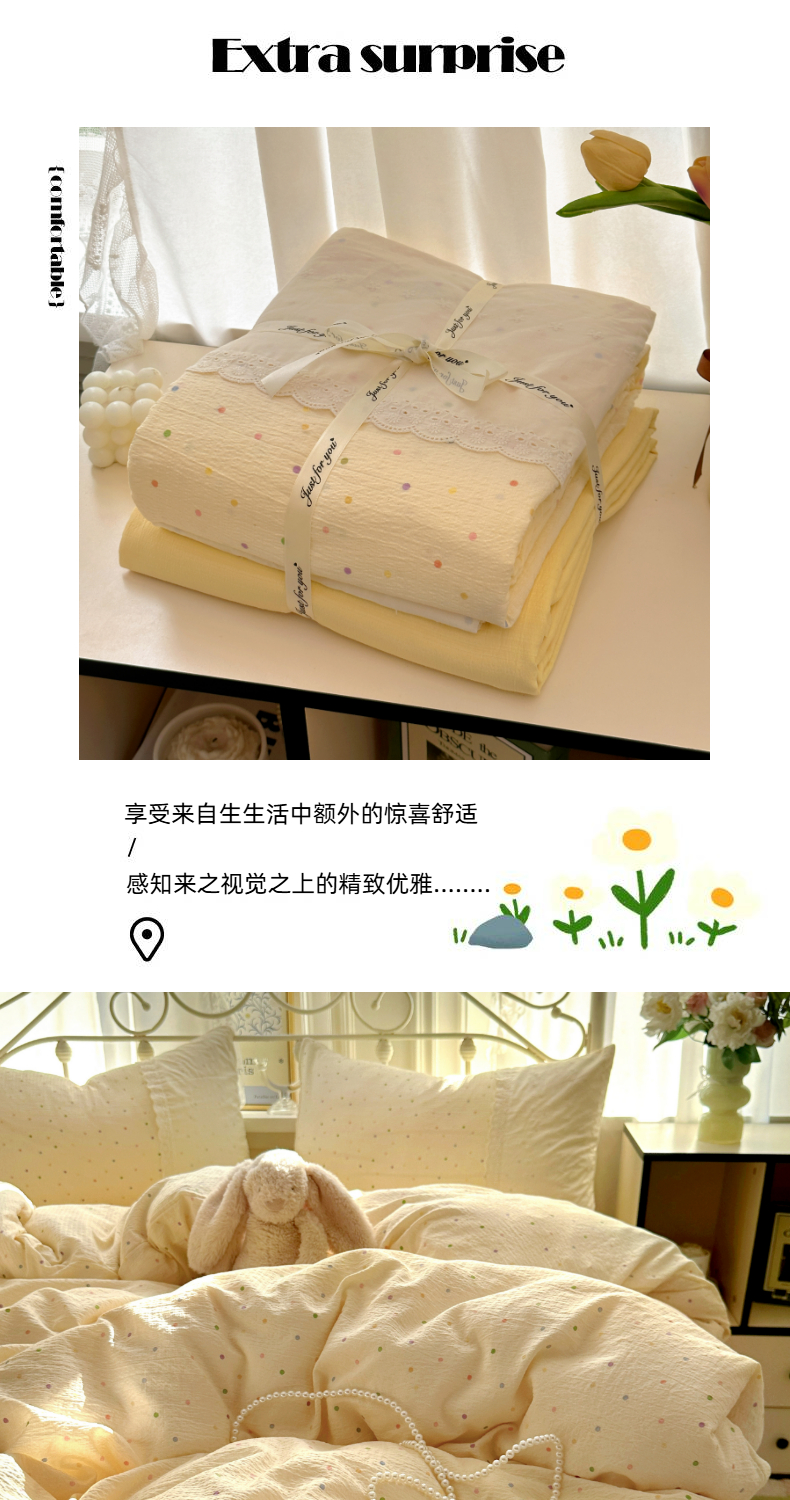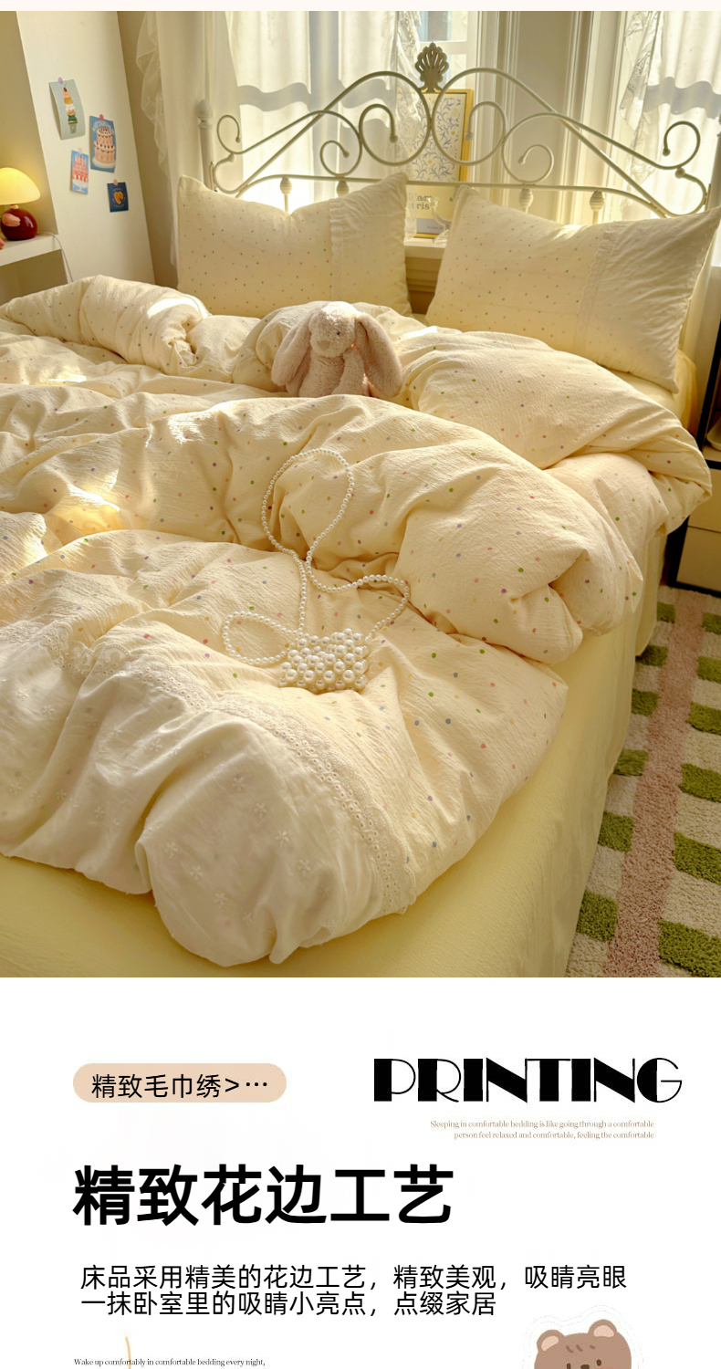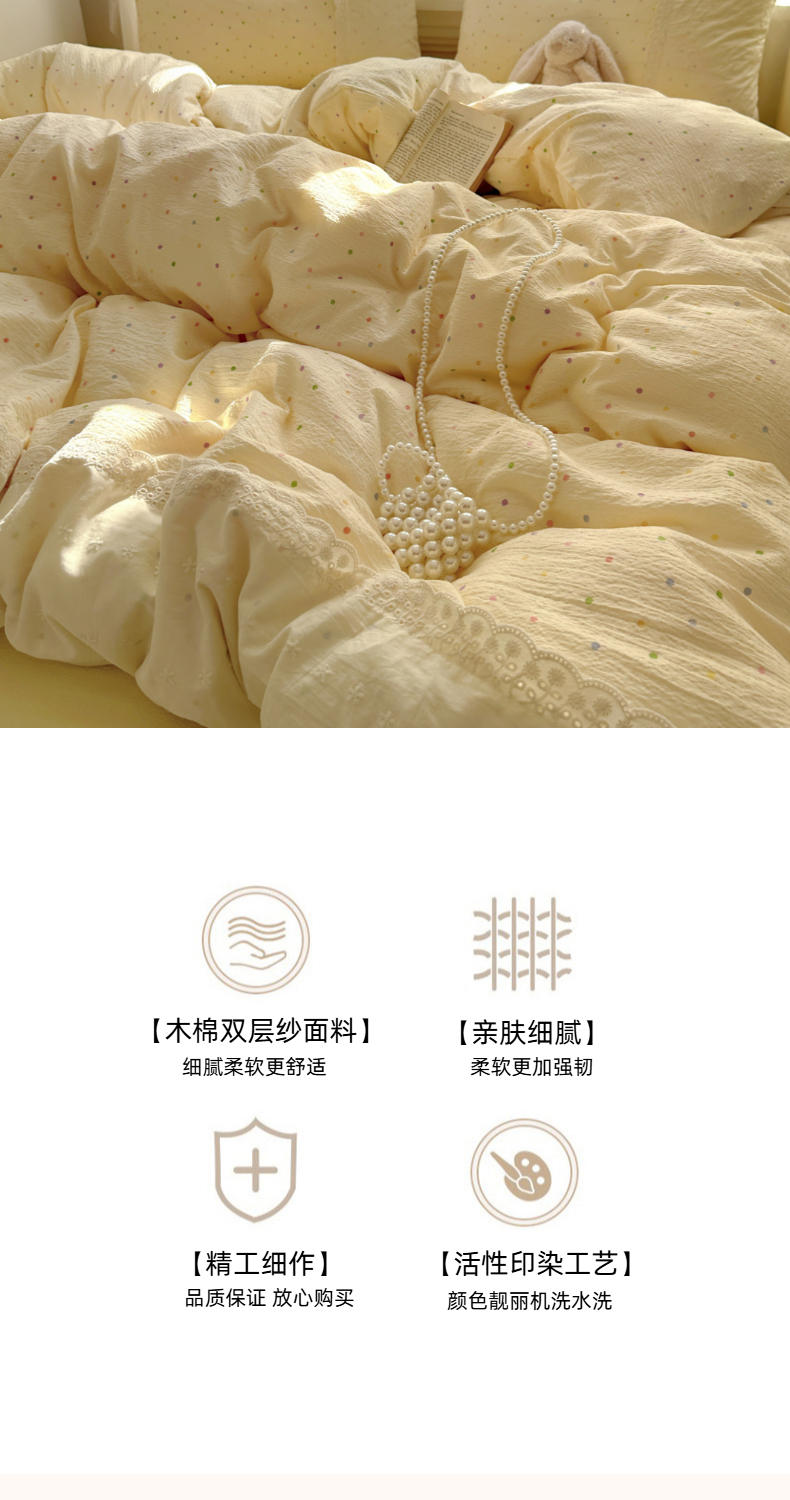 当前位置: 91家纺网 > 商品网购 > 床品套件 > 四件套 > 双层纱四件套 > 思诺羽床笠 2025新款A类法式小清新皱皱纱花边蕾丝水洗棉床上四件套宿舍床笠三件套 奶油波点