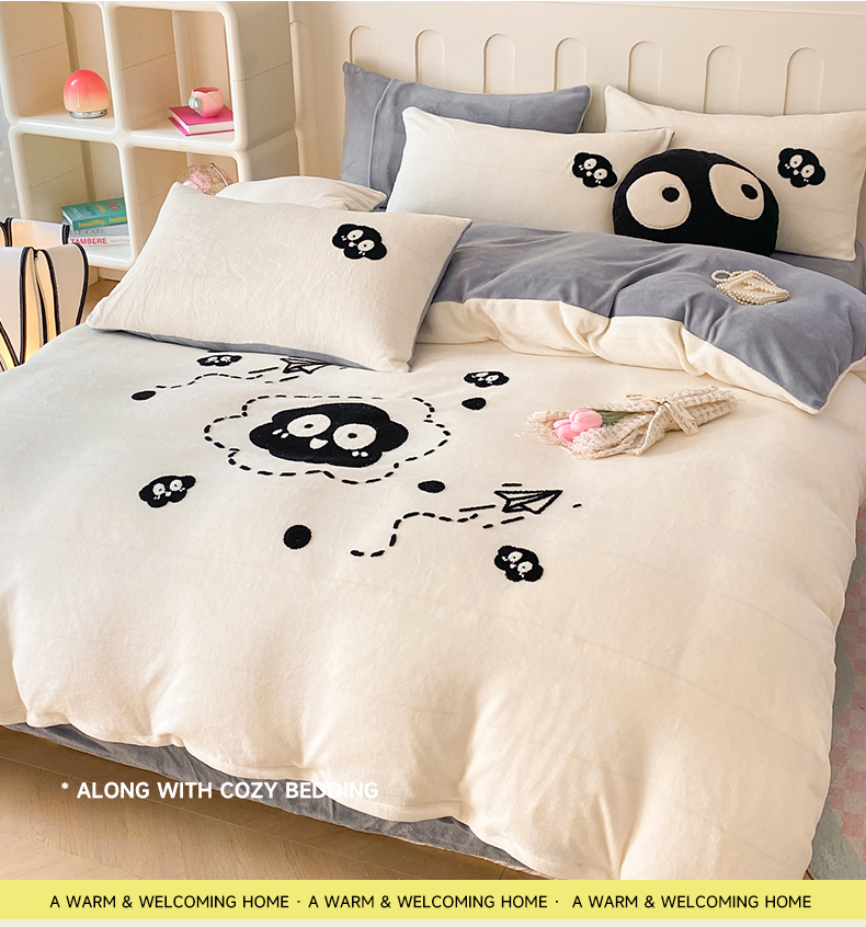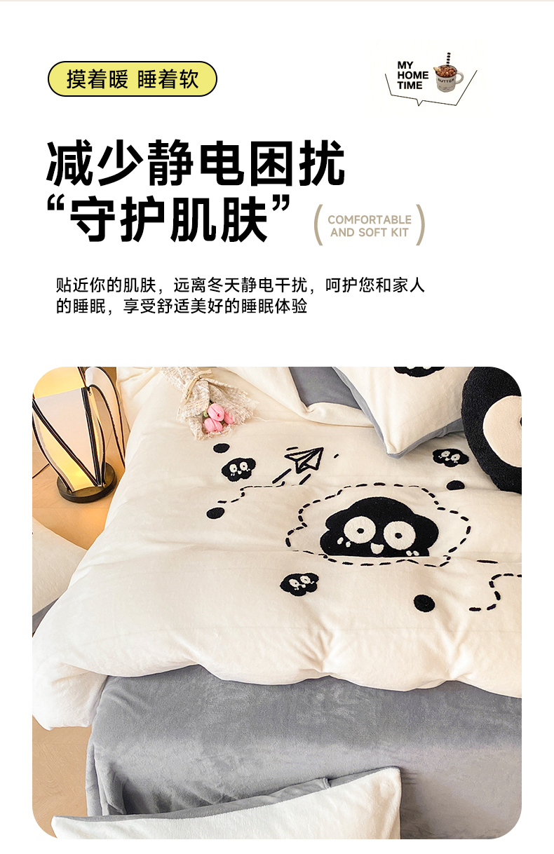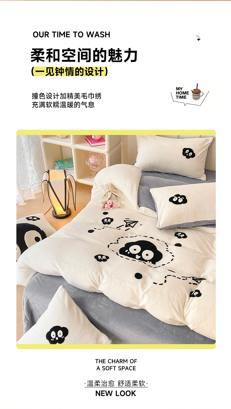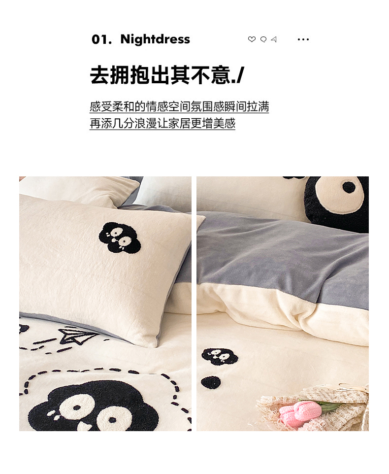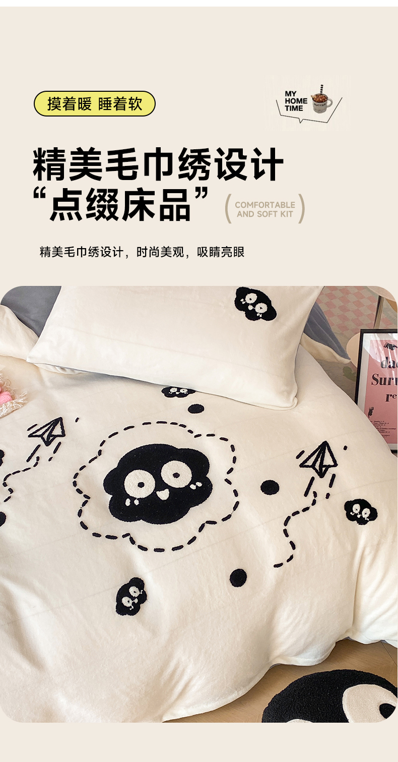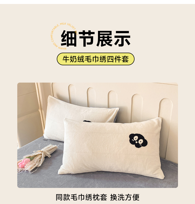 商品名称:N先生+V 13814689556 发大图/买家秀 2025秋冬新款小清新牛奶绒毛巾绣四件套-小煤球 白灰