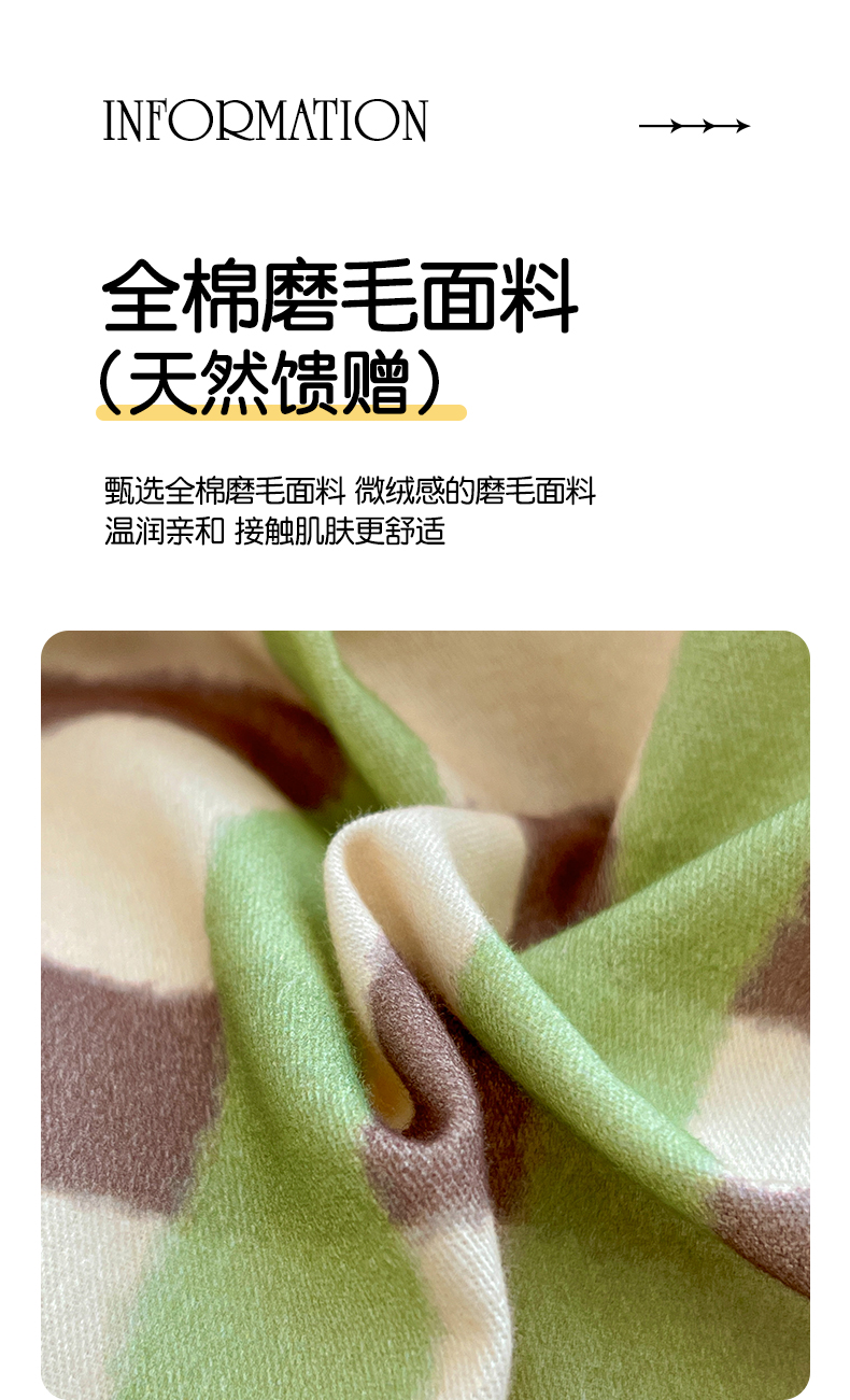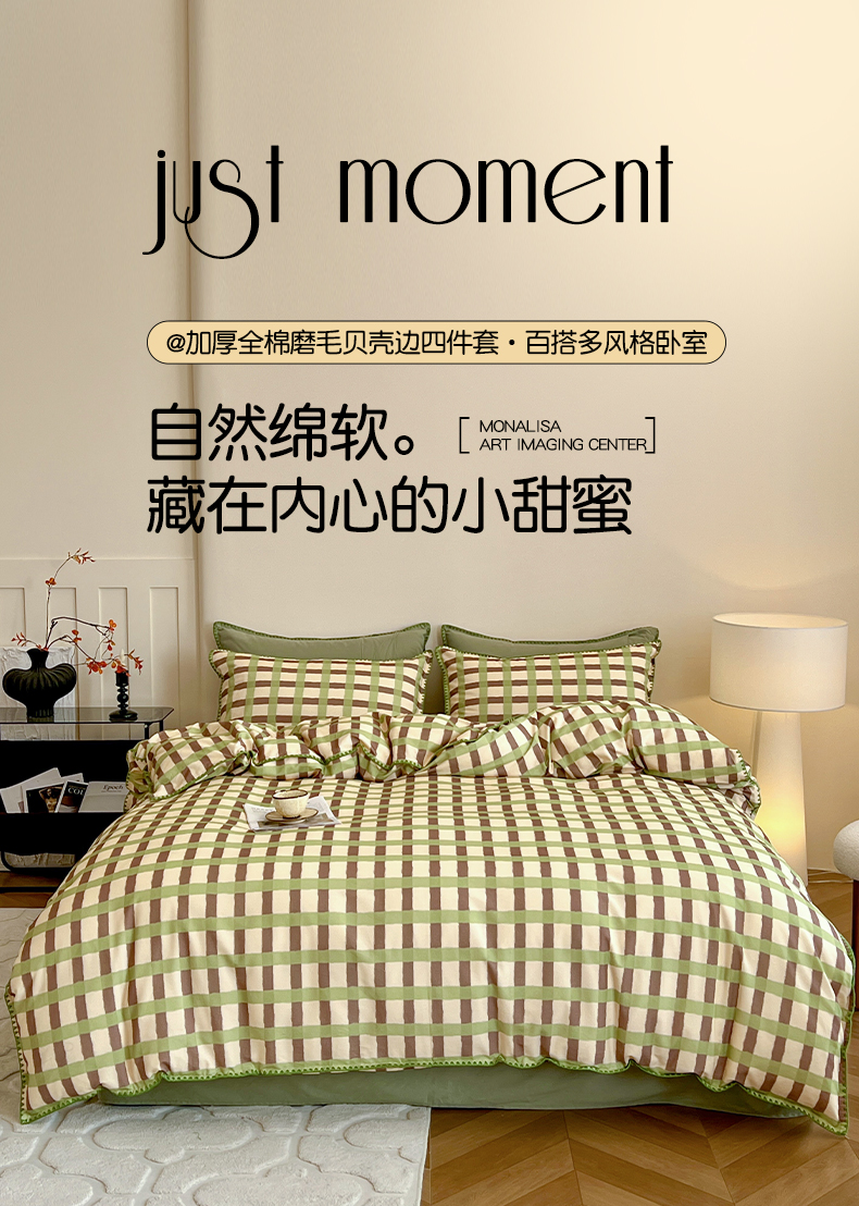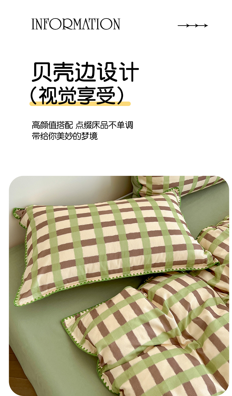 商品名称:品乐家纺 2025秋冬全棉加厚磨毛贝壳边四件套 格言-绿