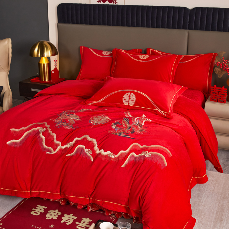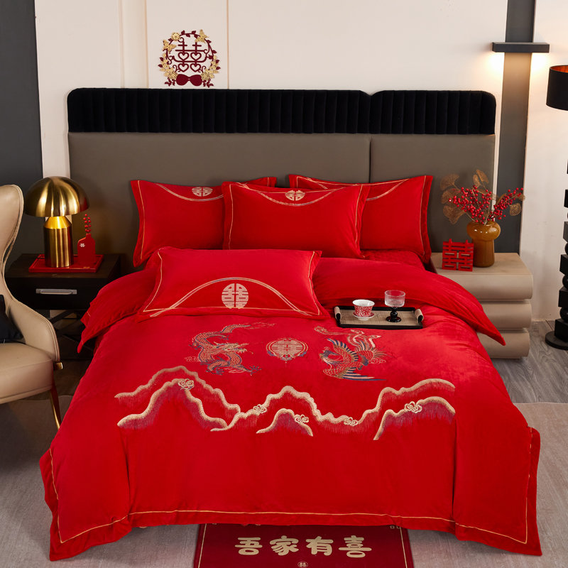 青竹苑 2025新款婴儿绒刺绣婚庆四件套 龙凤情缘