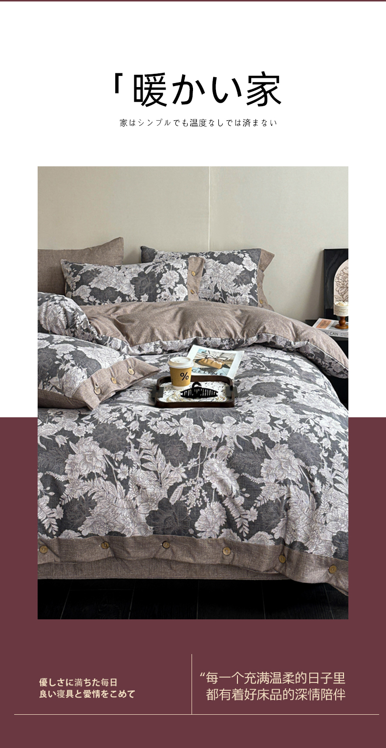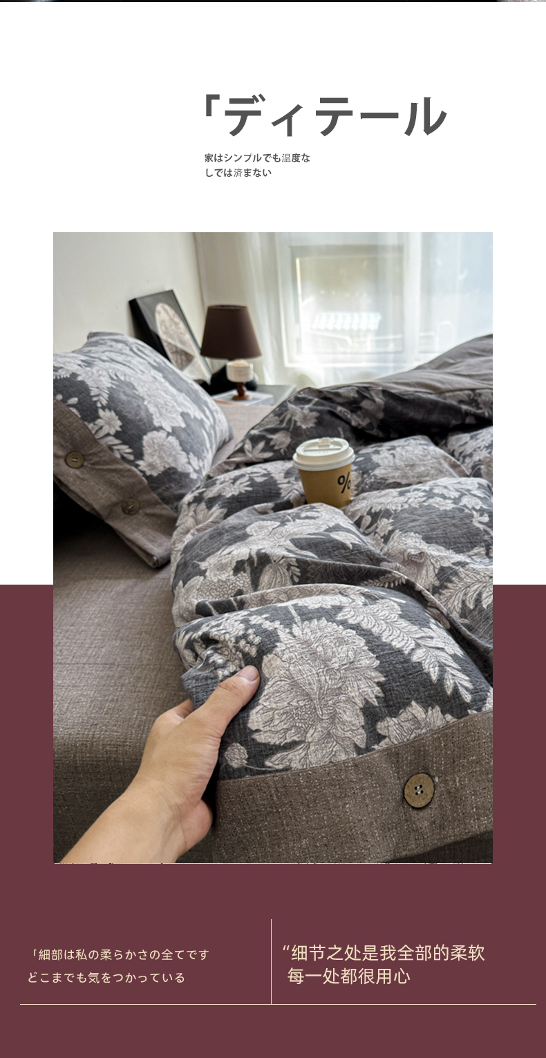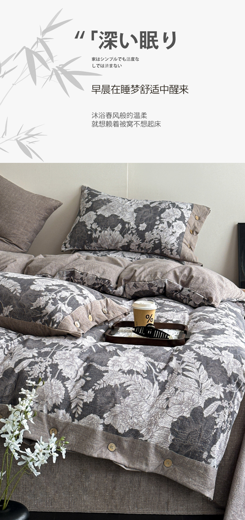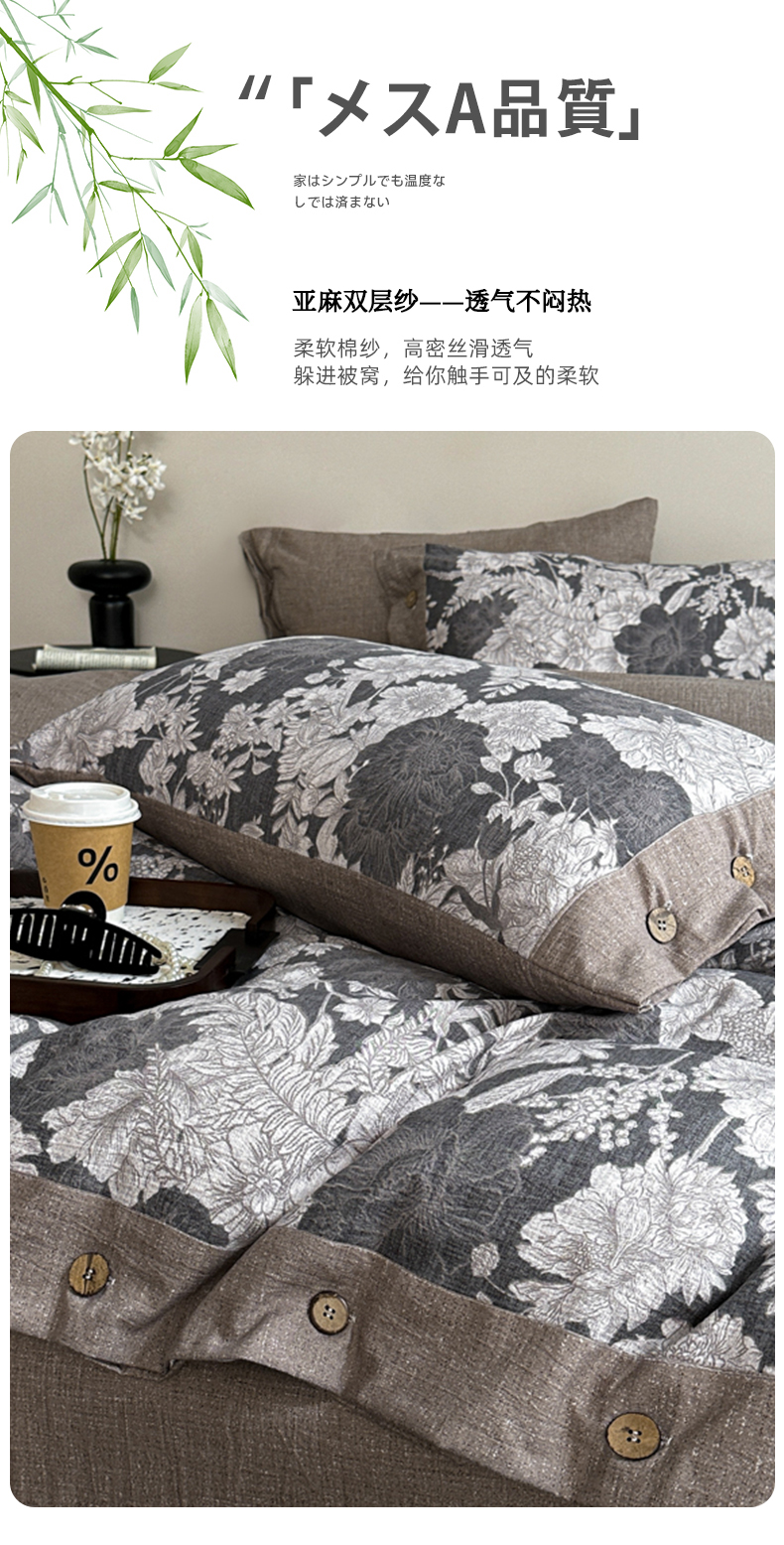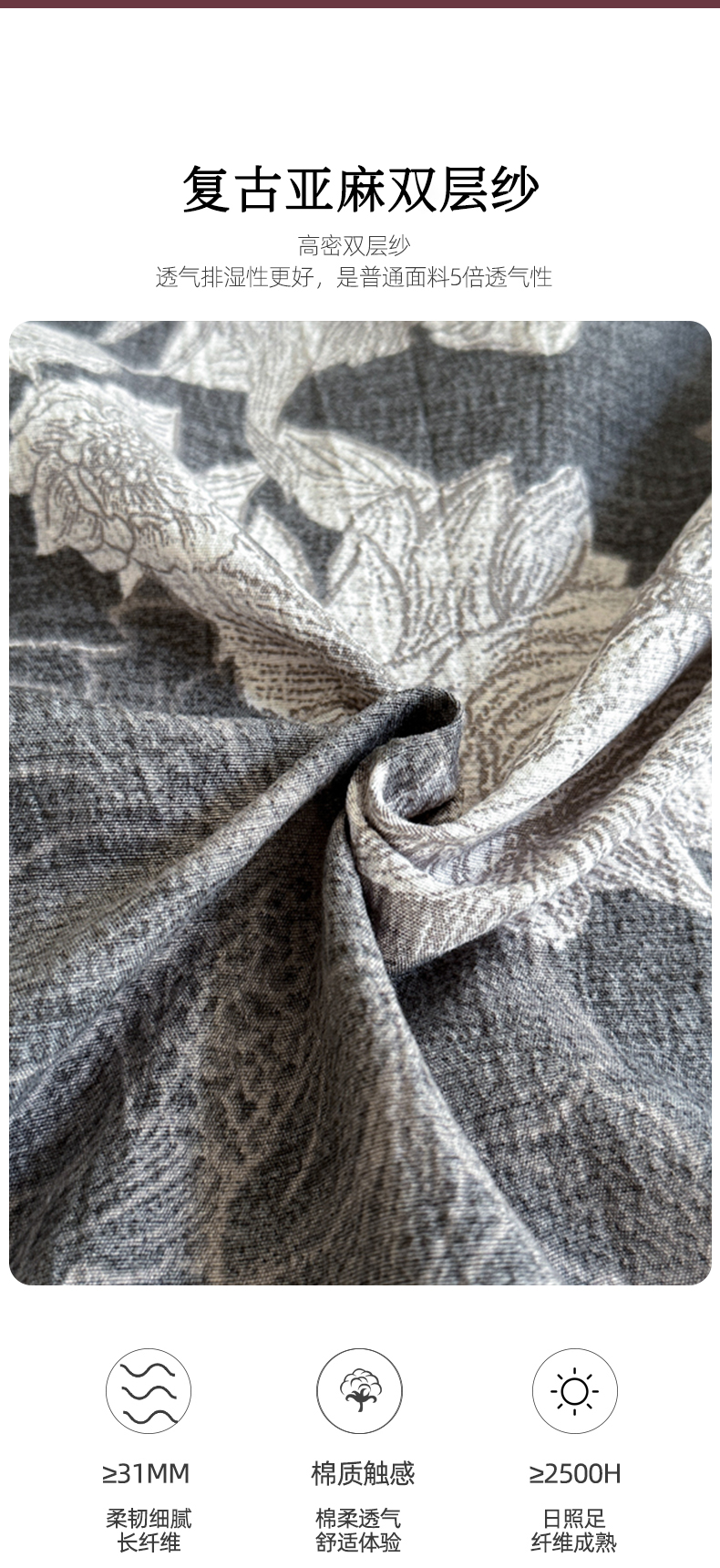 商品名称:七里香 2025秋冬新款A类加厚高克重亚麻复古风双层纱印花四件套 浮绘花影