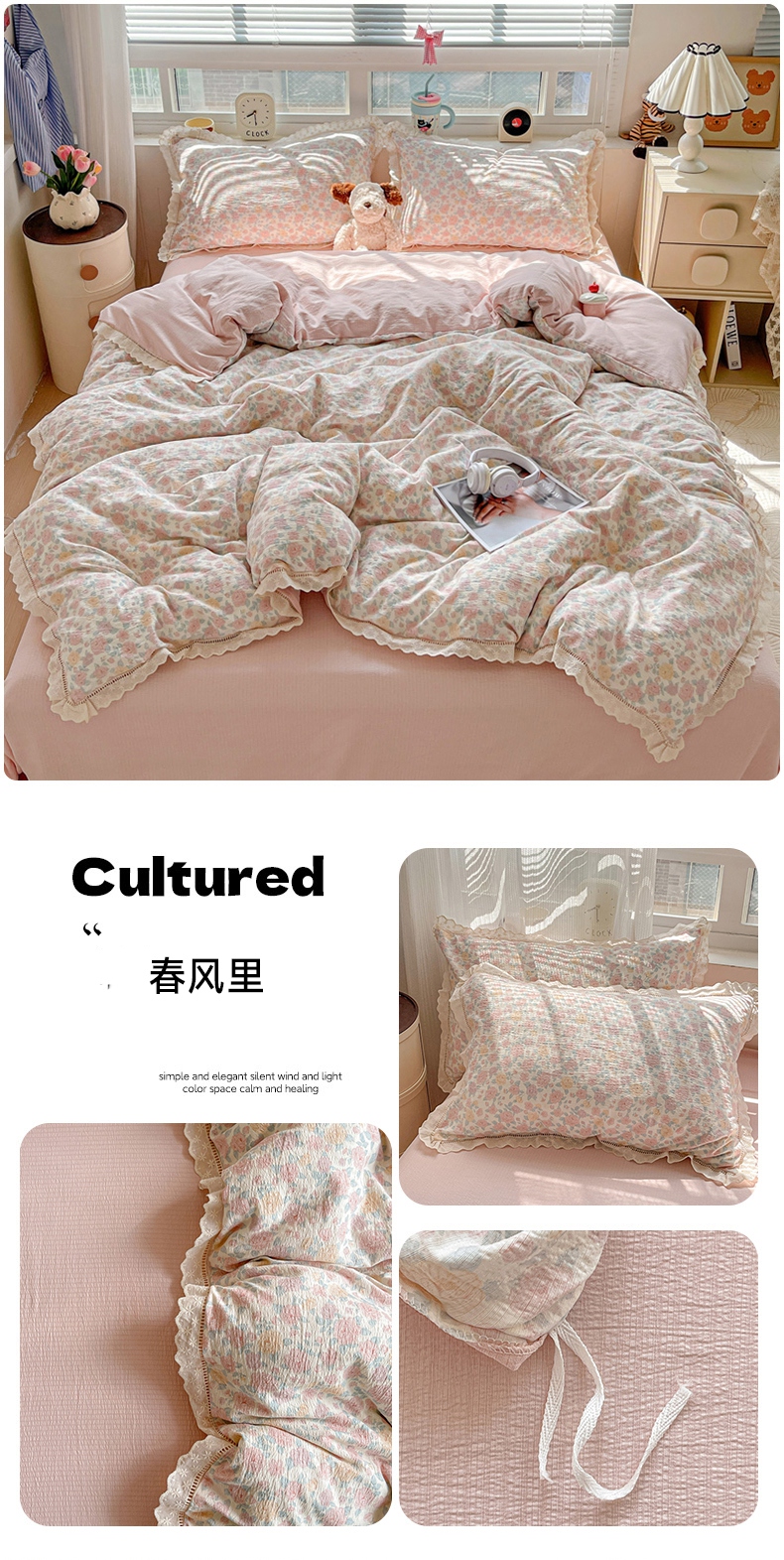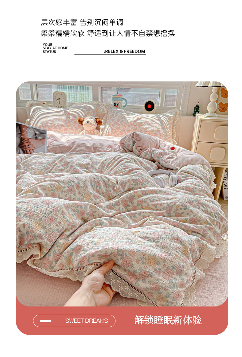 (总)梦纤绒 2025新款云感木棉皱皱双层纱全棉花边四件套,白茶-绿,百福蓝,薄荷微凉,初恋,春风里,春晓,豆蔻,蝴蝶梦,花园兔,可颂,蜡笔画,莱茵河畔,兰黛,山野栀子,素颜,太妃糖,桃花诺,田园拾趣-黄,小黑兔,心动,遇见,芝士奶酪,紫爱心,紫苏,组合图(仅展示)