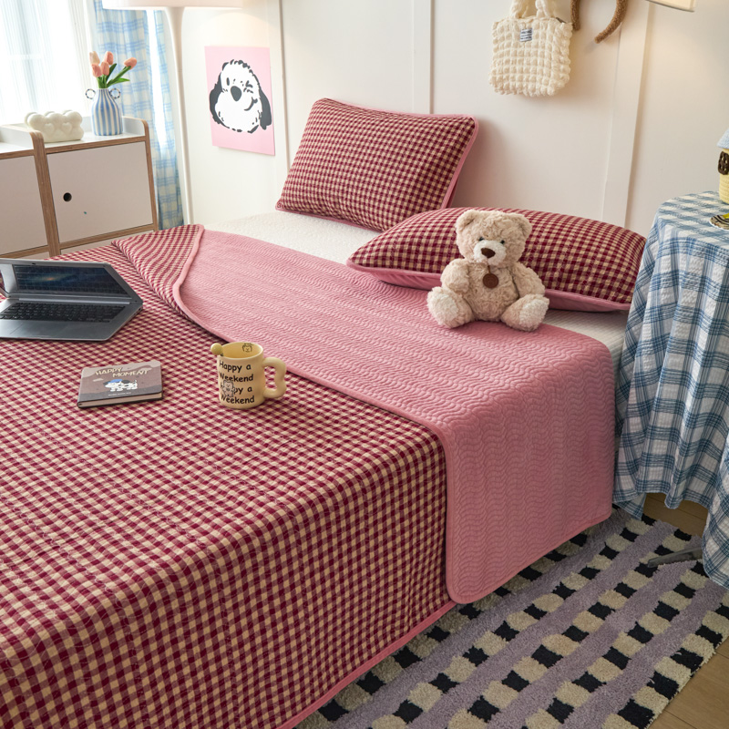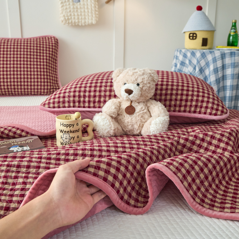 • 91家纺网 家纺一手货源 找家纺 沐纯家居 2025新款色织水洗棉棉绒(大豆纤维填充)床盖三件套 豆丁-红格