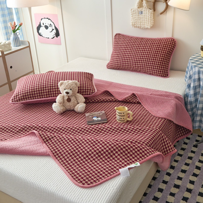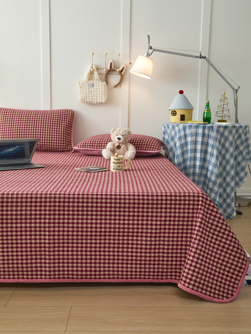 沐纯家居 2025新款色织水洗棉棉绒(大豆纤维填充)床盖三件套 豆丁-红格