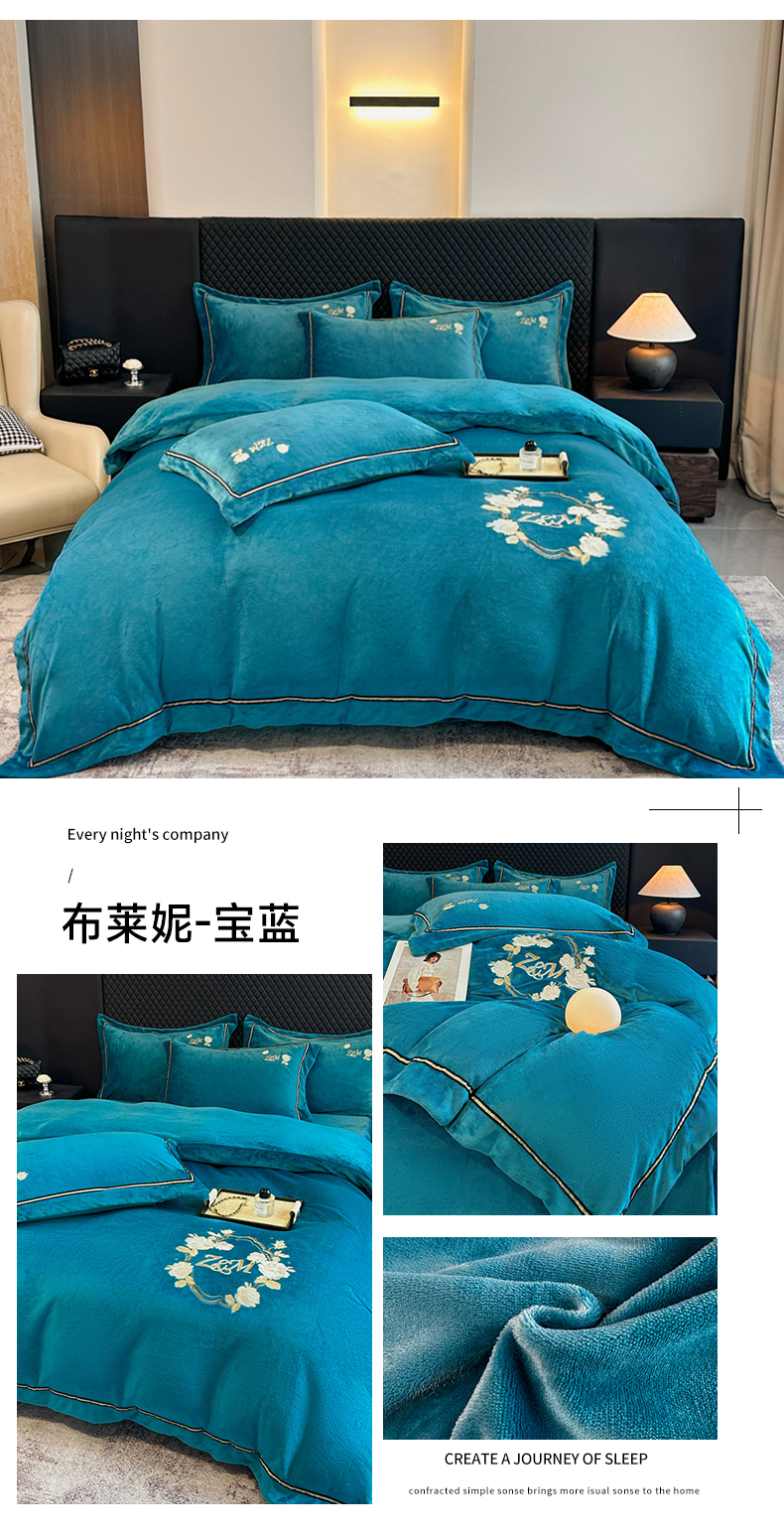 (总)诺梵家纺 2025新款牛奶绒绣花绒四件套,芳华-宝蓝,芳华-豆沙,芳华-湖兰,芳华-米白,芳华-抹茶绿,伊莉莎-米白,伊莉莎-抹茶绿