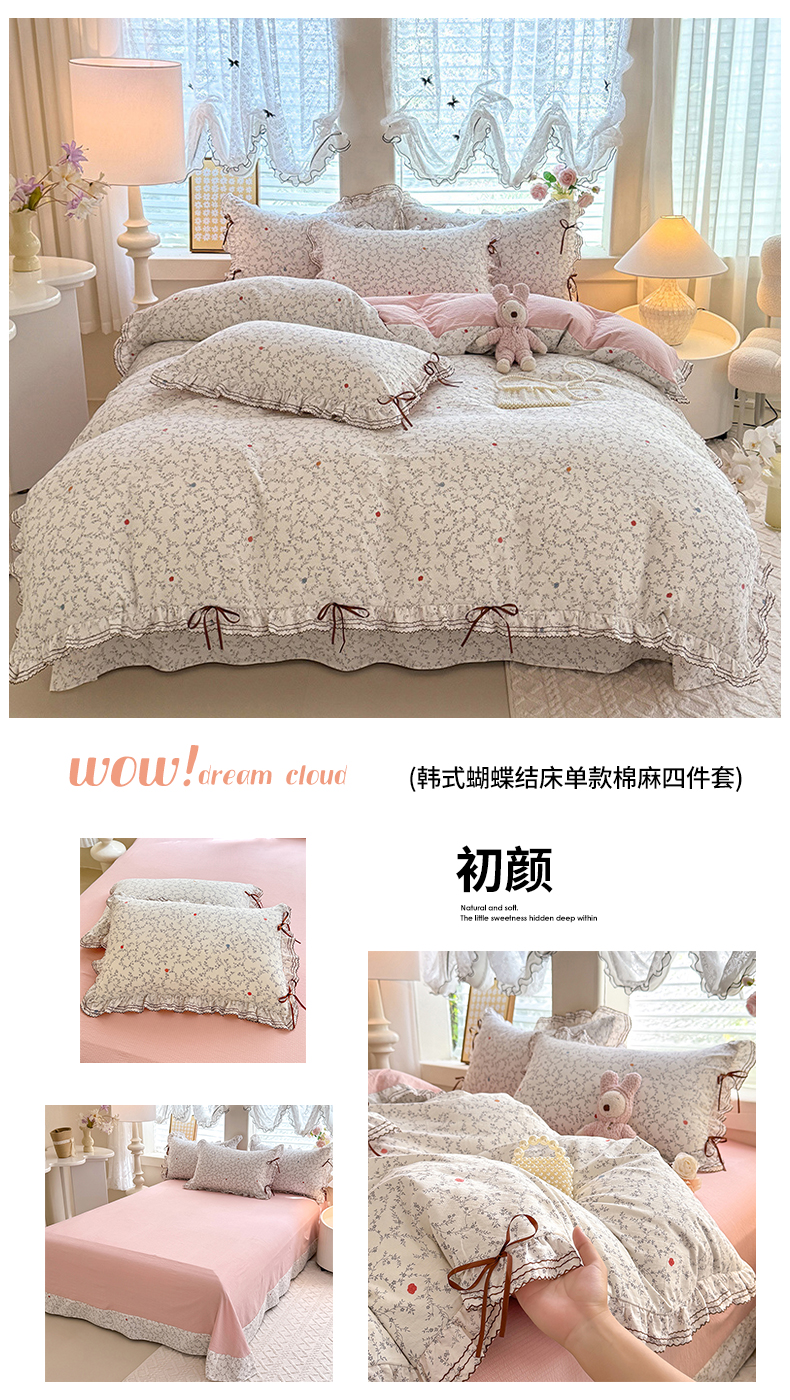 商品名称:韩约家纺 2025新款1韩式蝴蝶结加厚床单款棉麻四件套 花语