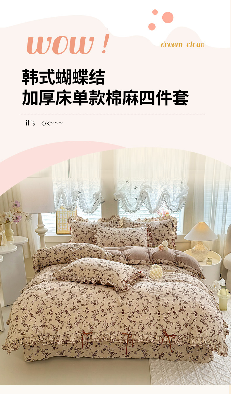 韩约家纺 2025新款1韩式蝴蝶结加厚床单款棉麻四件套 雅致