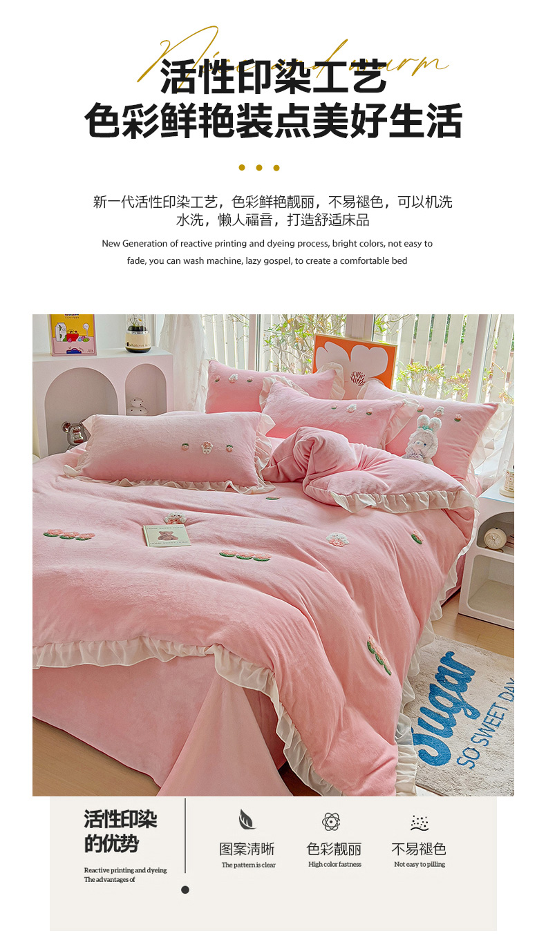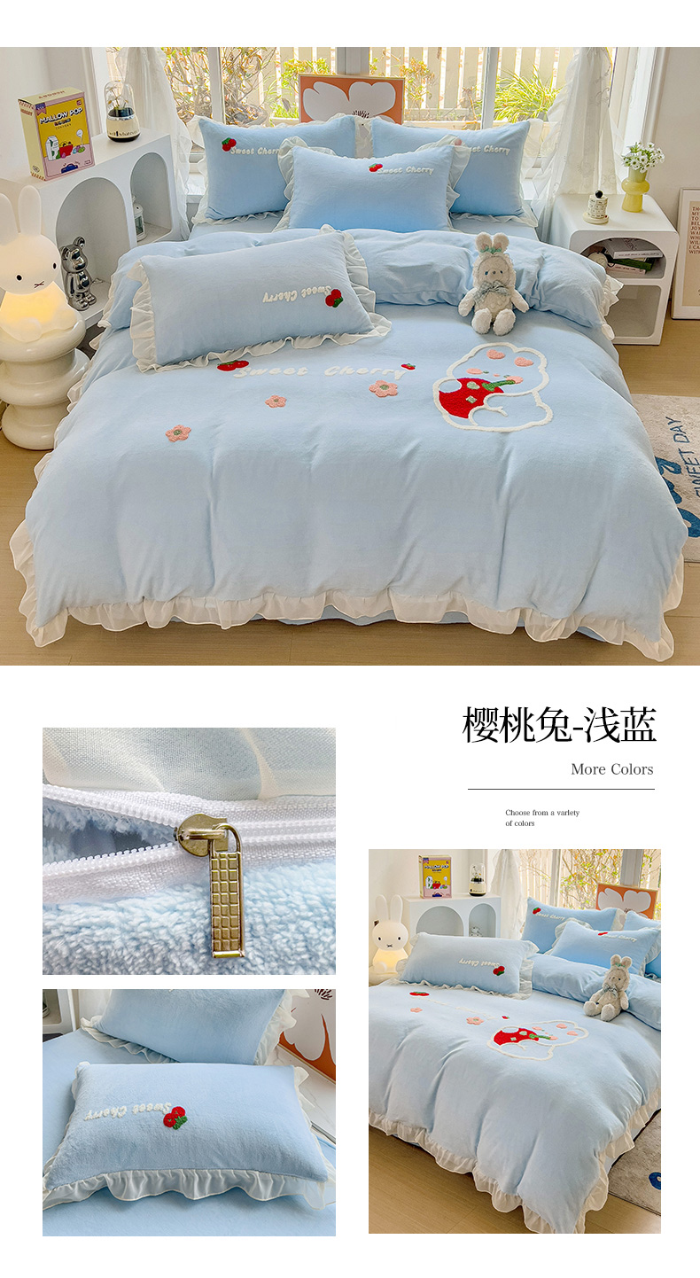• 91家纺网 家纺一手货源 找家纺 眷恋家纺 2025新款韩版毛巾绣小蕾丝荷叶边牛奶绒四件套迷你兔+樱桃兔系列 樱桃兔-浅紫