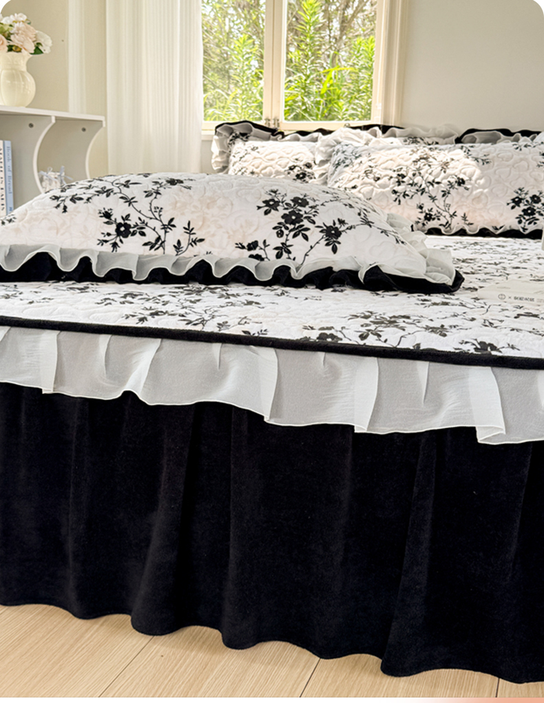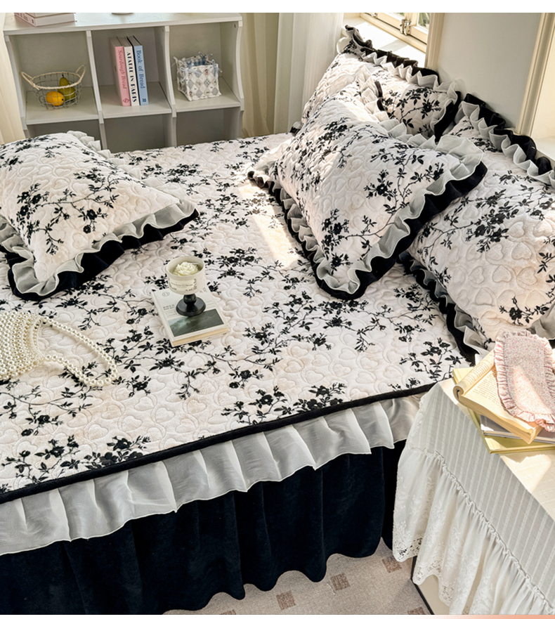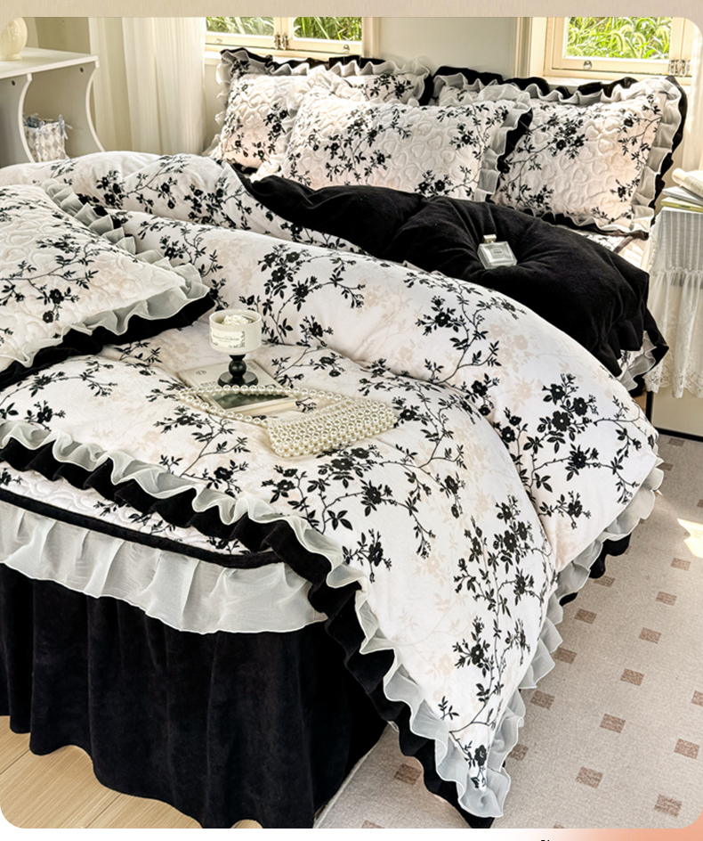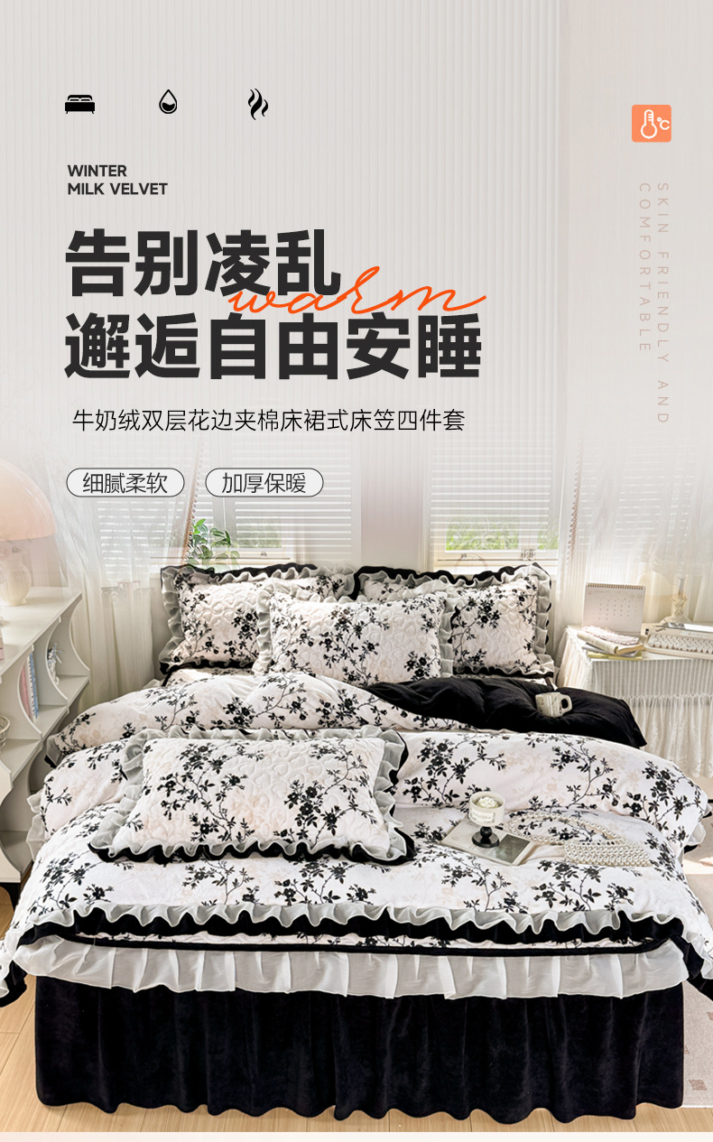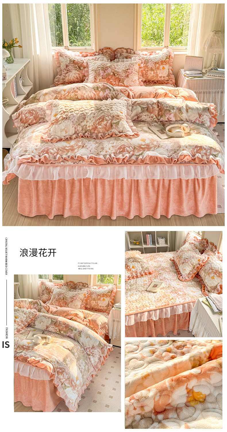 商品名称:禧缘家纺(原梦想家) 2025新款夹棉双层花边床笠牛奶绒系列四件套 步步生花