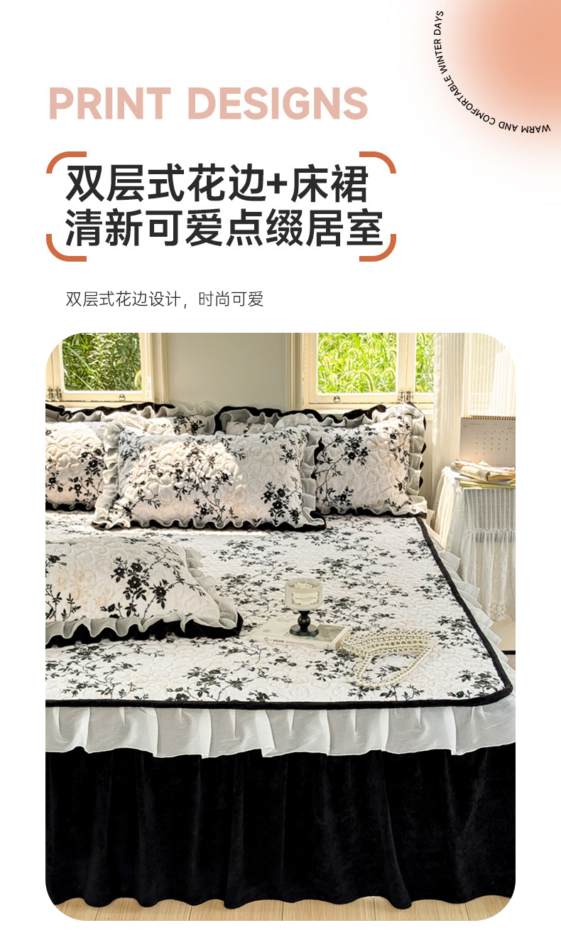 (总)禧缘家纺(原梦想家) 2025新款夹棉双层花边牛奶绒床笠三件套系列,布布乐园,步步生花,杏花微雨,雾都茶花,摩卡小镇,猫咪心事,浪漫花开,蓝铃风语,狗狗岛屿,落日云舒