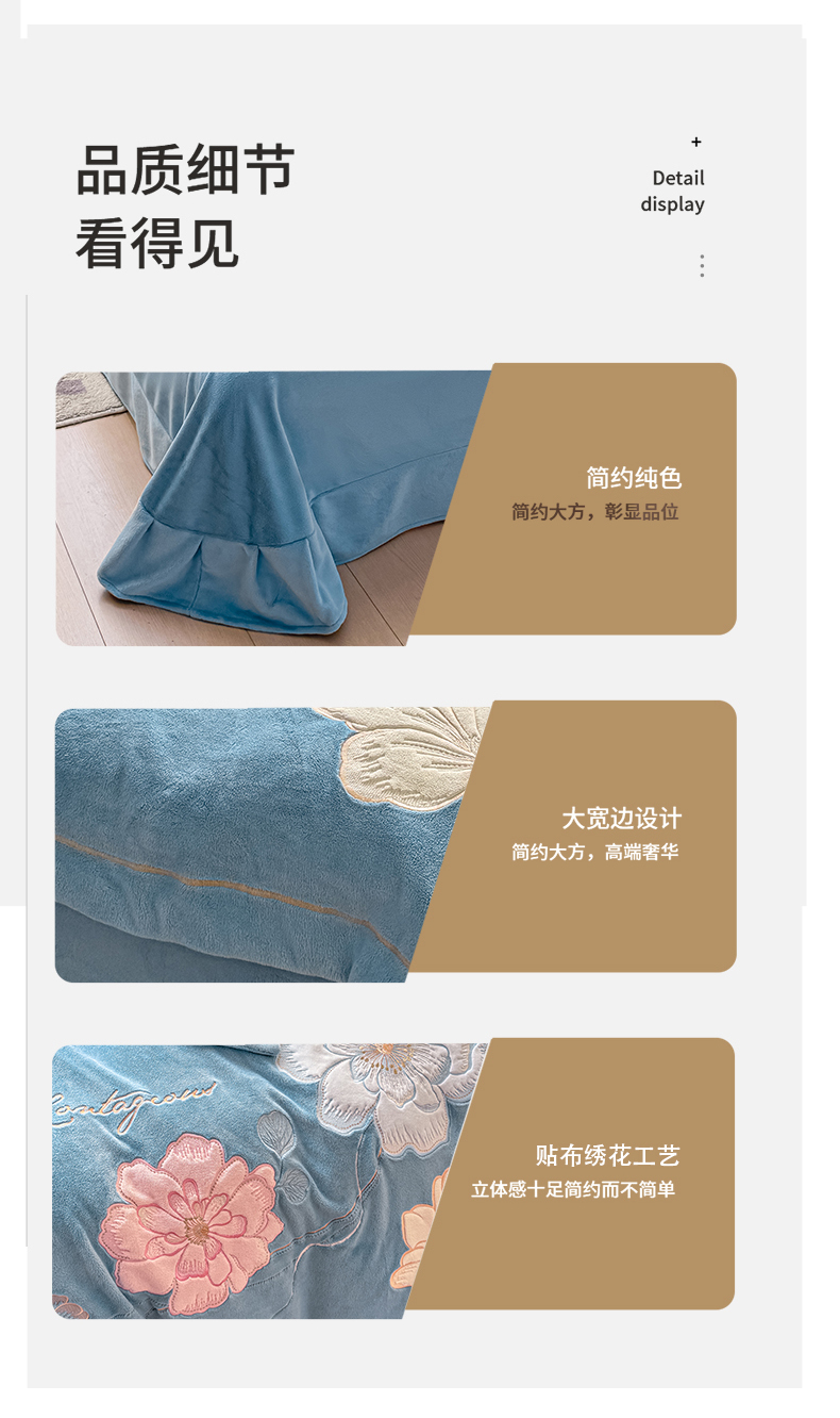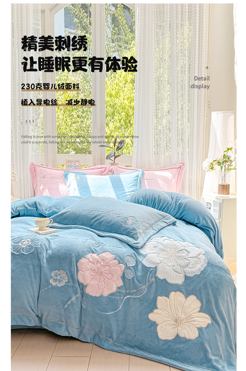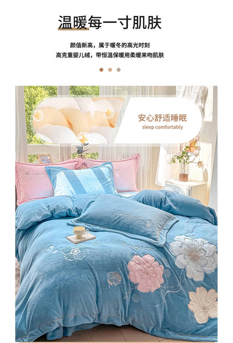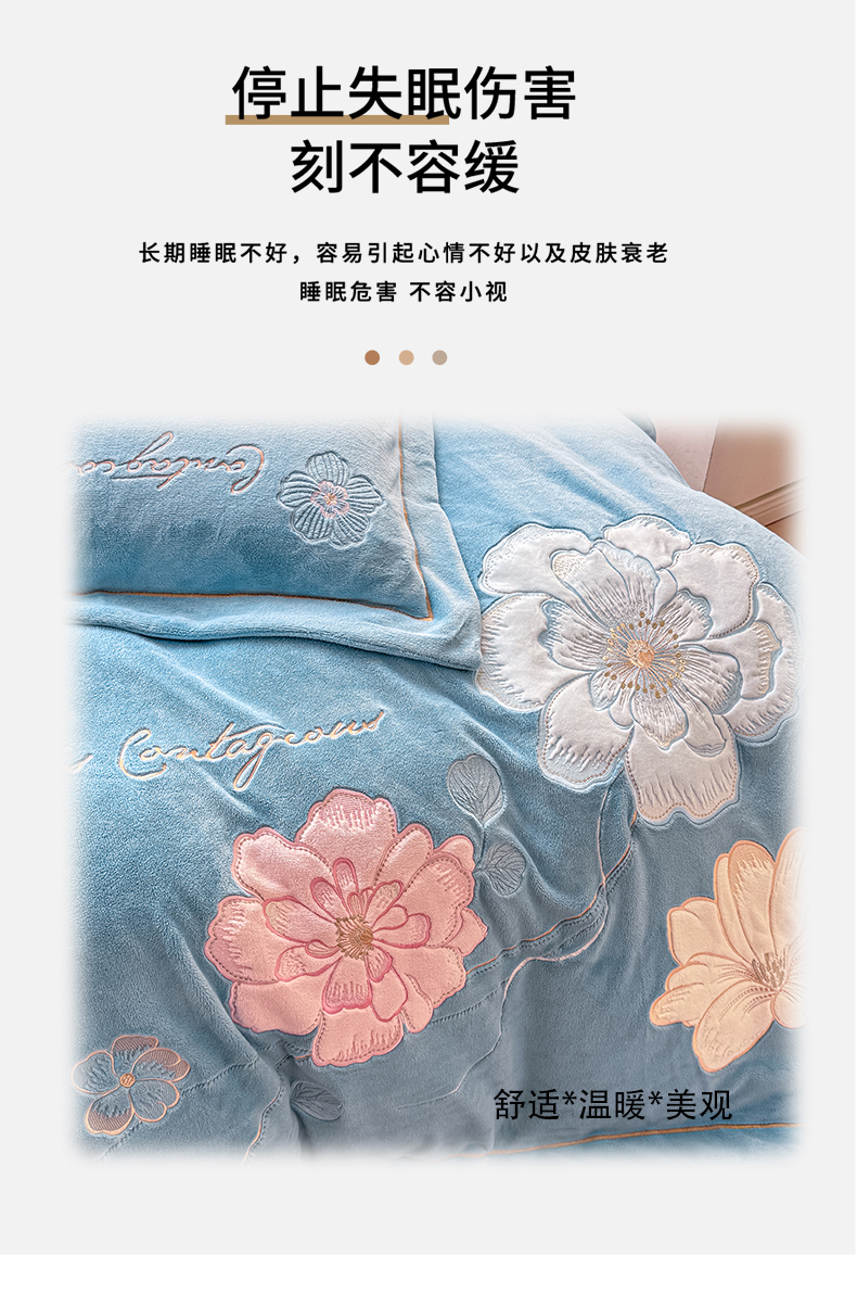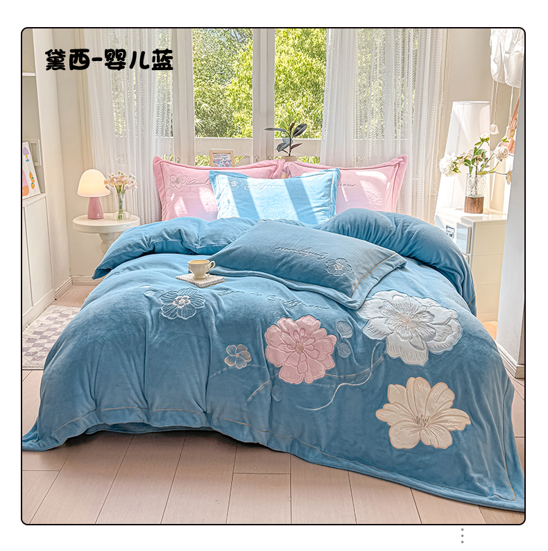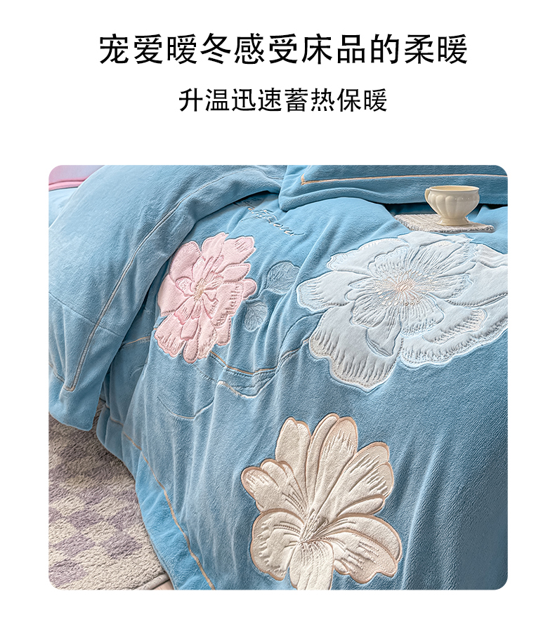 商品名称:悦织湾家纺 2025新款9斤重牛奶绒四件套纯色贴布绣人件富贵系列240克重高密保暖轻奢时尚床上用品4件套 黛西-婴儿蓝