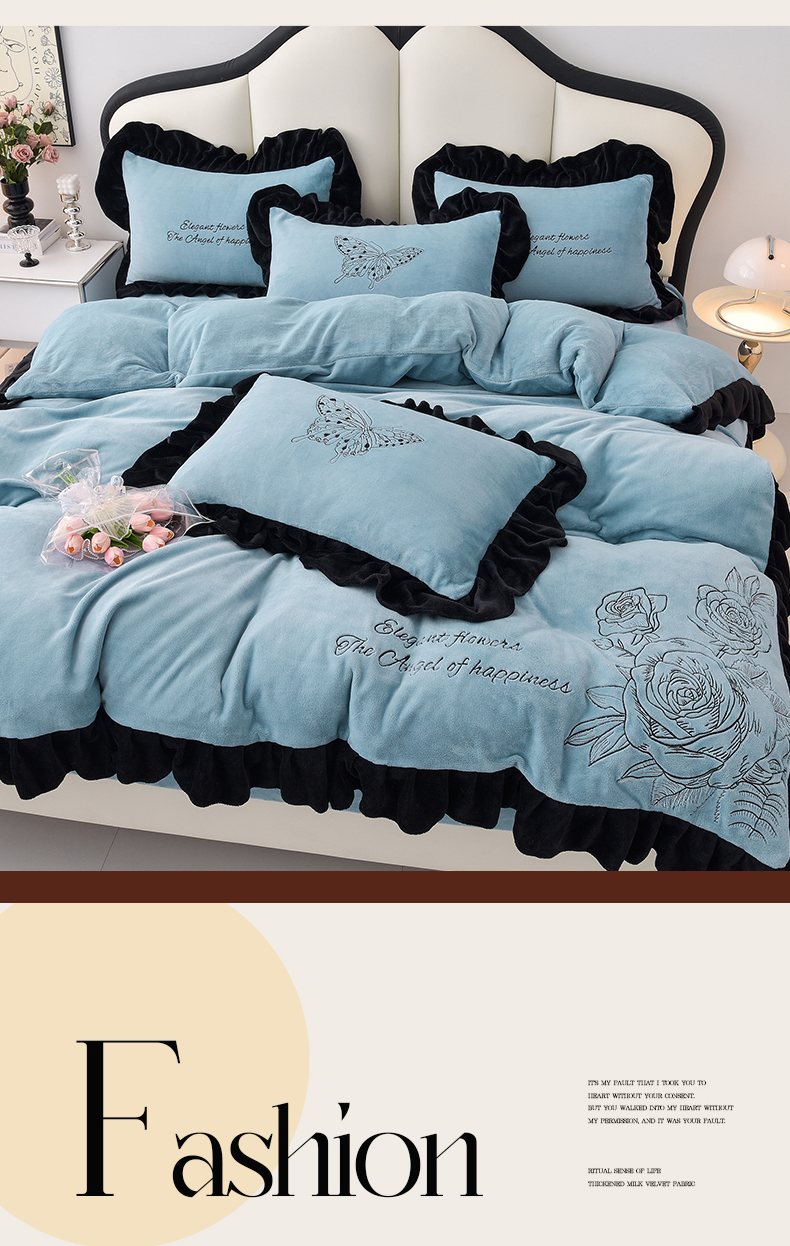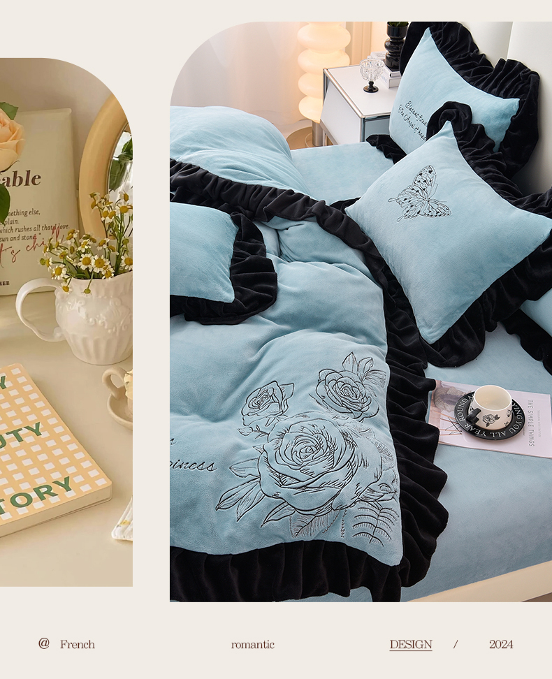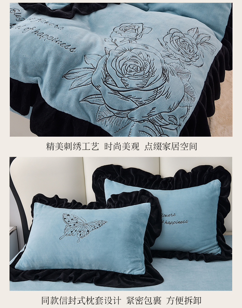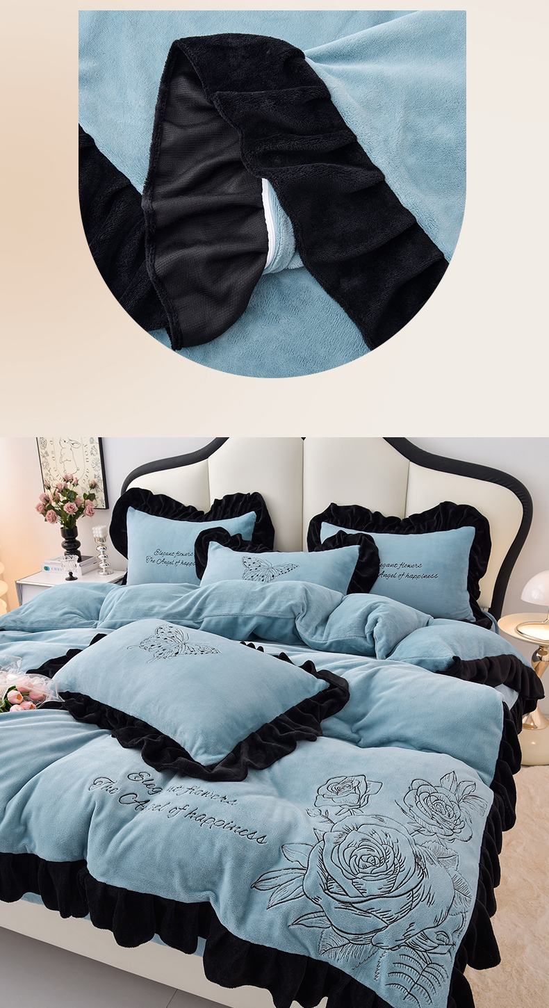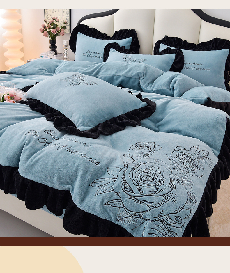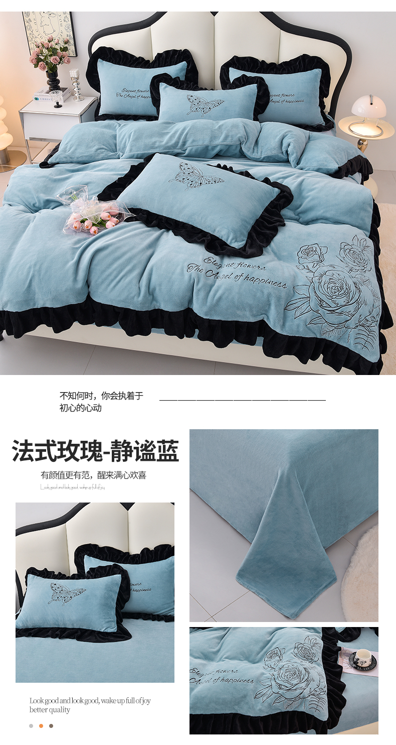 炫拼家纺 2025新款刺绣黑花边高克重牛奶绒四件套-法式玫瑰 法式玫瑰-静谧蓝