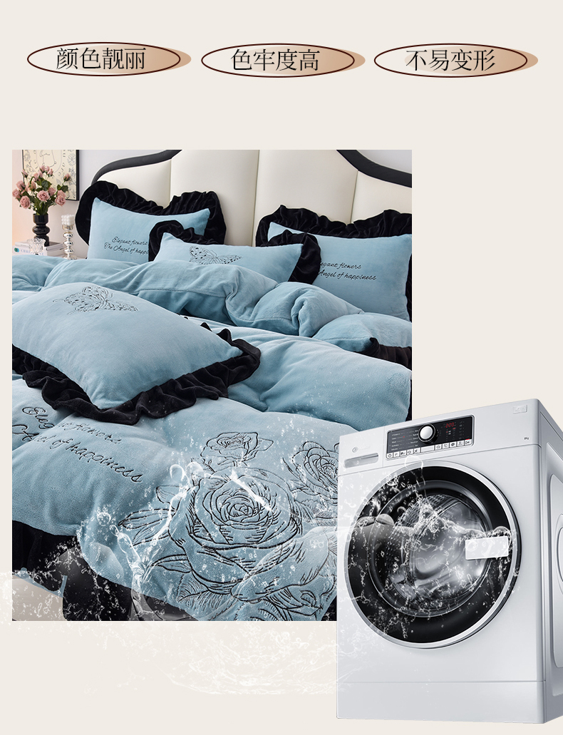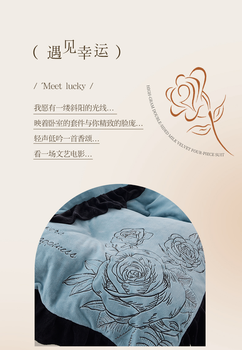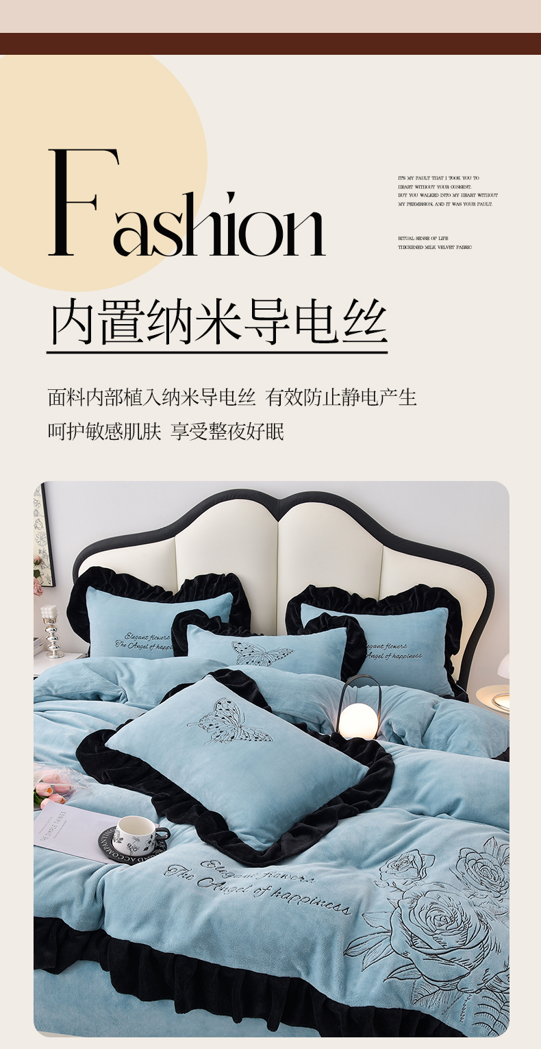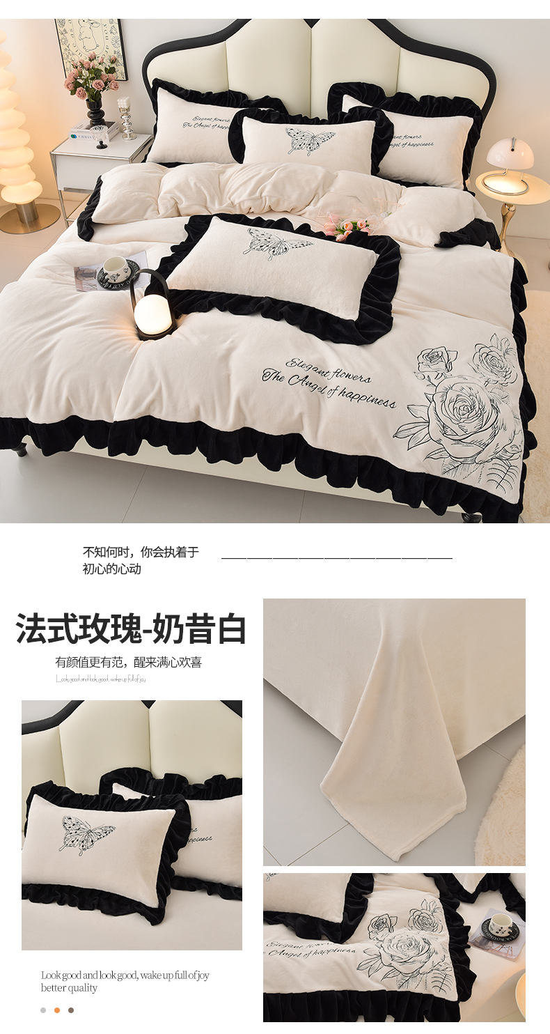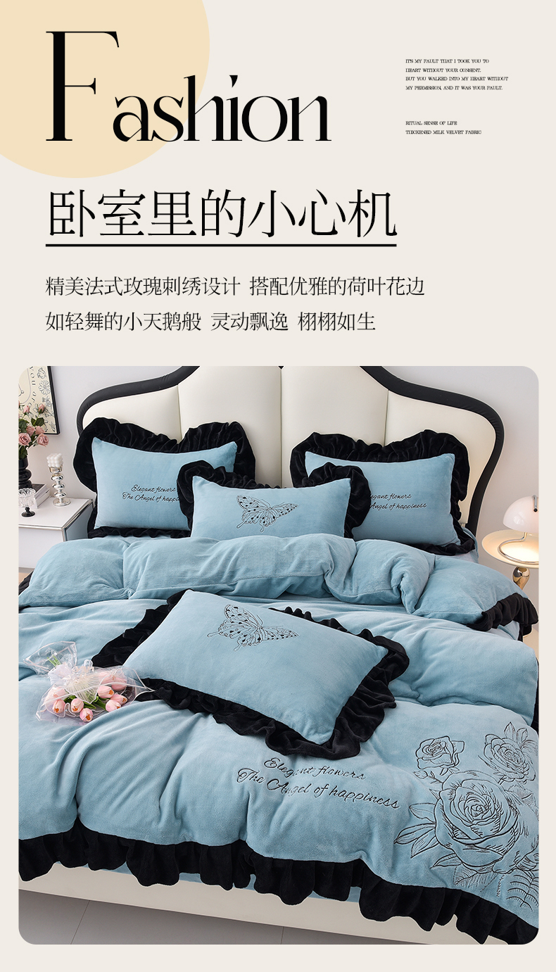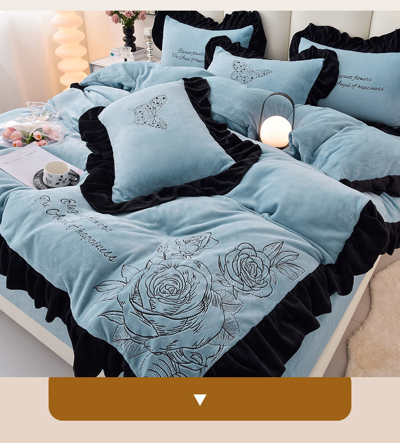 炫拼家纺 2025新款刺绣黑花边高克重牛奶绒四件套-法式玫瑰 法式玫瑰-静谧蓝