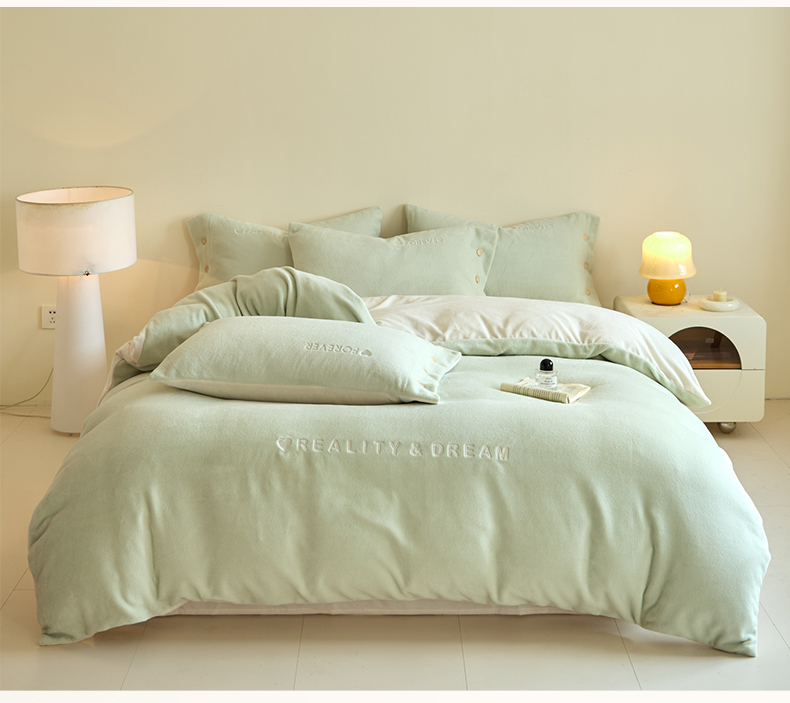 吾诺家居 2025新款刺绣款羊驼绒云朵系列四件套 浅绿-奶昔白