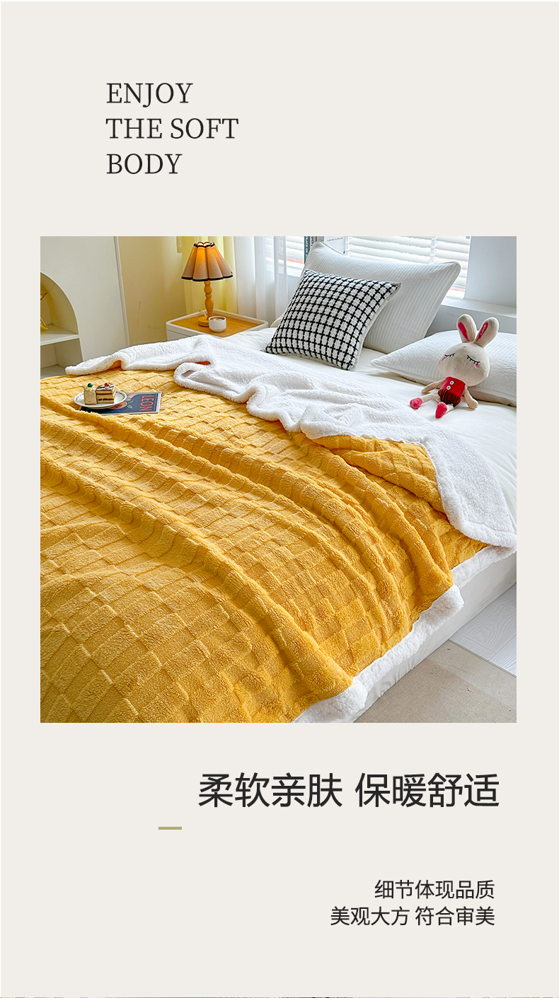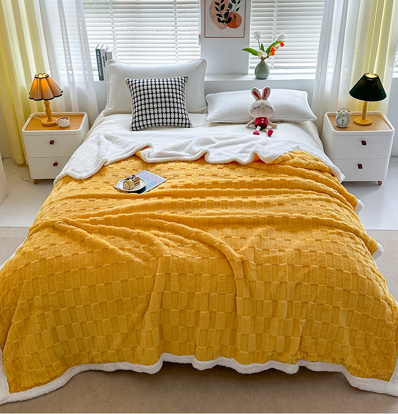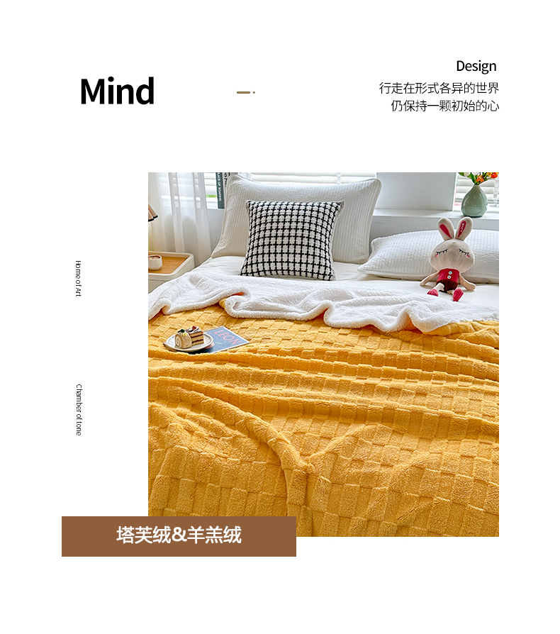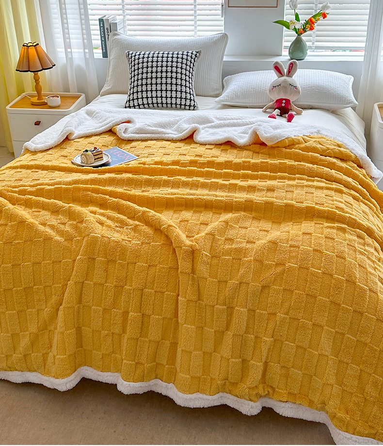悦织湾家纺 2025新款塔芙绒羊羔绒舒棉绒毛毯方格系列 方格杏黄