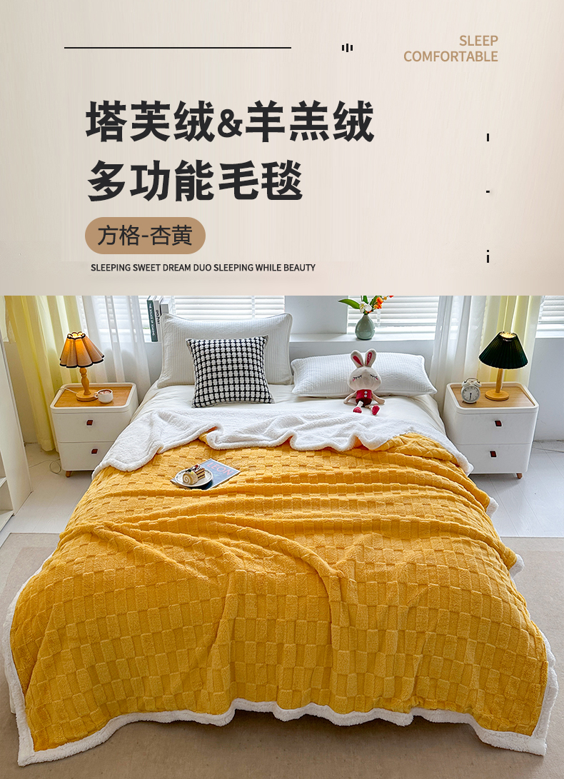 商品名称:悦织湾家纺 2025新款塔芙绒羊羔绒舒棉绒毛毯方格系列 方格杏黄