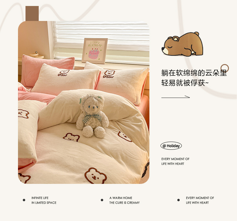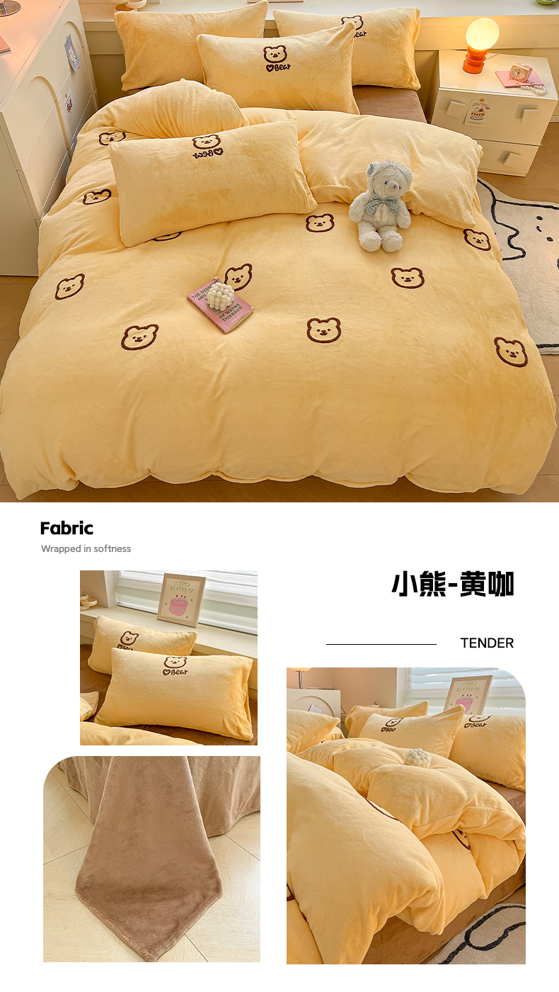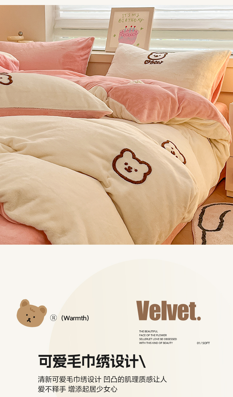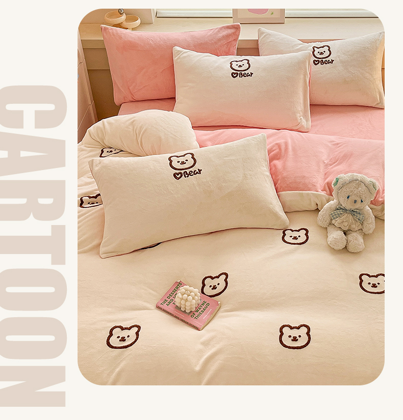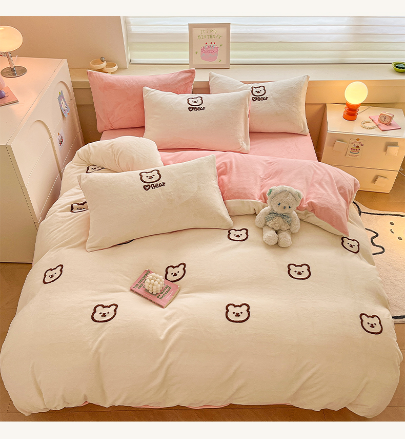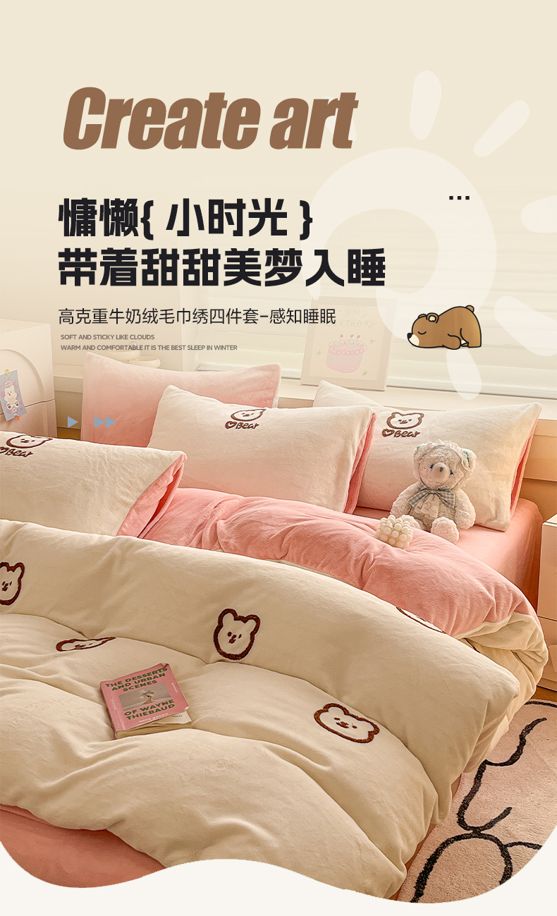 商品名称:雅居纺家纺 2025新款高克重牛奶绒毛巾绣四件套-小熊系列 小熊-白粉