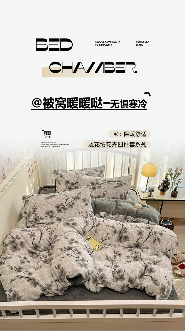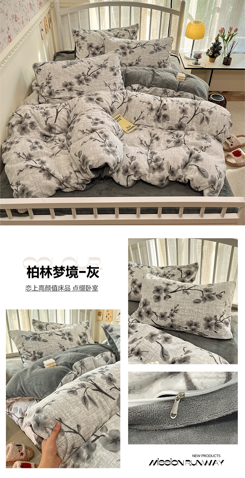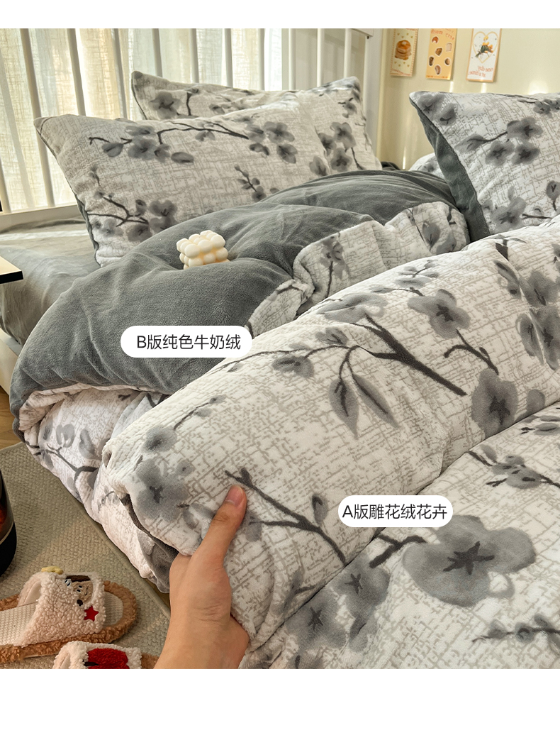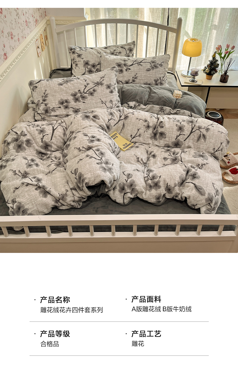 雅居纺家纺 2025新款花卉雕花绒加厚保暖四件套 柏林梦境-灰