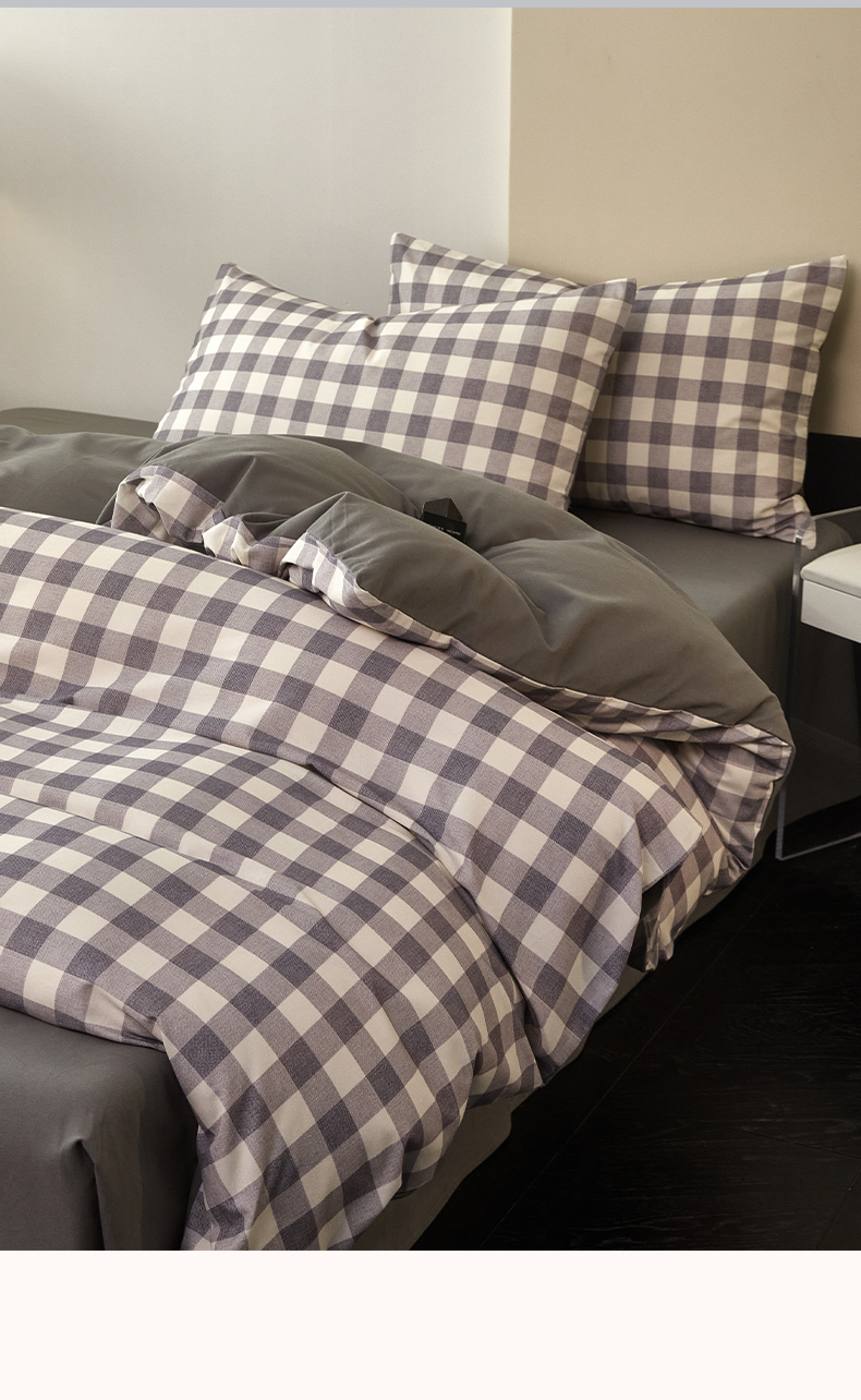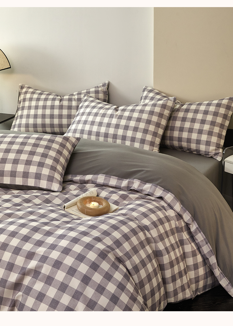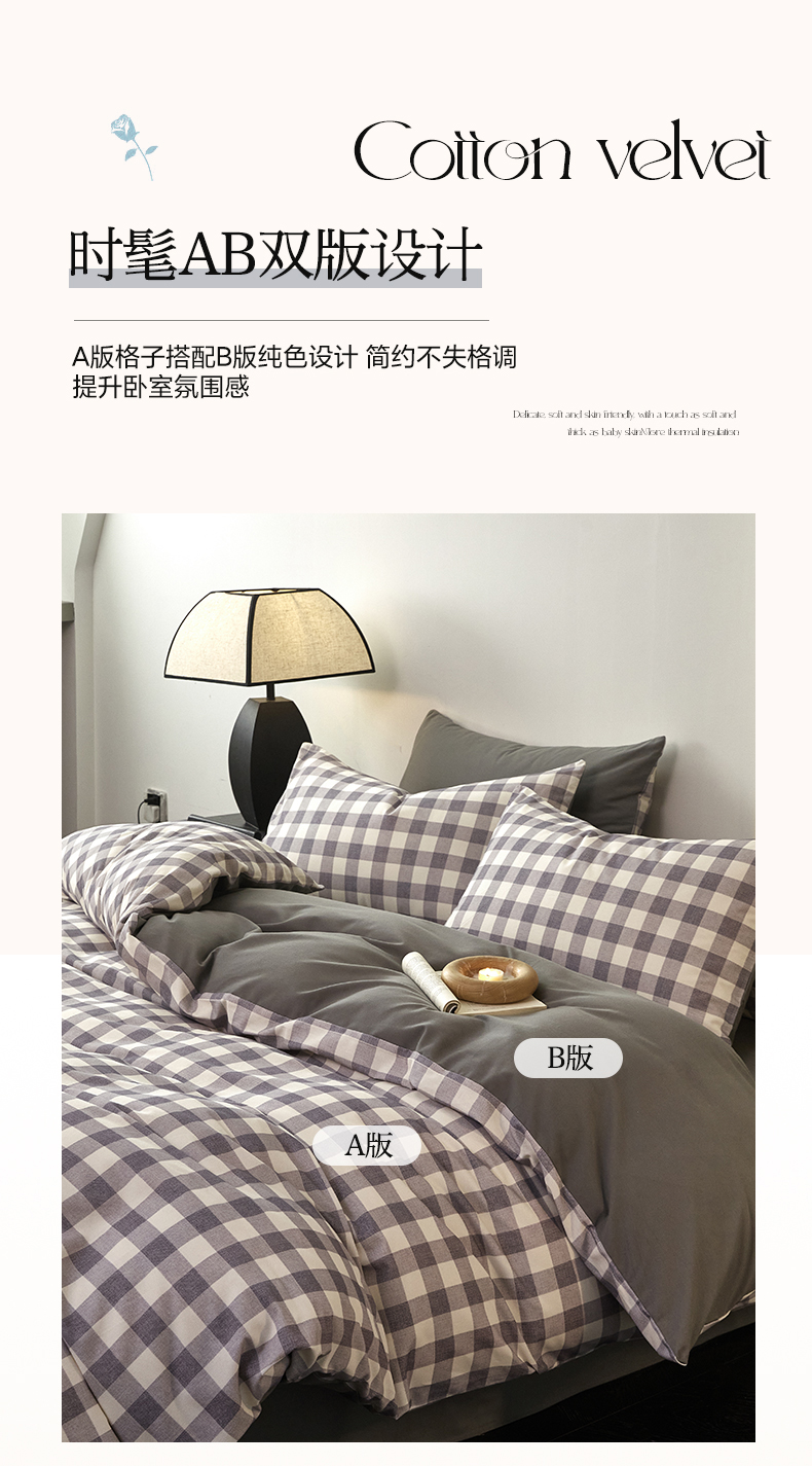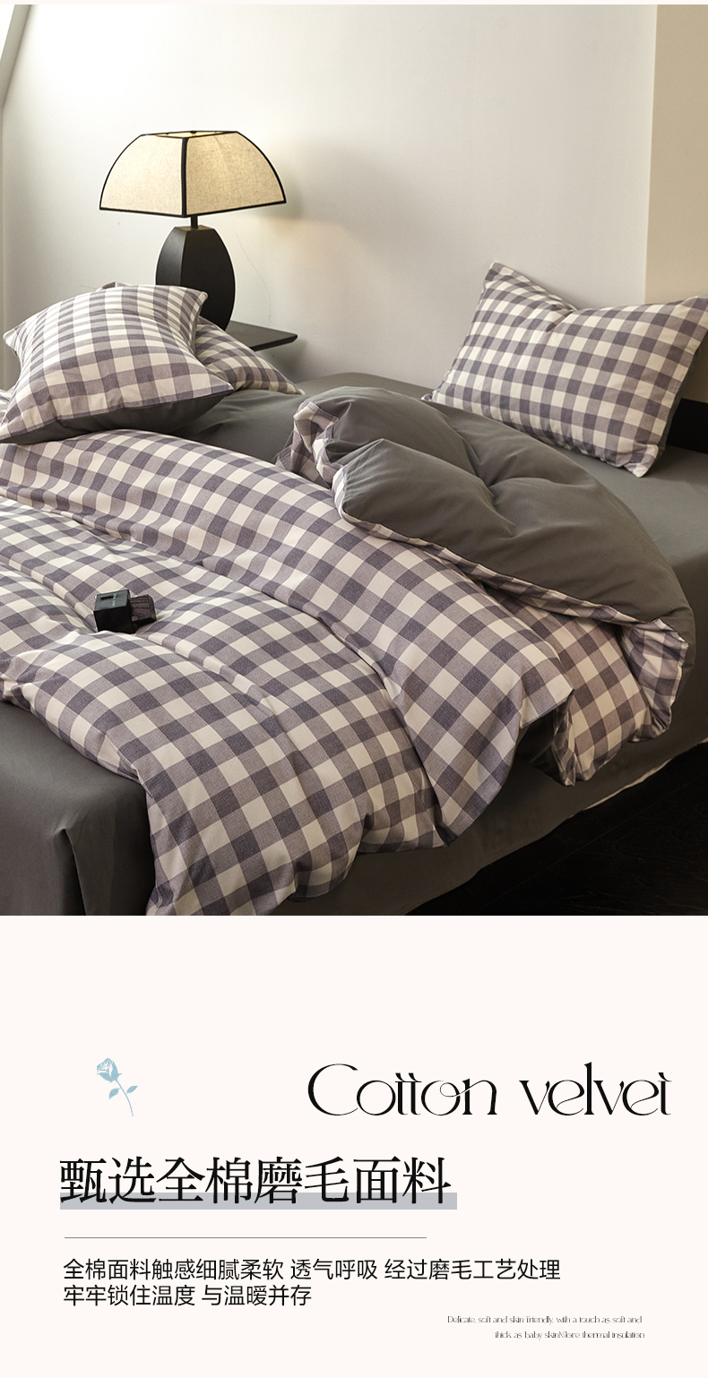 雅居纺家纺 2025新款简约款全棉磨毛四件套 小格灰