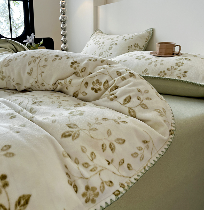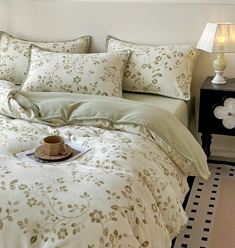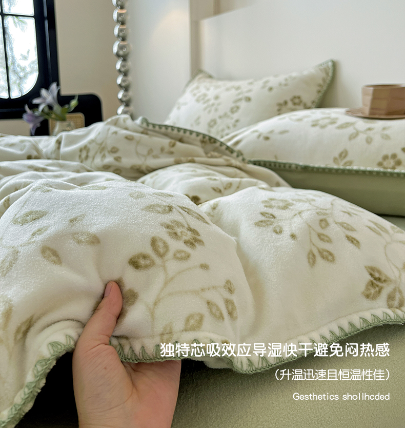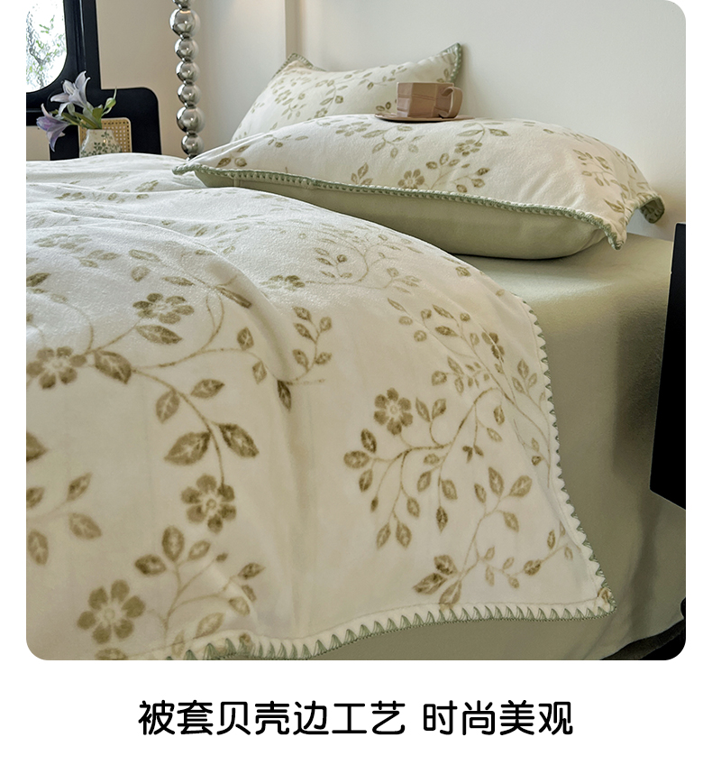 商品名称:品乐家纺 2025秋冬新款糯米绒缇肤绒印花贝壳边四件套 南笙-绿