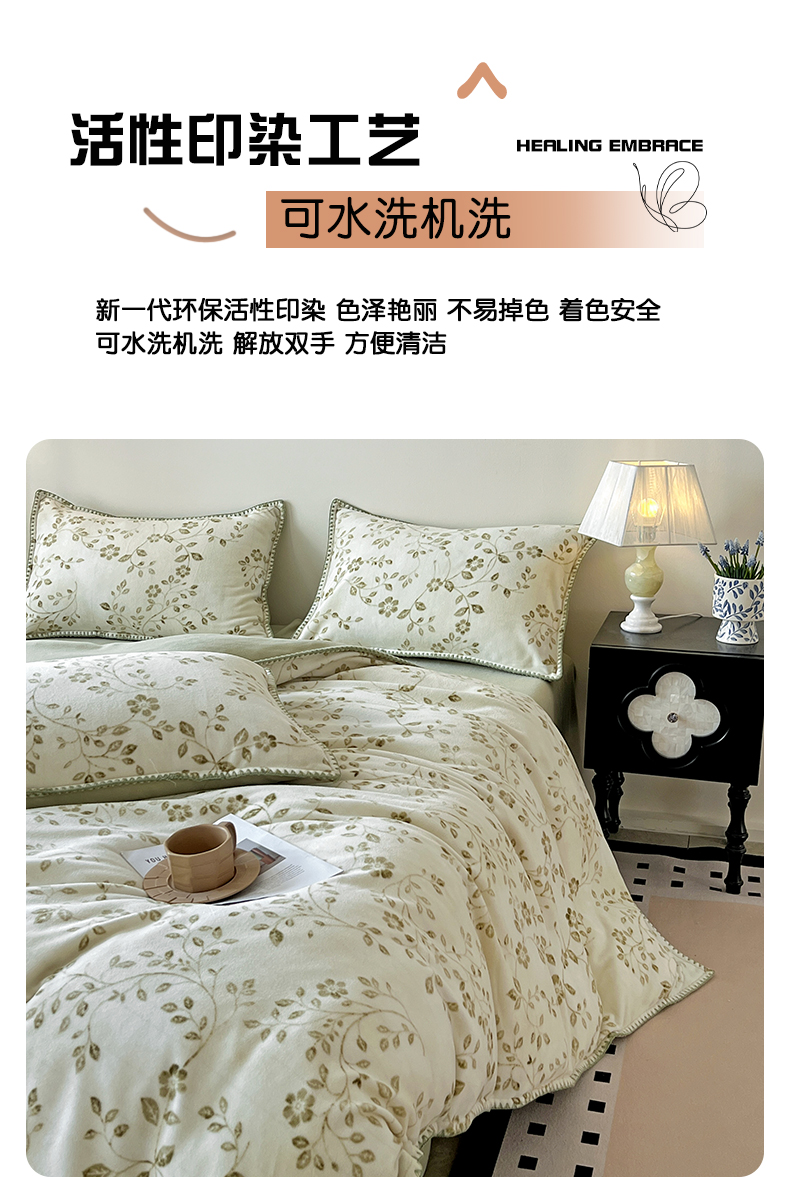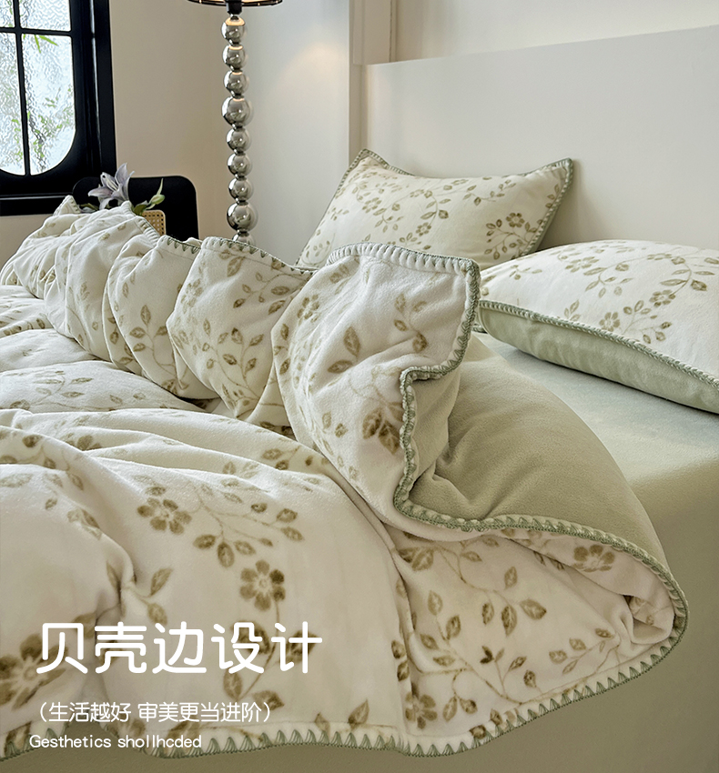品乐家纺 2025秋冬新款糯米绒缇肤绒印花贝壳边四件套 南笙-绿