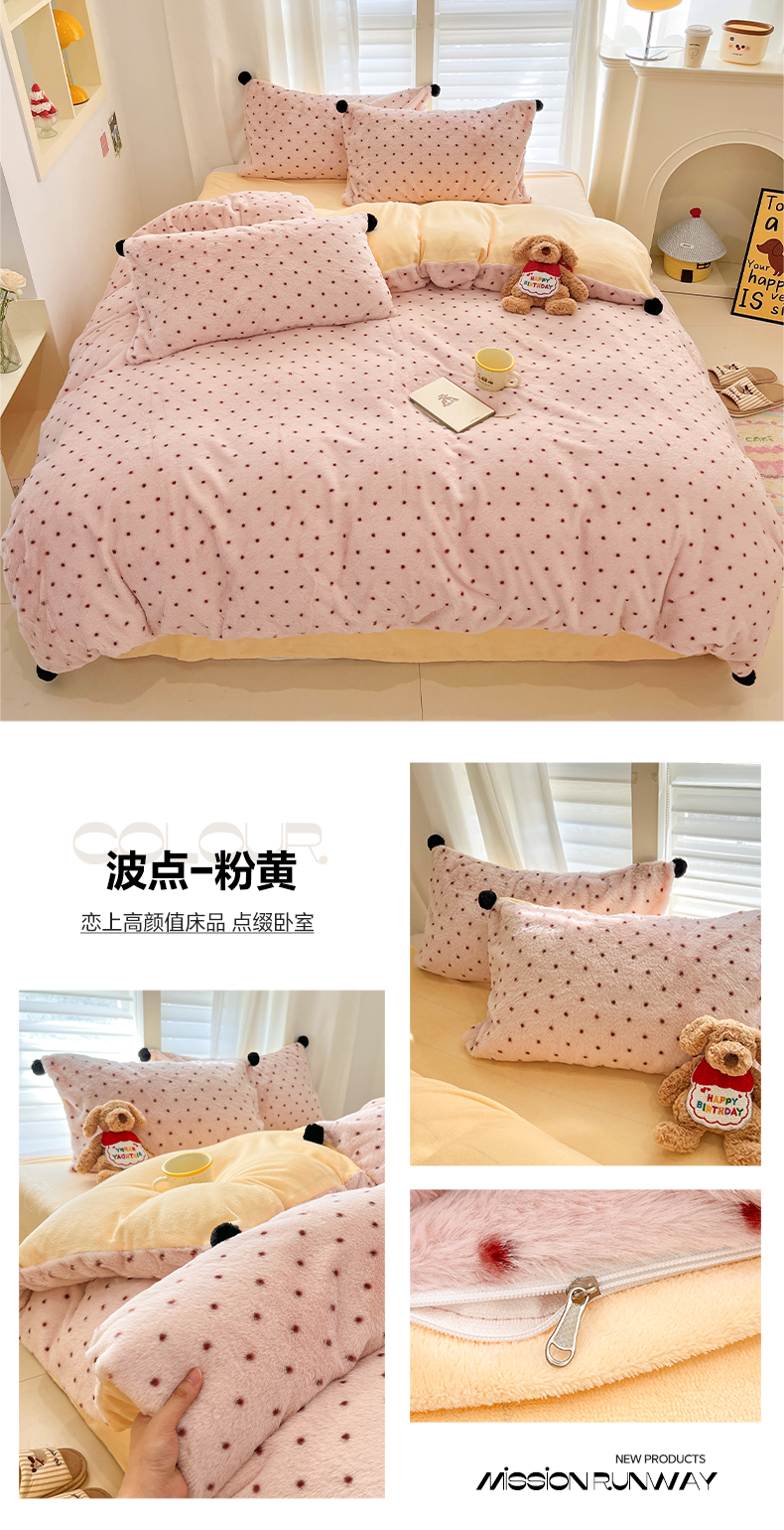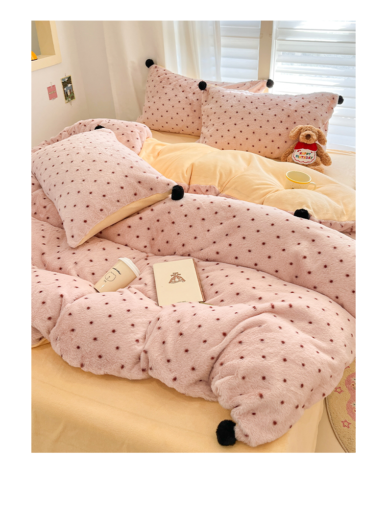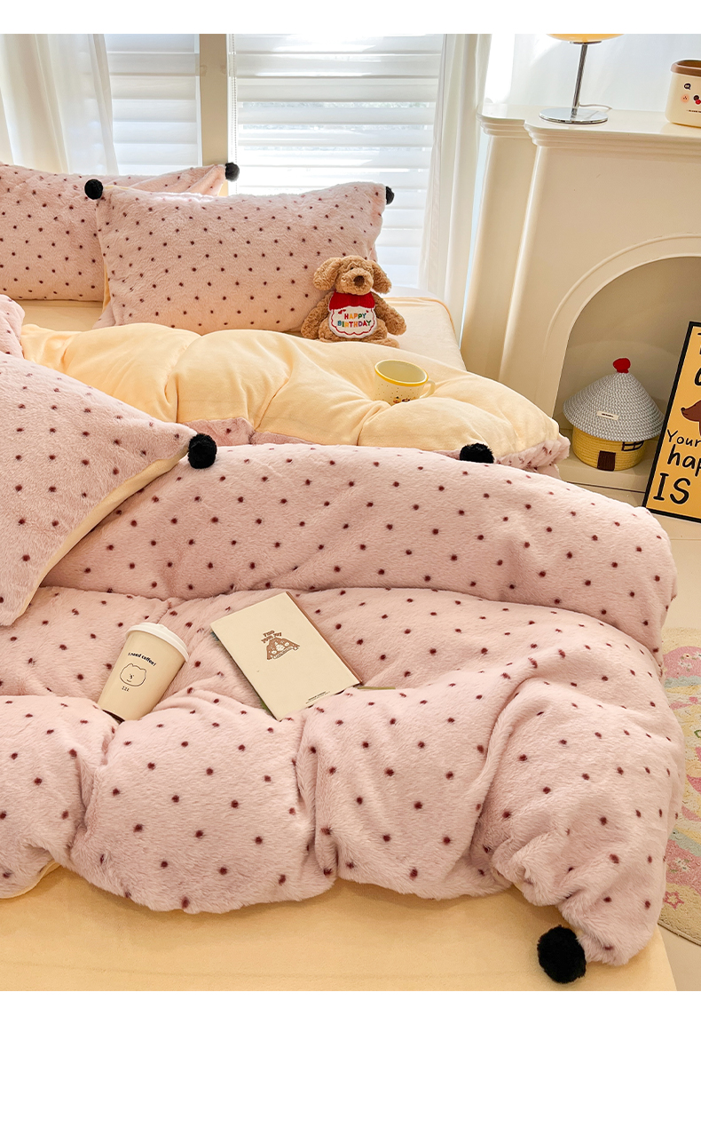 雅居纺家纺 2025新款简约兔绒球球保暖舒适四件套-波点 波点-粉黄