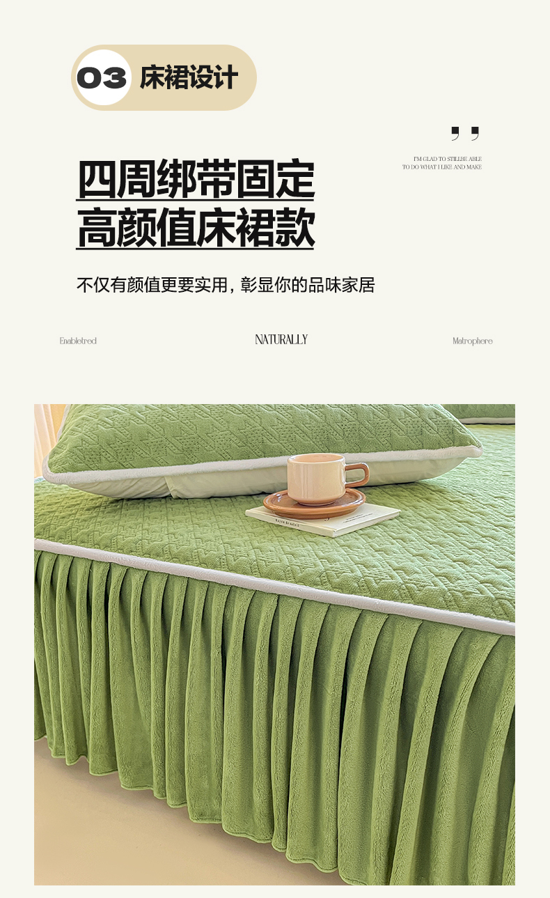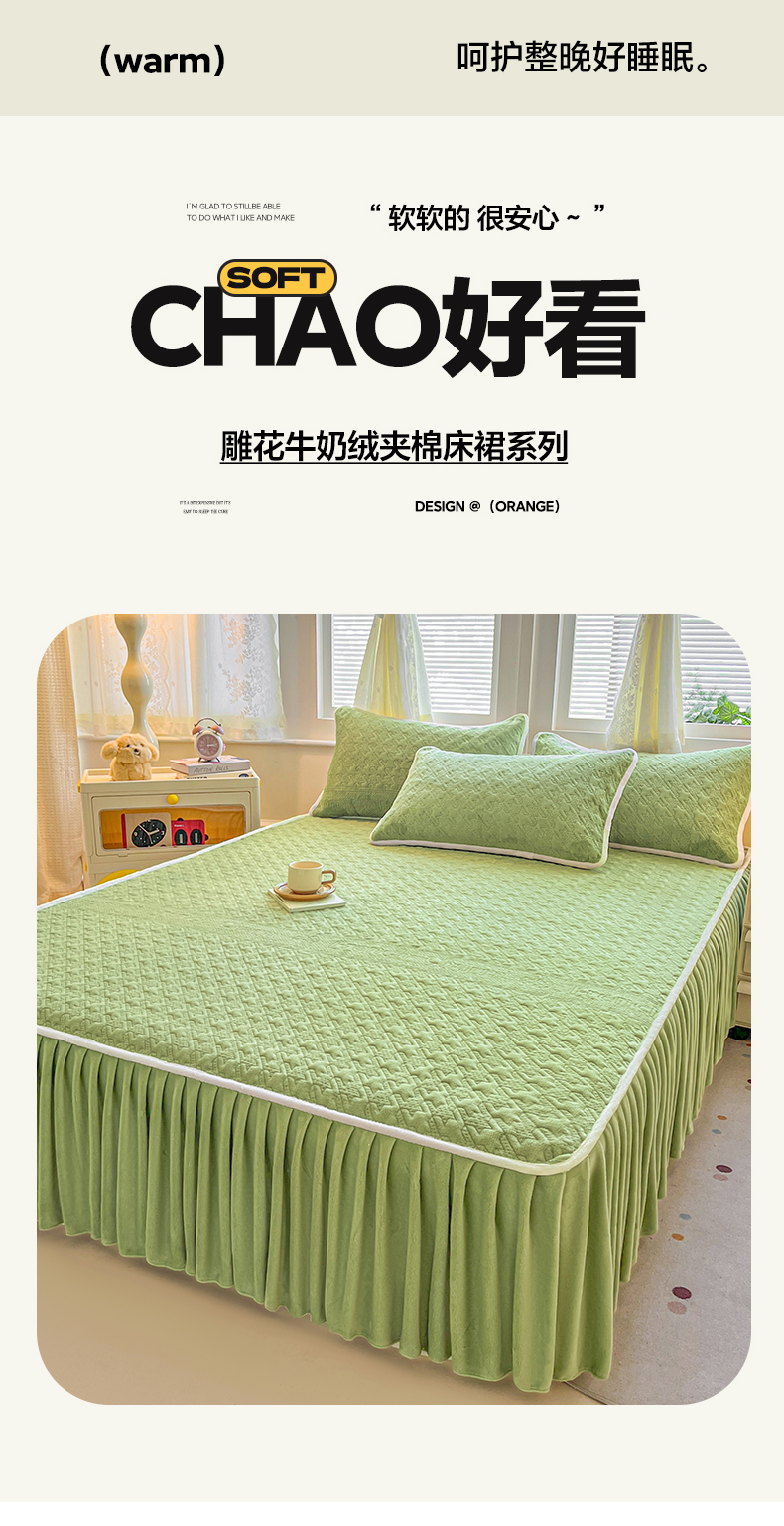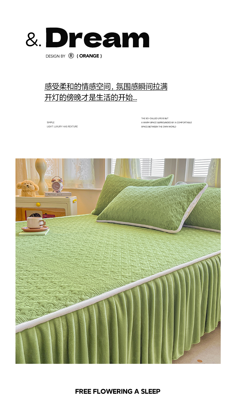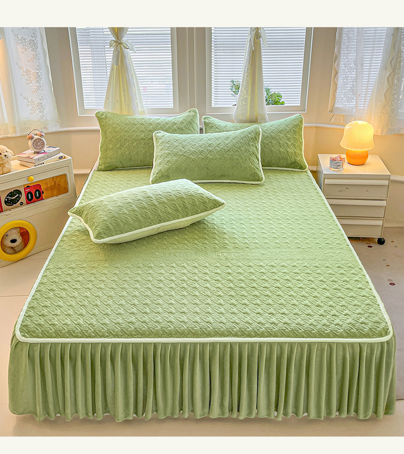 卡伦家纺 2025新款抗菌雕花牛奶绒千鸟格夹棉床裙系列 千鸟格床笠-绿