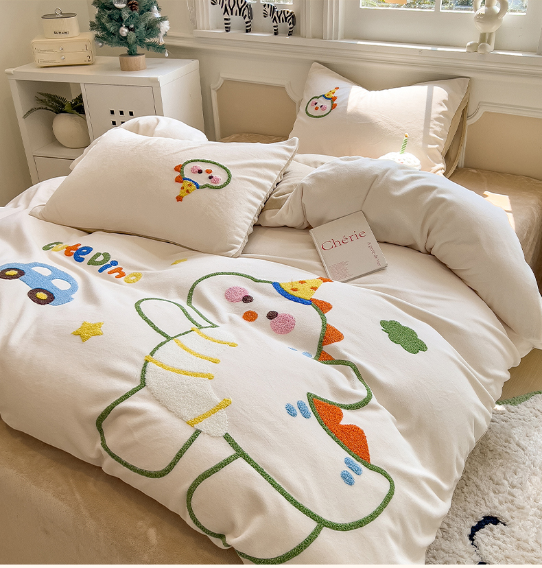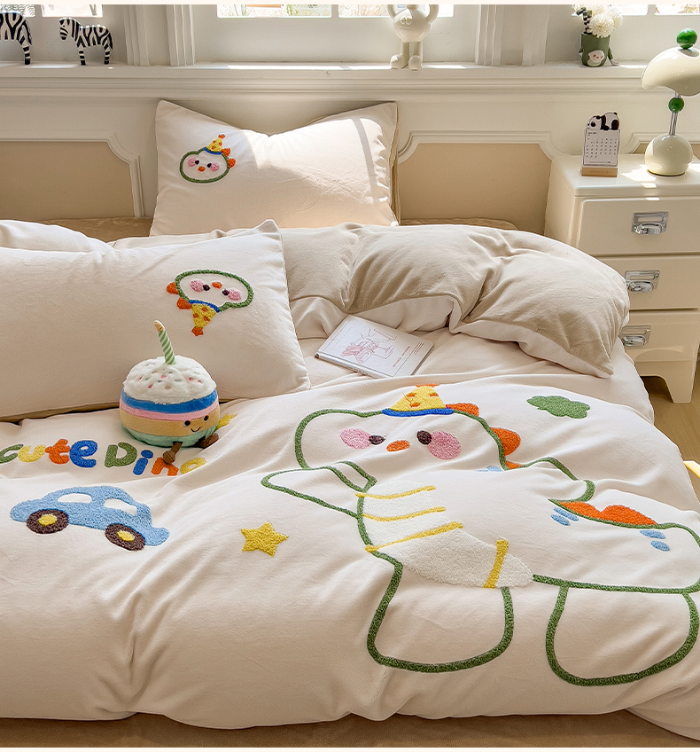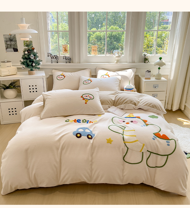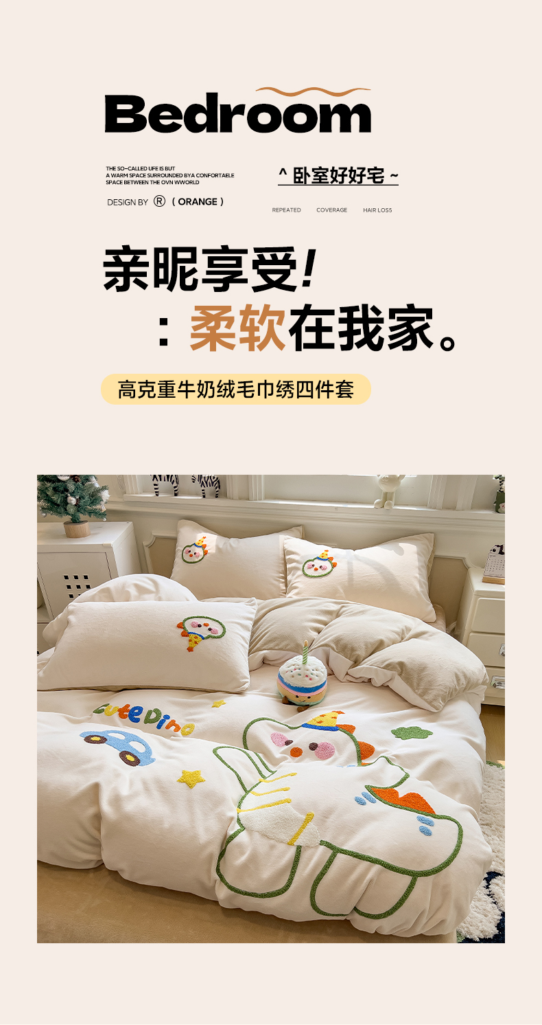 当前位置: 91家纺网 > 商品网购 > 床品套件 > 四件套 > 牛奶绒四件套 > 悦织语 2025新款加厚200克高克重毛巾绣牛奶绒四件套 派对恐龙-米白