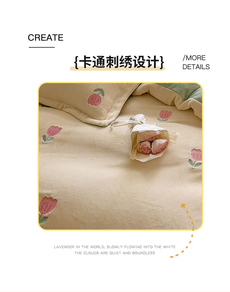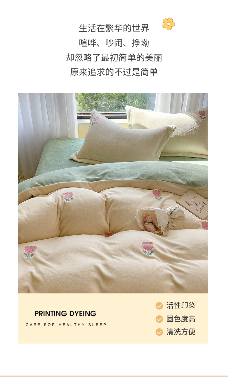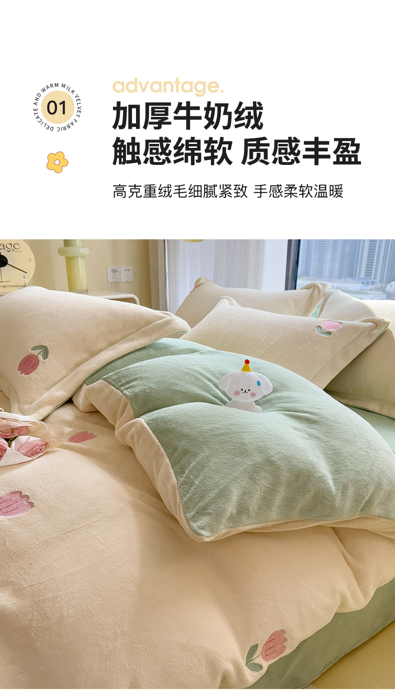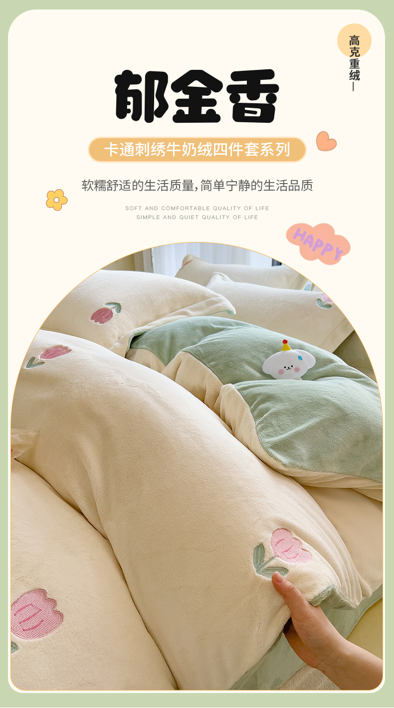 商品名称:丽美人家纺 2025新款牛奶绒卡通刺绣系列四件套 郁金香-绿