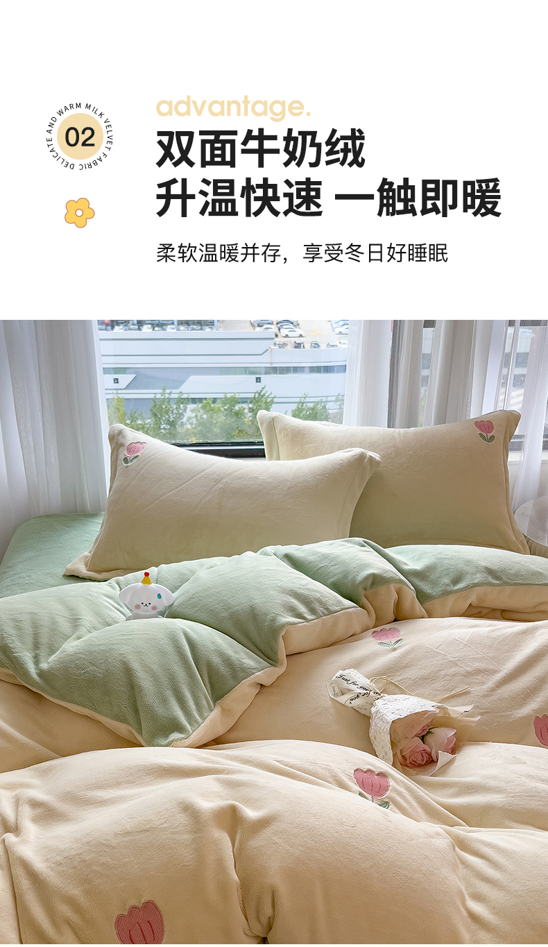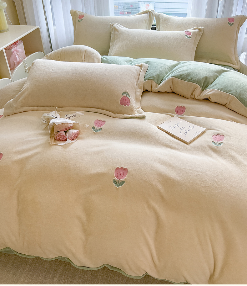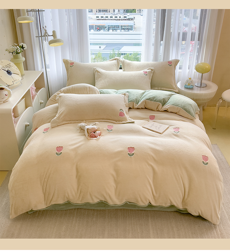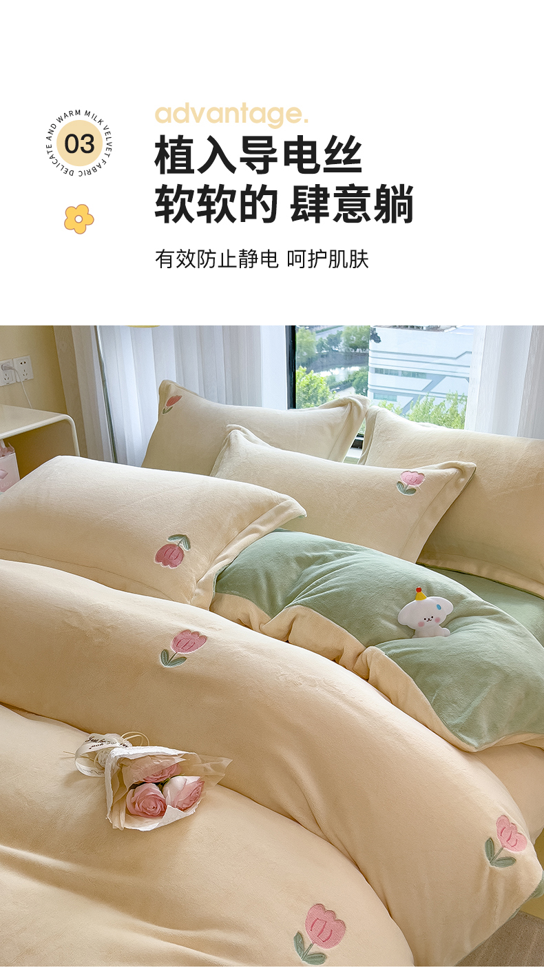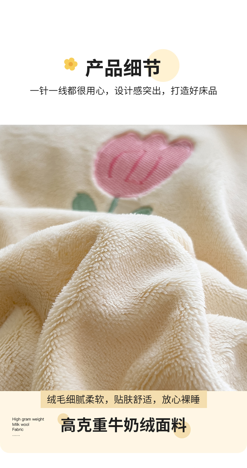商品名称:丽美人家纺 2025新款牛奶绒卡通刺绣系列四件套 郁金香-绿